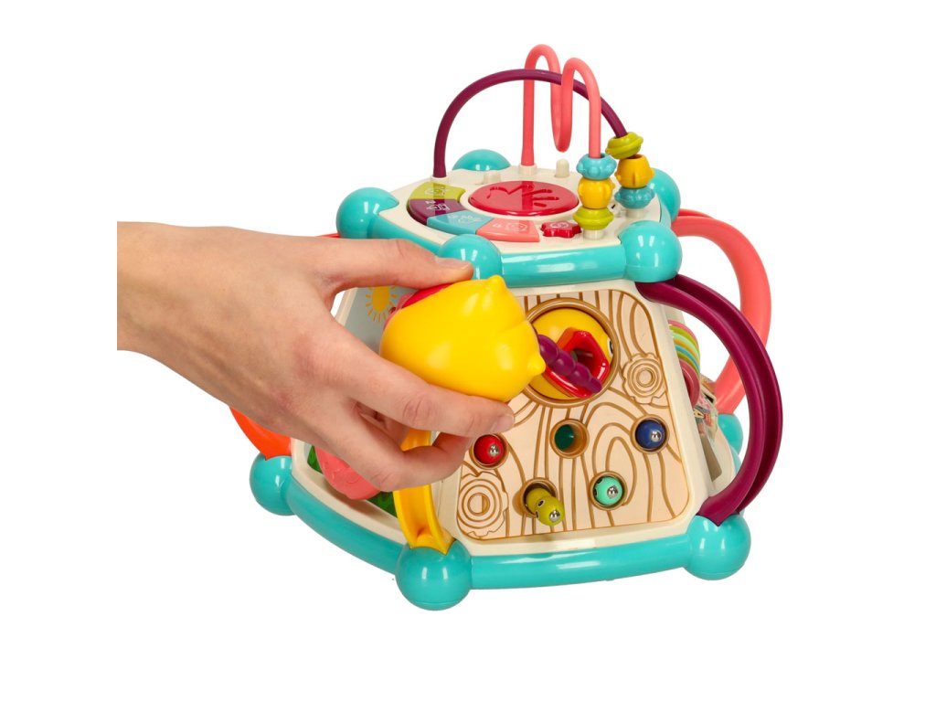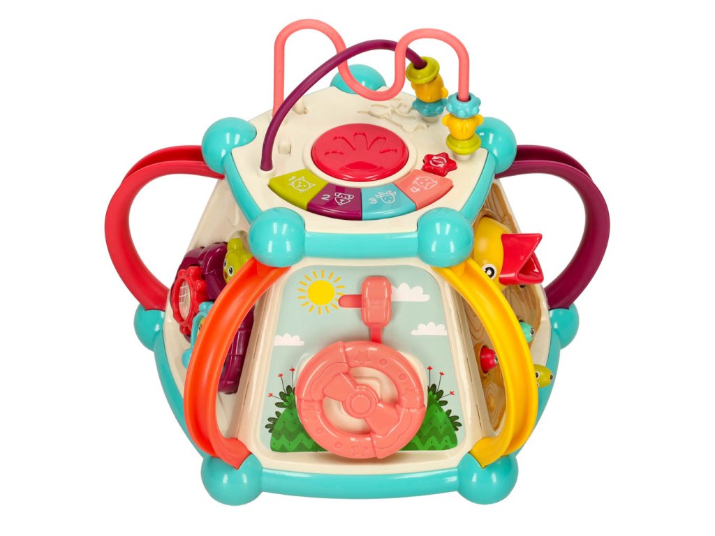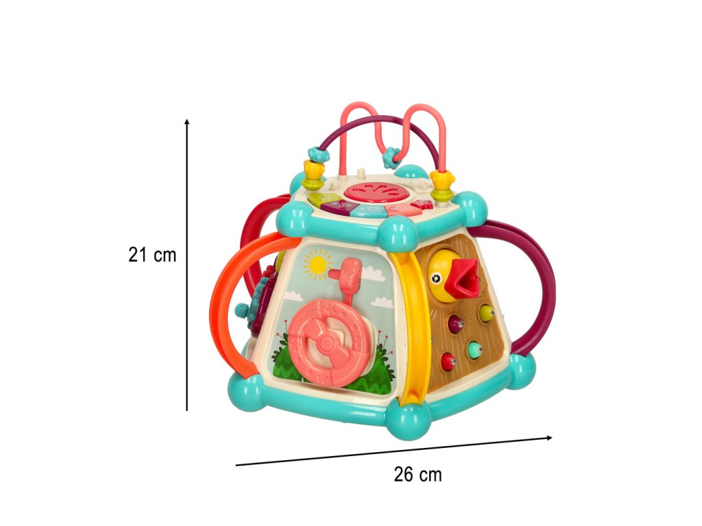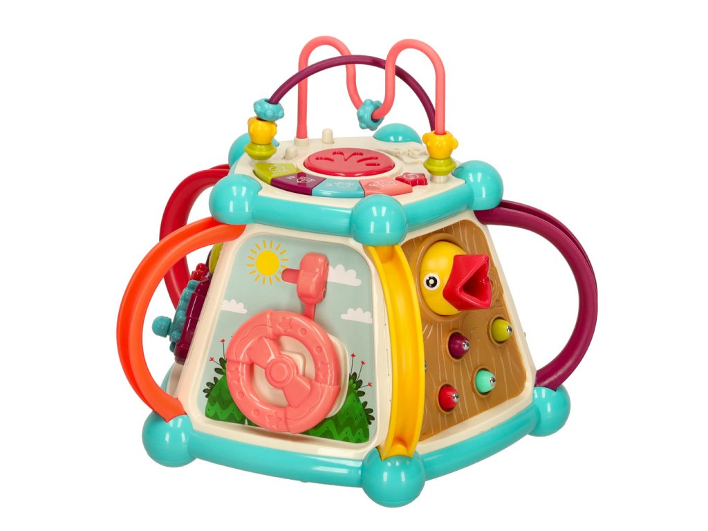 Každá strana kocky ukrýva nový prvok, ktorý treba objaviť. Rôzne textúry, farby, tvary a spôsoby interakcie s prvkami stimulujú zmysly dieťaťa a rozvíjajú jeho zvedavosť o svete. Hračka tiež poskytuje vynikajúcu príležitosť na učenie sa farieb a čísel.
