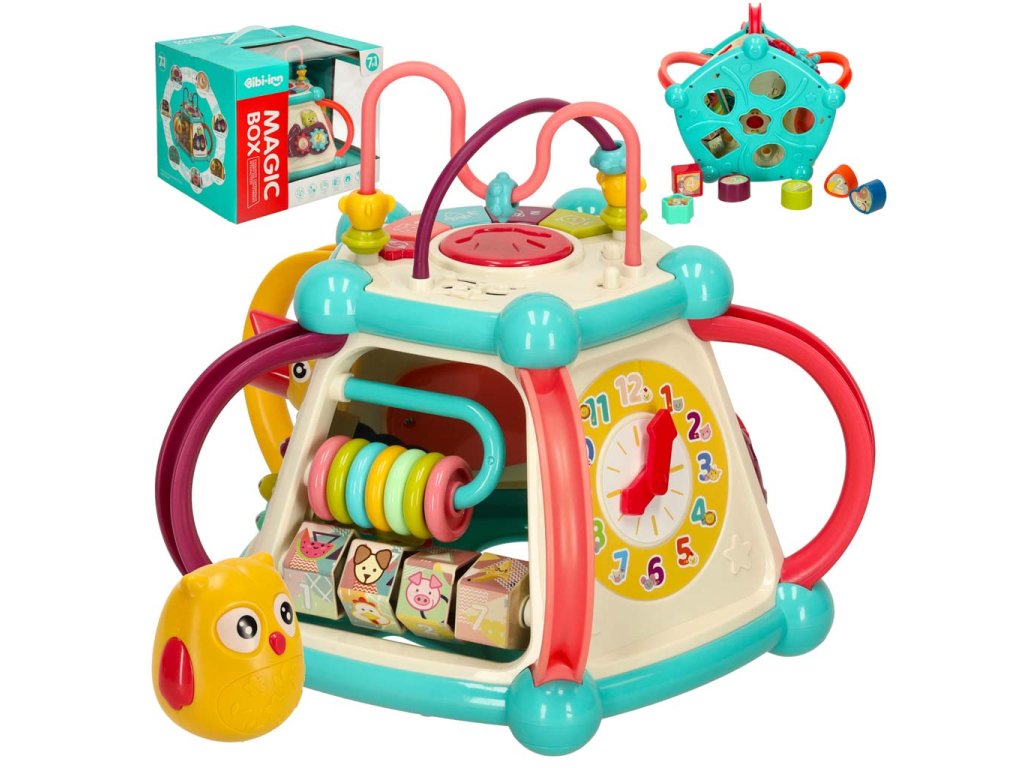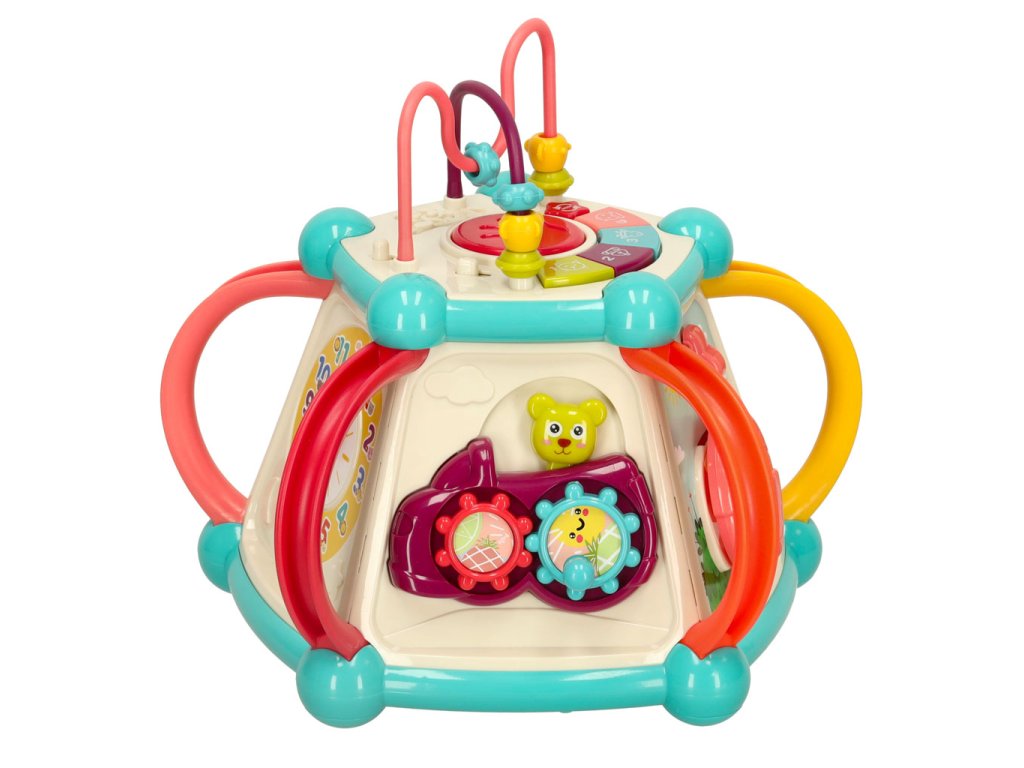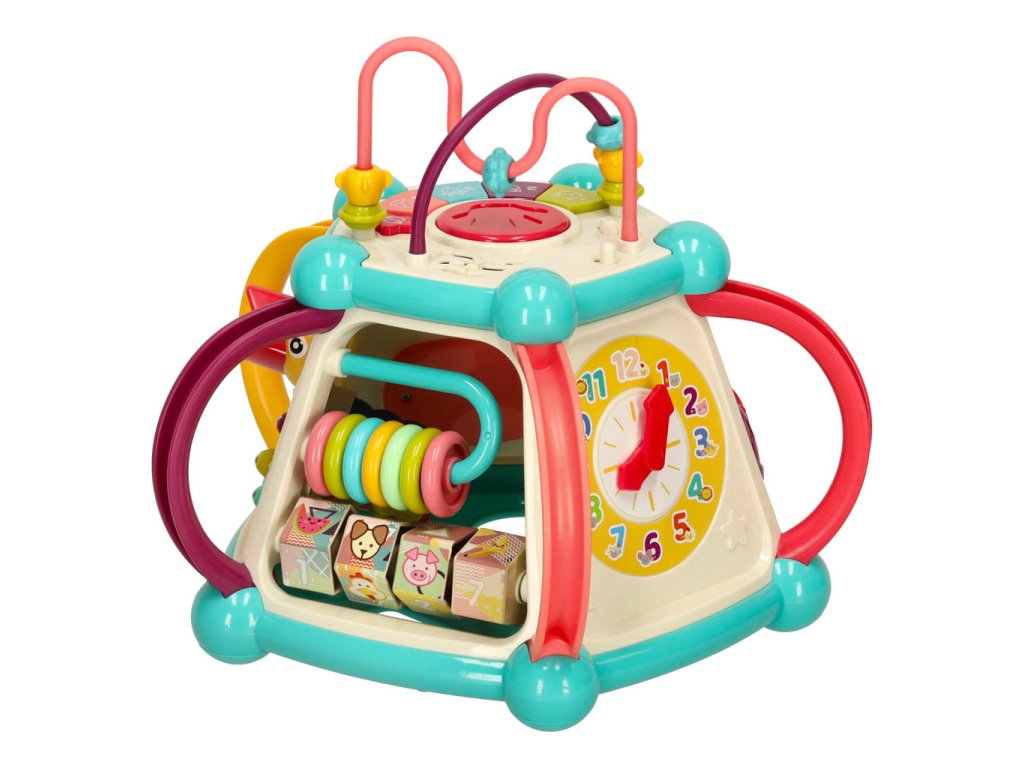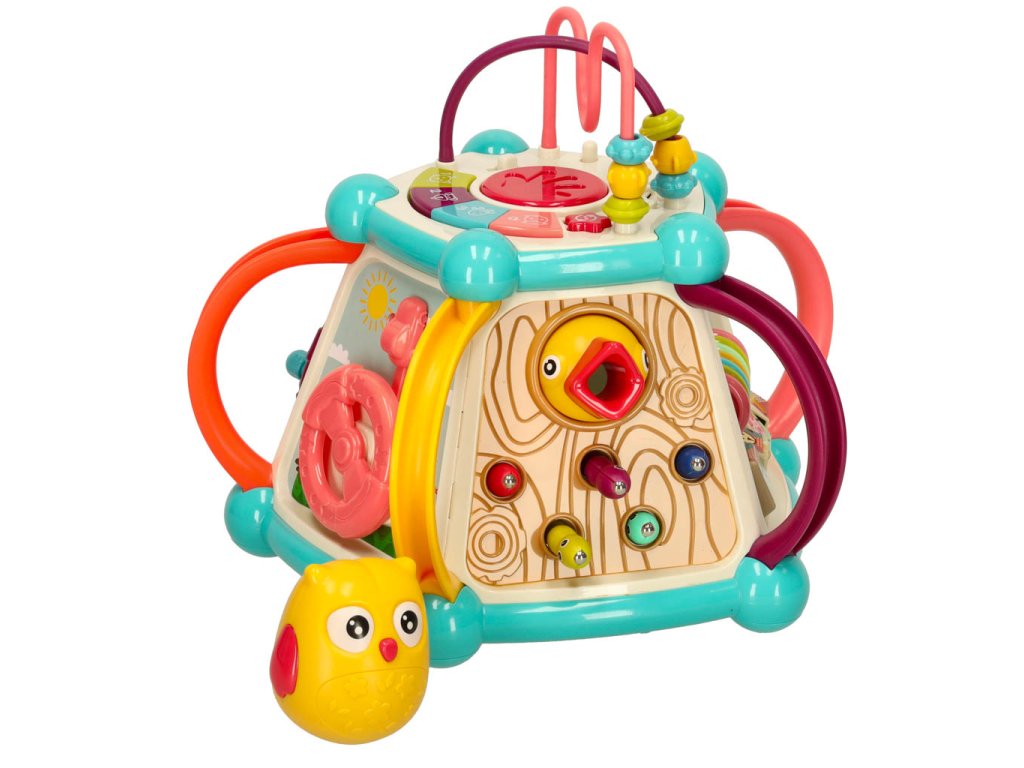 Každá strana kocky ukrýva nový prvok, ktorý treba objaviť. Rôzne textúry, farby, tvary a spôsoby interakcie s prvkami stimulujú zmysly dieťaťa a rozvíjajú jeho zvedavosť o svete. Hračka tiež poskytuje vynikajúcu príležitosť na učenie sa farieb a čísel.