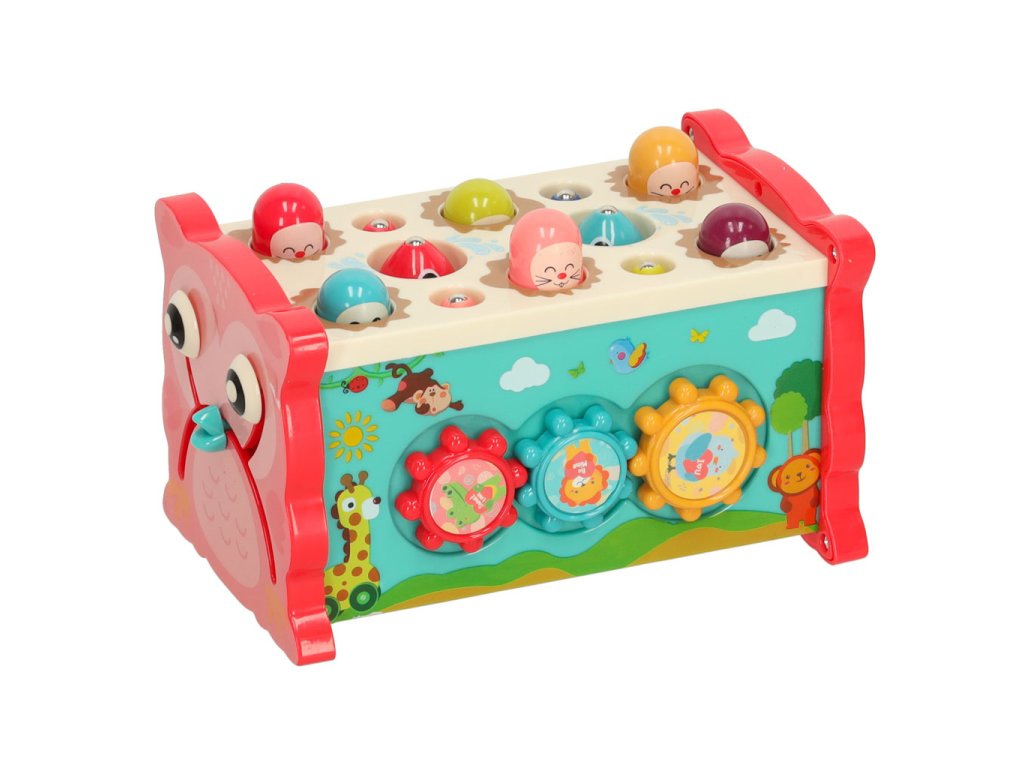Jednou z hlavných atrakcií je možnosť zatĺkať malé zvieratká, ktoré sa objavujú, čím prinášajú radosť vášmu dieťatku a precvičujú jeho reflexy. Okrem toho hračka umožňuje chytať farebné rybky a červíky pomocou priloženého rybárskeho prúta, čo rozvíja presnosť a trpezlivosť. Dieťa sa tiež môže naučiť základy fungovania hodín, otáčať farebnými kolieskami a pohybovať autíčkami v bludisku. Vďaka rôznym aktivitámposkytuje súpravahodiny zábavy a zároveň stimuluje zmysly dieťaťa prostredníctvom intenzívnych farieb a rozmanitých tvarov.