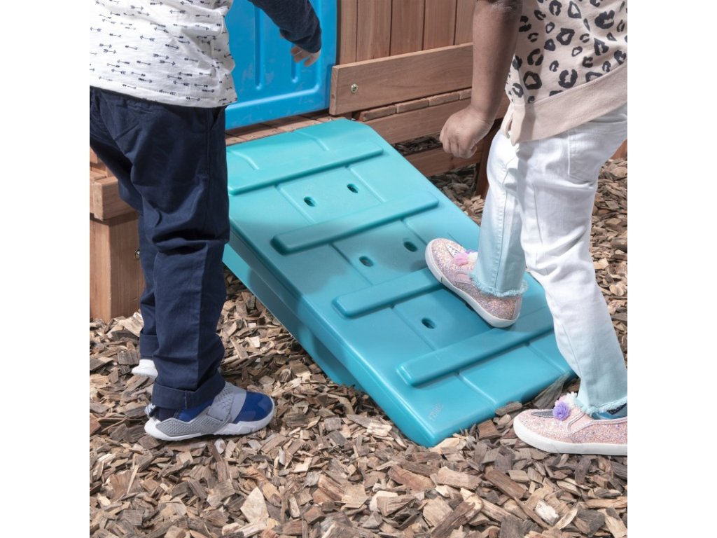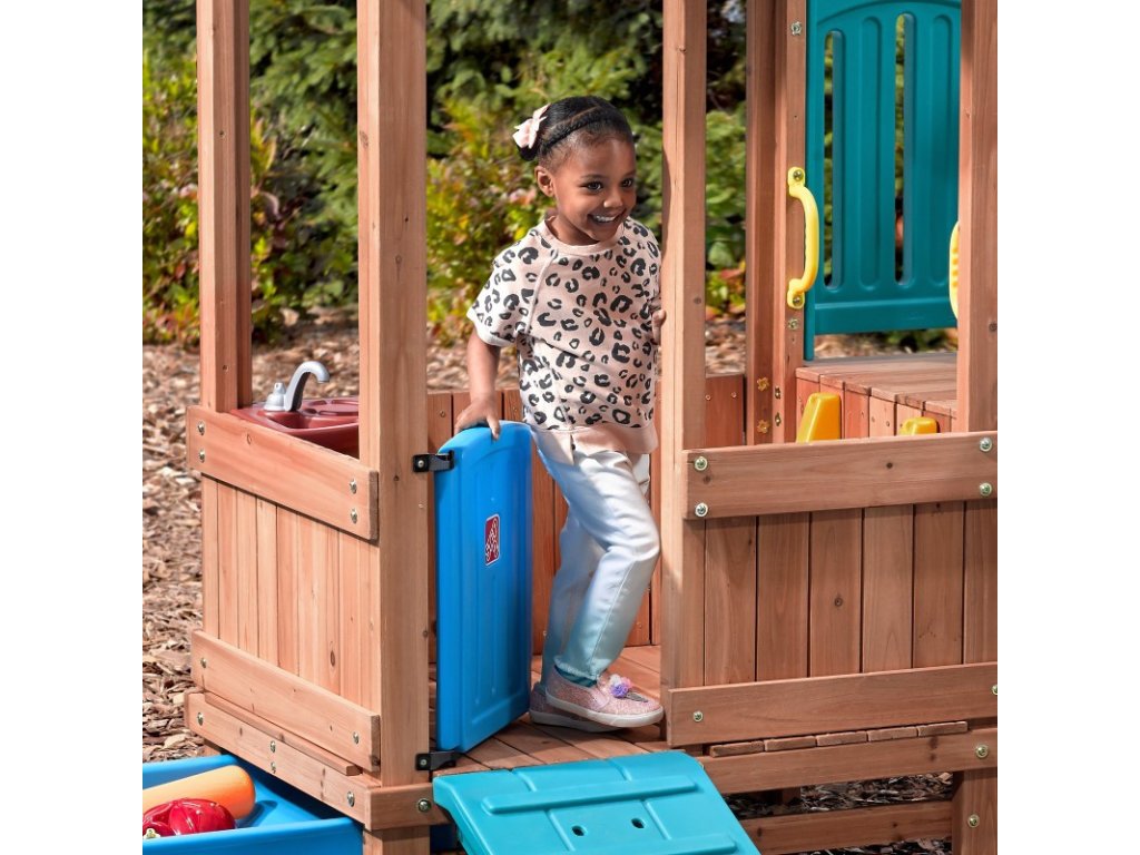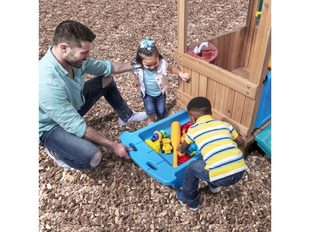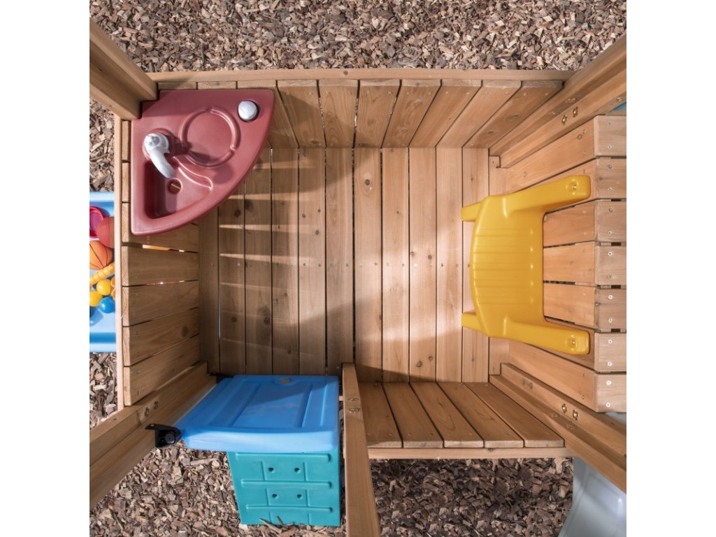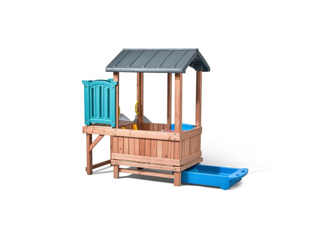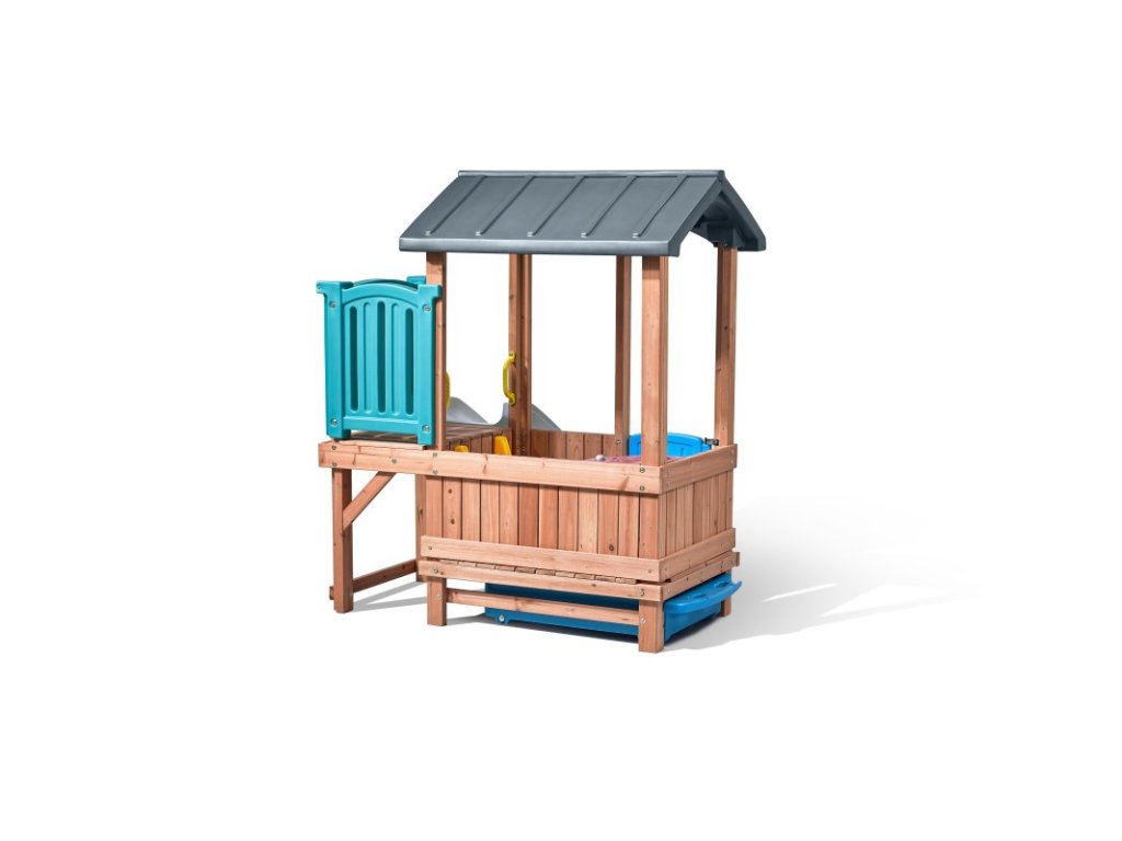 Tento rozkošný domček na hranie a šmykľavka poskytuje nekonečné možnosti! Môže z neho byť hrad, domček, pirátska loď alebo čokoľvek, čo si len budú chcieť predstaviť! Táto štýlová súprava na hranie na dvore využíva zmiešané materiály na vytvorenie jedinečného vzhľadu. Konštrukcia prevažne z dreva vytvára klasický vzhľad. Farebné plastové dieliky sú vhodné pre deti a vydržia hodiny hry! Tento drevený a plastový domček na hranie zabaví malé deti na celý deň!