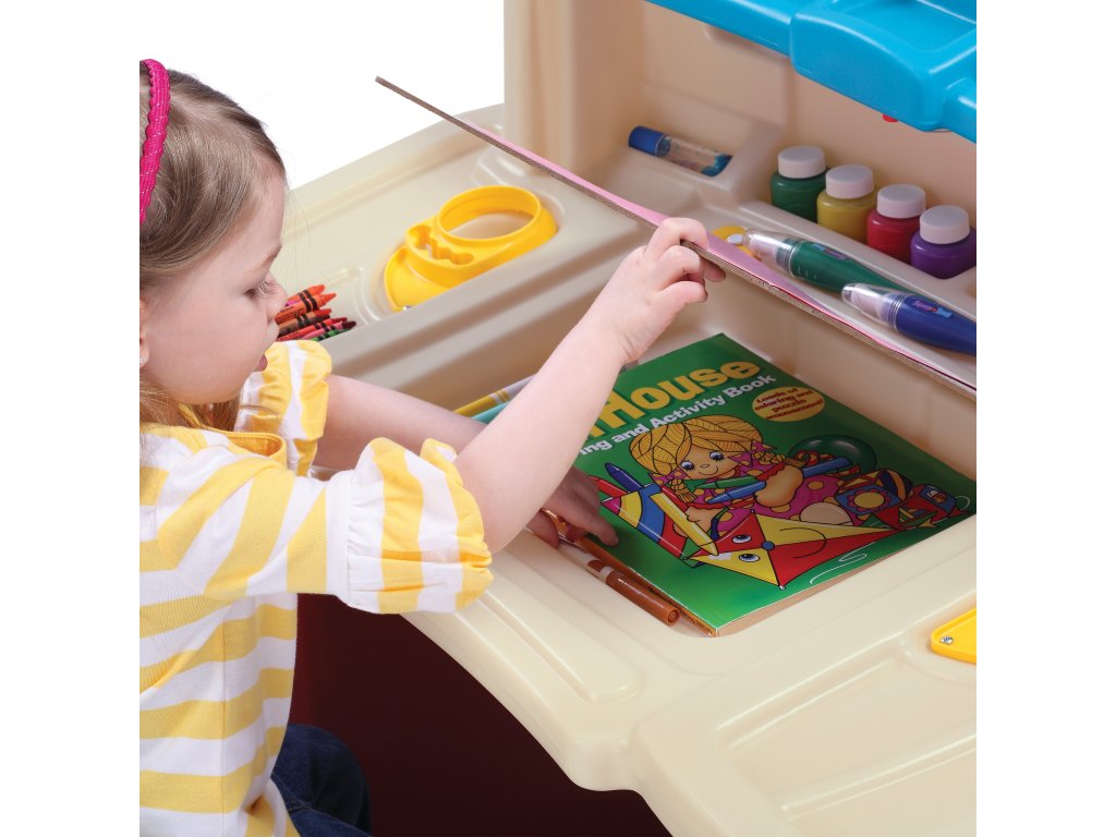 Luxusný písací stôl Art Master značkyKrok2 je ideálnym miestomna kreatívne hranie a učenie! Farebná funkčná súprava s písacím stolom a stoličkou podnieti predstavivosť vášho dieťaťa a pomôže mu rozvíjať manuálne zručnosti.Ideálna voľba pre detskú izbu alebo hracia plocha
