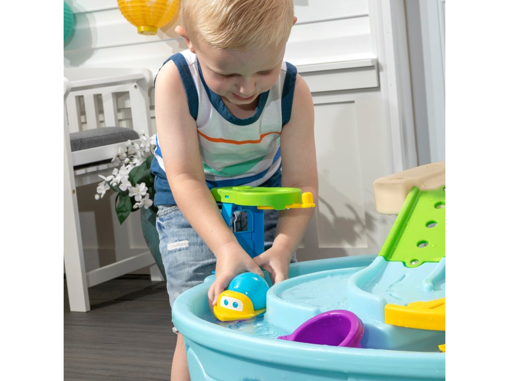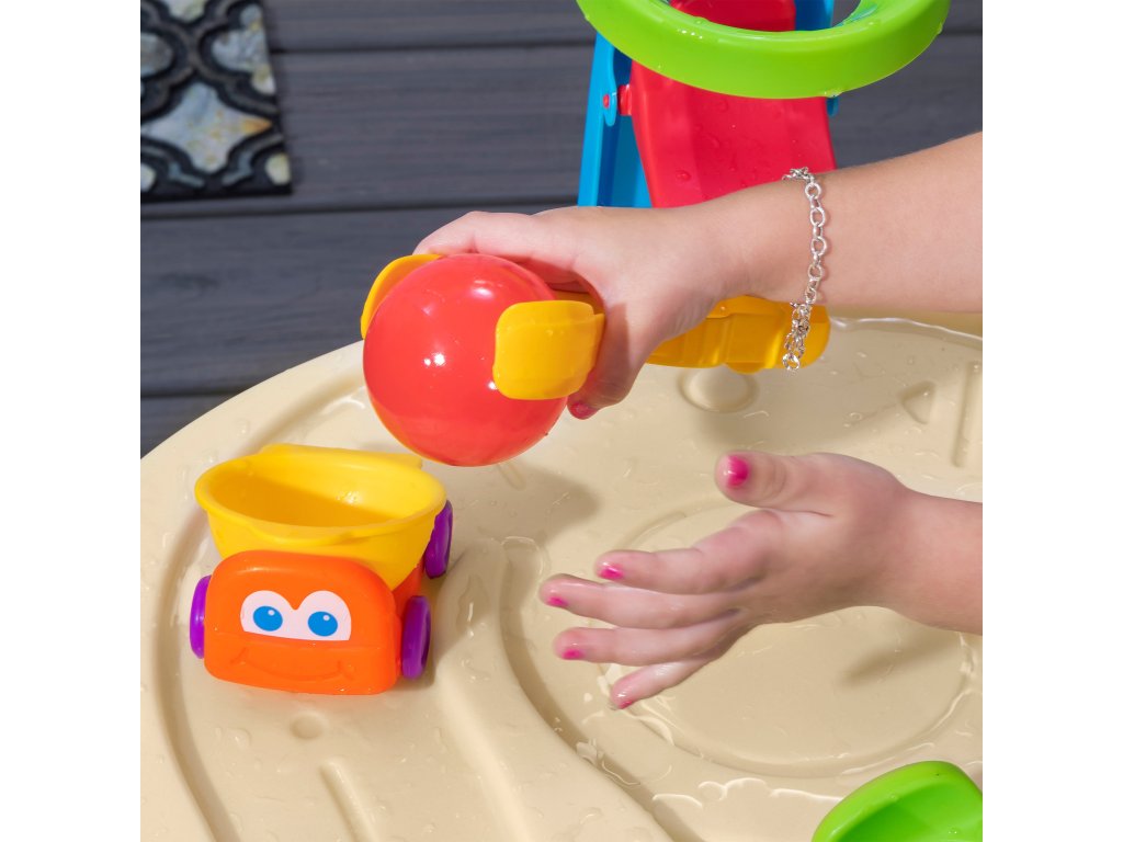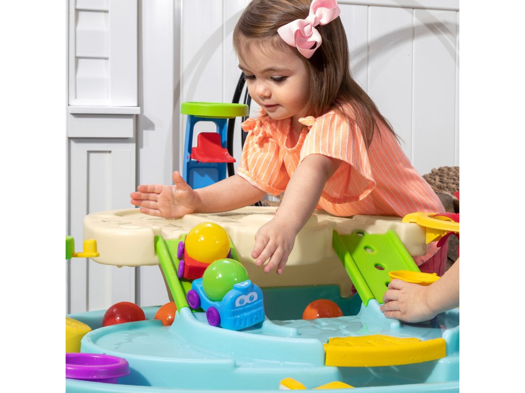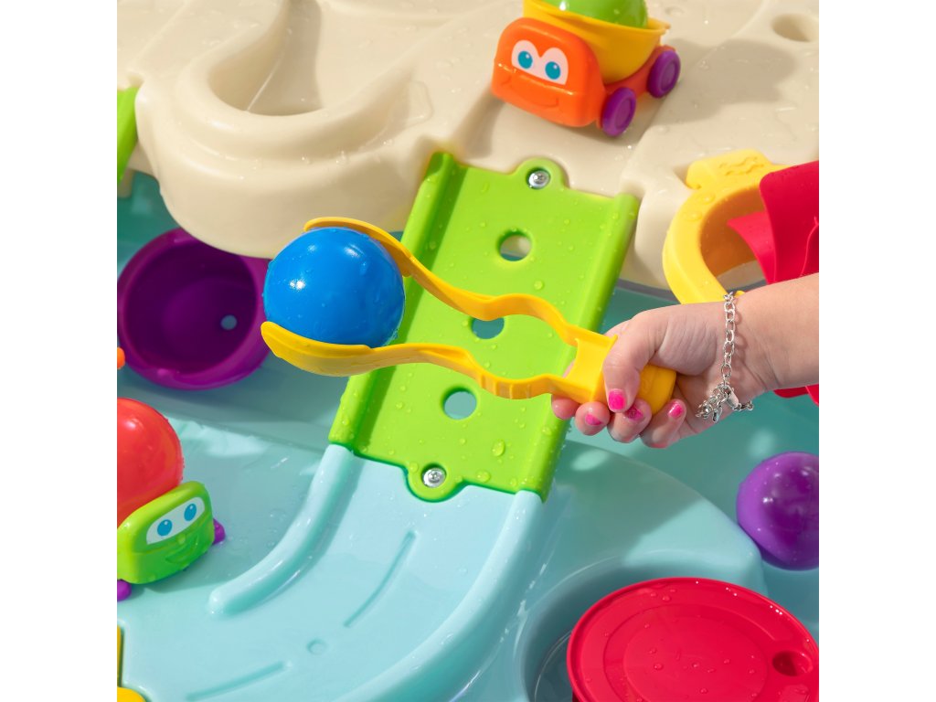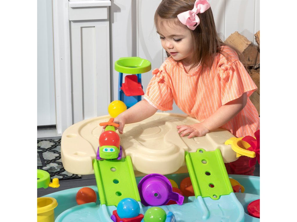 Step2 Ball Buddies Adventure Center dvojposchodový detský stôl! Okrem klasického sklápače Ball Buddies, tento vonkajší hrací stôl pre deti obsahuje vrtuľník Ball Buddies, loď a vlak - ktorý môže niesť dve lopty na hranie súčasne! Loptoví kamaráti sa už nevedia dočkať dobrodružstva okolo rieky alebo plavby po zákrutách liatych ciest a mostov. Vďaka veľkej ploche, množstvu priloženého príslušenstva a viacerým spôsobom hry je tento detský vodný stôl skvelou možnosťou na zapojenie do spoločenskej hry pre viac detí. Okrem toho jednotlivé stanice okolo bazéna ponúkajú ďalšie možnosti pre malé deti, ktoré sa chcú hrať samy. Malí dobrodruhovia môžu pomocou obručí hádzať loptičky do vody a užívať si vzrušujúce vodné hry pomocou vodného kolesa a priložených odmeriek. Na dne sa dokonca nachádza interaktívne koleso, takže malí plavci môžu uviesť vodu do pohybu a vytvoriť tečúcu rieku.