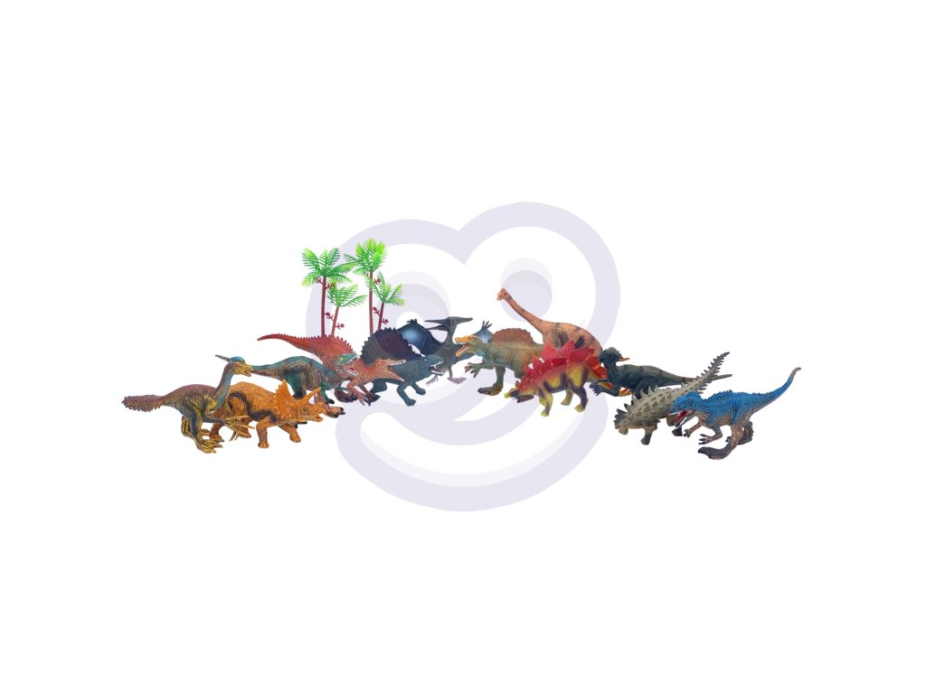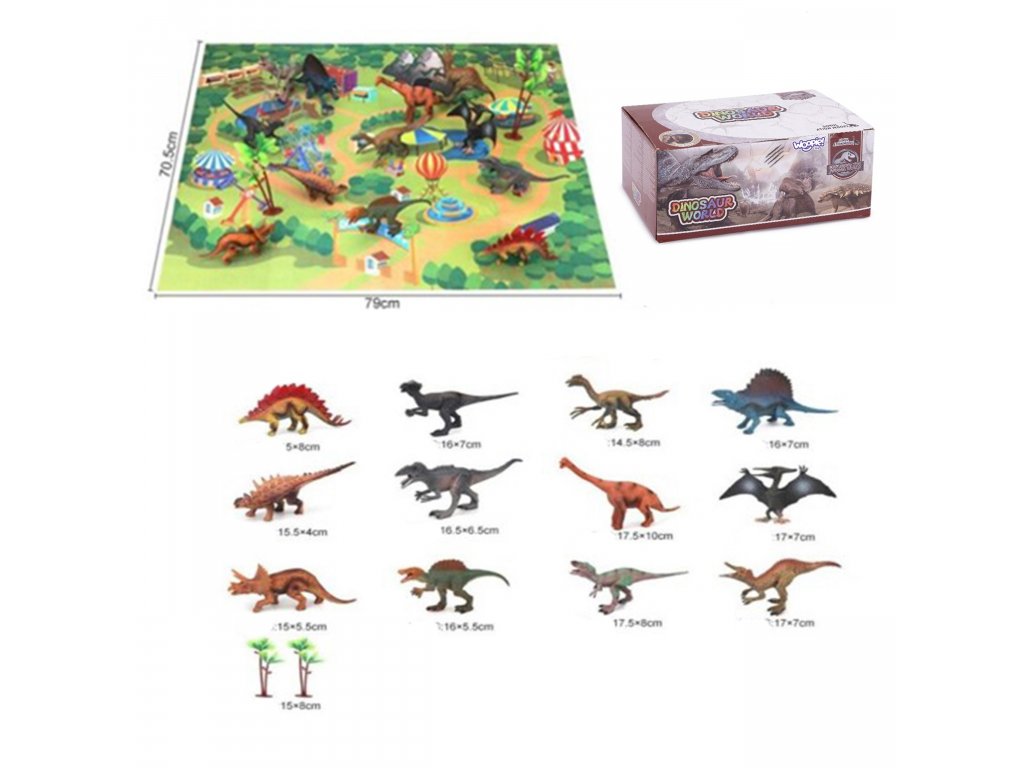 - - Sada obsahuje 13 figúrok dinosaurov, 2 stromy a podložku.
