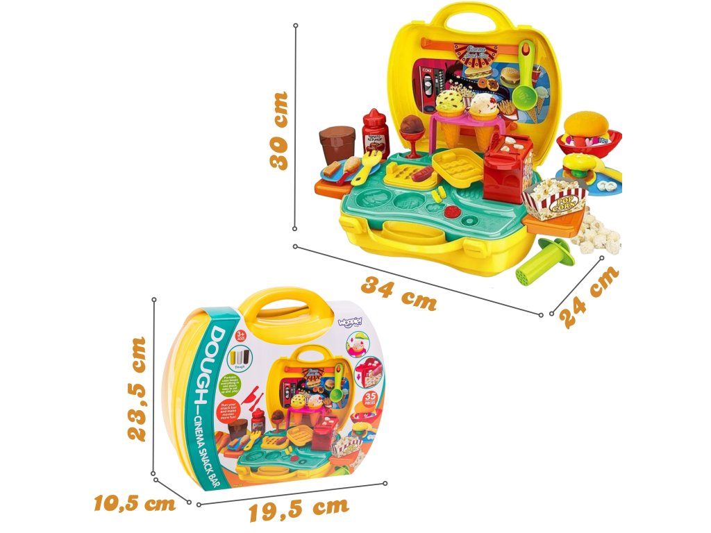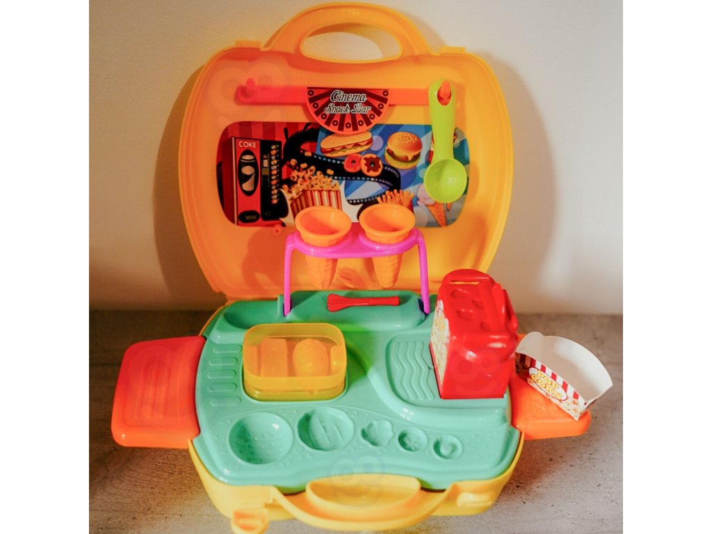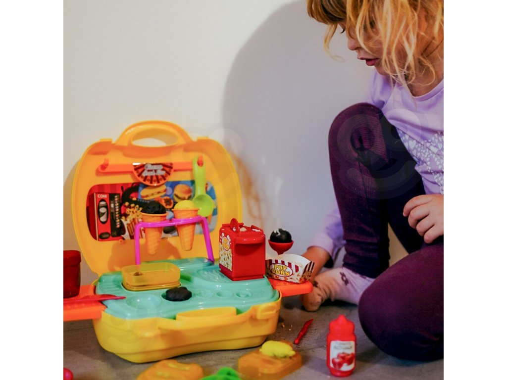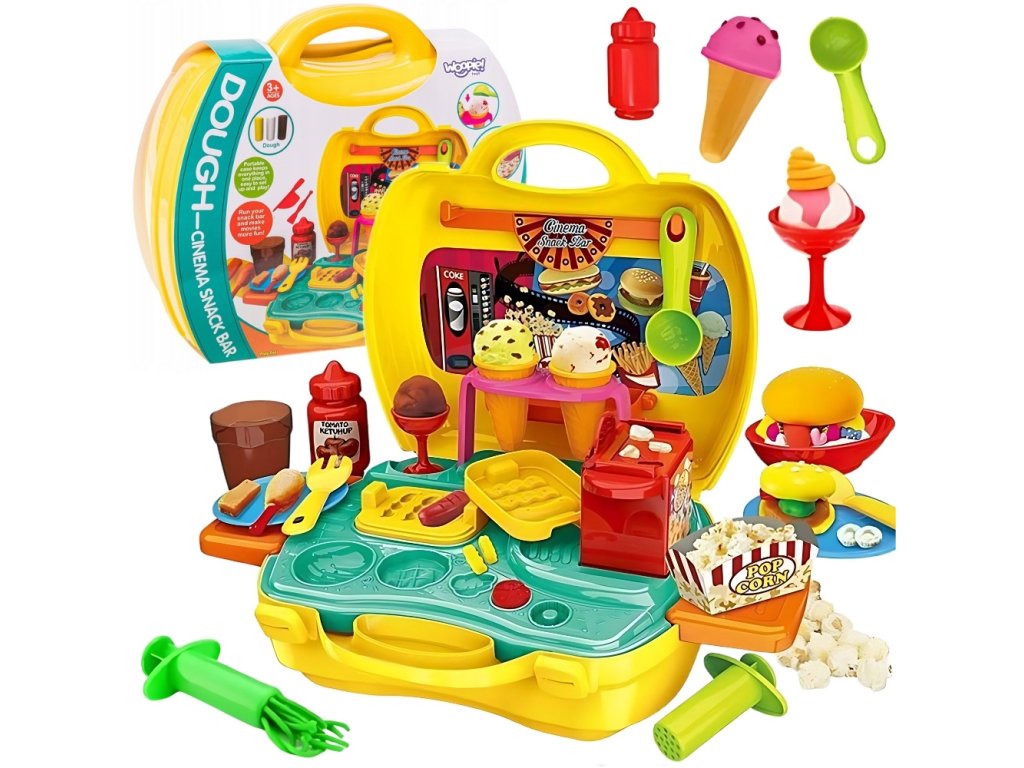 Súprava na výrobu občerstvenia od značky Woopie je splneným snom každého malého gurmána a ambiciózneho kuchára. Táto rozkošná, prenosná hracia súprava na občerstvenie umožní vášmu dieťaťukreatívne trávenie časua zároveň rozvíjal svoje manuálne zručnosti a predstavivosť.Kompaktný, ktorý je uzavretý v praktickom puzdre na prenášanie, je ideálny na hranie doma, u priateľov aj na cestách. Jednoducho otvorte kufrík, rozložte bar a začnite svoje kulinárske dobrodružstvo v priebehu niekoľkých sekúnd.Bohaté príslušenstvo zaručuje hodiny pútavej zábavy. Vaše dieťa môže prevziať úlohu kuchára, predavača alebo zákazníka a vytvoriť si vlastné scenáre a jedlá. Súprava umožňuje pripraviť obľúbené občerstvenie, ako je zmrzlina, hranolky, hamburgery alebo popcorn. Stačí, ak z cestovinovej hmoty vyformujete tvar príslušného výrobku a potom ho naservírujete na tanier alebo do špeciálneho obalu.Vysokokvalitné spracovanie a bezpečné materiály poskytujú bezpečnú a dlhotrvajúcu zábavu. Je to vynikajúci nápad na darček, ktorý určite poteší každé dieťa a poskytne mu veľa zábavy.