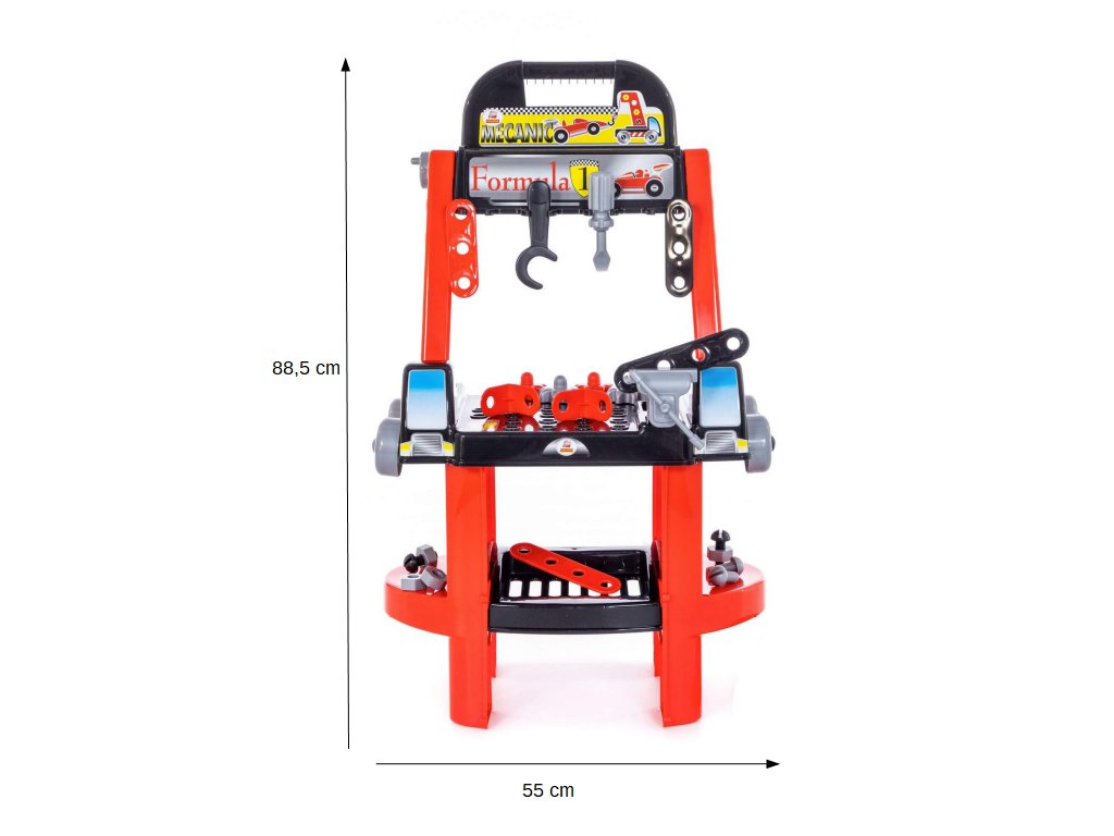 Mechanická súprava pod špeciálnou hornou časťou sa nachádza polička na odkladanie nástrojov, ktoré práve nepotrebujete. Na priečke spájajúcej strany dielne (v najvyššom bode) sa nachádza háčik, napr. na kľúč. Okrem toho je súčasťou dodávky aj súprava príslušenstva: skrutkovač, francúzsky kľúč, plochý kľúč na skrutkovanie, skrutky a matice, kľučky, zverák a prilba. Obrovské množstvo samolepiek, ktoré sú súčasťou sady, vám umožní atraktívne vyzdobiť celú dielňu.