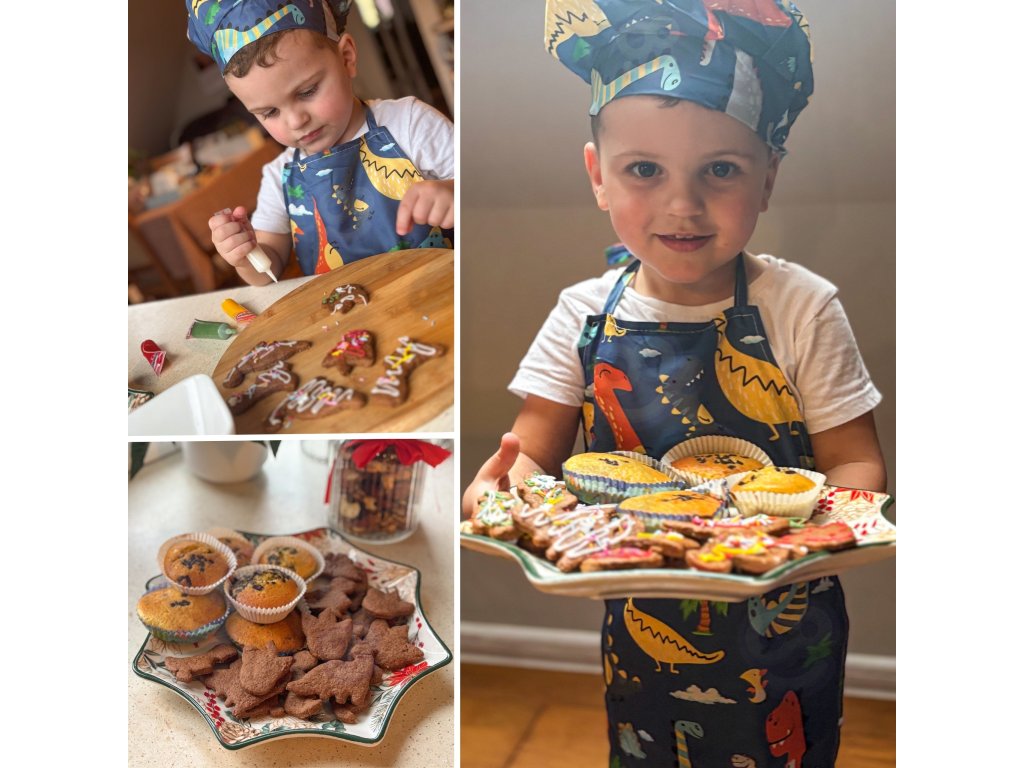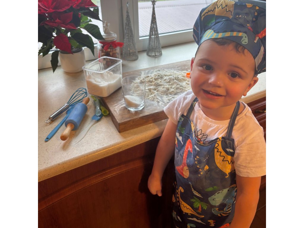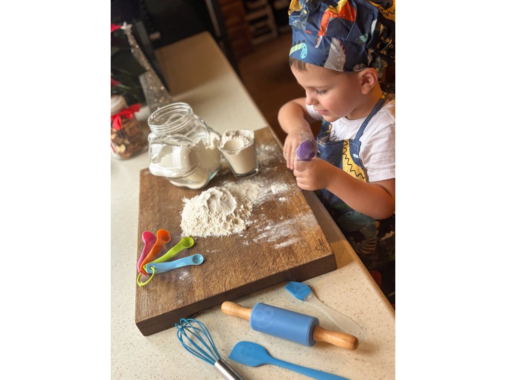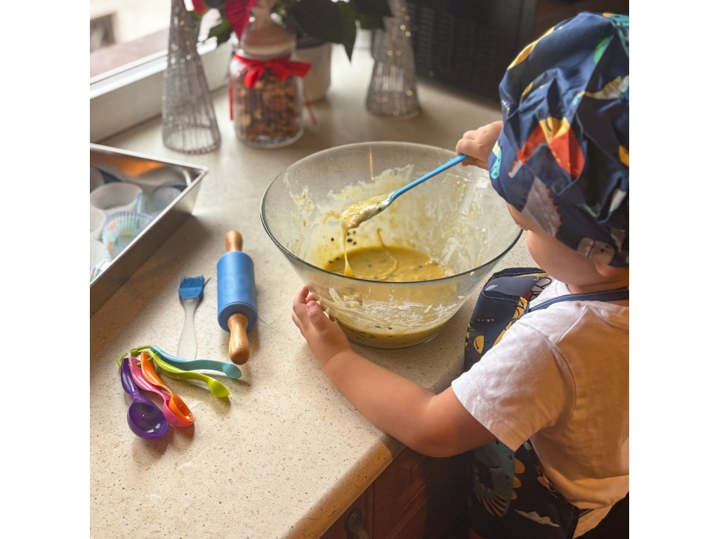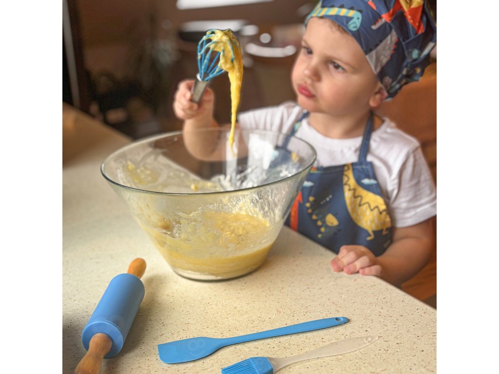 Preneste zábavu do kuchyne! Súprava Dino Malý kuchár odWOOPIE je pestrýsada kuchynského príslušenstva pre deti, ktorá kombinujeučenie s kulinárskou zábavou. Roztomilá zástera a čiapka s motívom dinosaura,bezpečné nástroje a silikónové formy podporujú spoločné varenie. Nastaviteľné popruhy, vďaka mäkkému materiálu a ľahkému náčiniu je sadapohodlné a vhodné pre malé ruky.