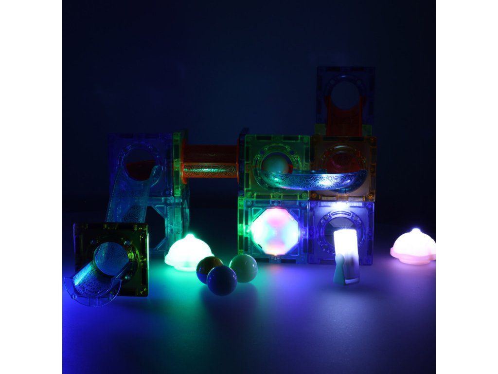 Táto súprava je však jedinečná - má veľa svietiacich prvkov vrátane guľôčok, ktoré po uvedení do pohybu začnú svietiť. Výsledkom je, že po postavení dráhy vytvoria guľôčky, ktoré sa po nej pohybujú, nádhernú svetelnú šou!