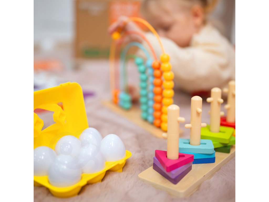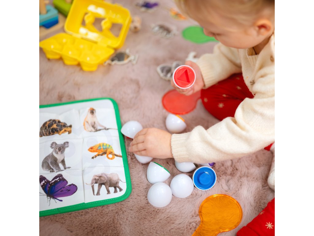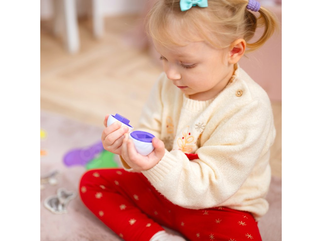 Montessori vajíčka je vzdelávacia hračka, ktorá rozvíja motorické zručnosti dieťaťa a koordináciu oko-ruka. Súprava obsahuje6 vaječných bielkov vo výlisku, ktorý svojím farebným vnútrom v rôznych tvaroch podporuje hru. Hra je úlohou je priradiť dve polovice vajíčok tak, aby tvorili celok. Vajíčka by mali byť priradené obefarba ako ajtvar. Dojčatá sa pomocou nej môžu naučiť triediť a priraďovať, čo urýchľuje intelektuálny rozvoj. Súčasne precvičujekoordinácia rúk a očí dieťa, rozpoznávanie farieb a tvarov, jemná motorika izlepšuje ohybnosť prstov na nohách. Môžete ich znovu a znovu rozobrať a poskladať a s radosťou ich vyberať z plastovej škatule a vracať na svoje miesto, aby si dieťa precvičilo koncentráciu.