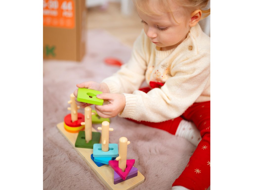 Táto hračka je naozaj skvelávzdelávací darček pre deti! Umožňuje nielen hrať sa, ale ajrozvoj kognitívnych zručností. Obsahuje drevená základná doska so 4 kolíčkami a 12 farebnými blokmi geometrických tvarov: kruh, obdĺžnik, trojuholník a štvorec. Vďaka rôznym farbám blokov si deti môžu precvičovaťrozpoznávanie a pomenovanie farieb. Je to dôležitá zručnosť, ktorá pomáha v každodennom živote. Kocky rôznych tvarov (kruh, obdĺžnik, trojuholník a štvorec) umožňujú deťom pochopiť základné geometrické útvary. Je toprvý krok pri učení sa matematiky. Triedenie blokov môže byť skvelým spôsobom, ako sa naučiť počítať. Deti môžu počítať, koľko kociek je v jednotlivých tvaroch alebo celkovo. Koordinácia rúk a očí: Umiestnenie blokov na správne kolíky si vyžaduje presnosť a koordináciu. Je to výborné cvičenie pre malé ruky.