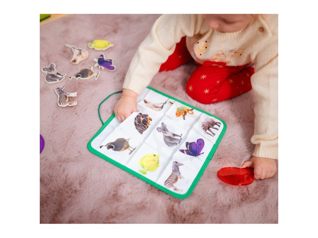 Je to malá skladačka, v ktorej dieťa zodpovedá plyšovým zvieratám do vrecka. Každé zviera má svoje vlastné zodpovedajúce miesto, kam ho môžete vložiť. Keď deti začnú priraďovať zvieratká ku kapsičkám, budú si budovať vizuálnu pamäť, rozpoznávanie vzorov a schopnosť sústrediť sa. Povrch hračky je mäkký a hladký a šnúrka je pružná. Ukladanie zvieratiek do vreciek pomáha dieťaťuprecvičovať presné ovládanie rúk a očí a zaostrovanie.