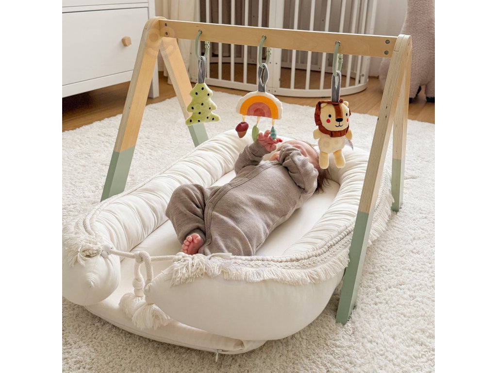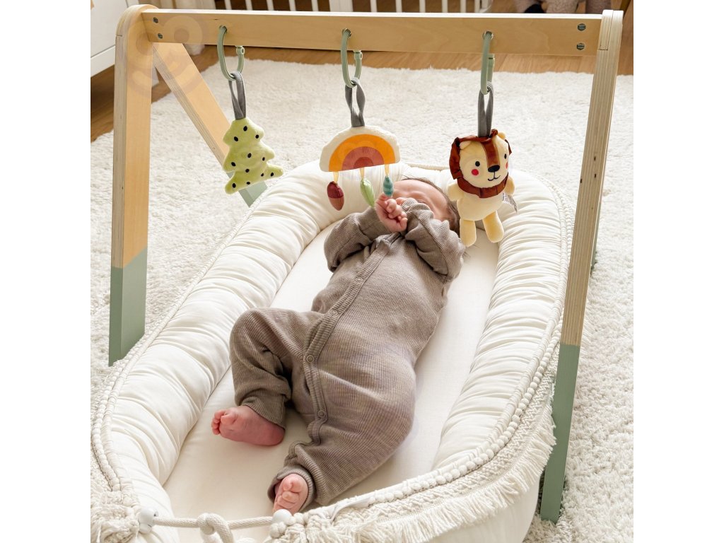 Roztomilý lev prináša do hry prvok radosti. Je mäkká na dotyk a jemne hrká, čím stimuluje zmysly dieťaťa a podporuje objavovanie rôznych textúr a zvukov. Vo vnútri leva sa nachádza aj mäkký zvonček, ktorý po zatrasení jemne znie.