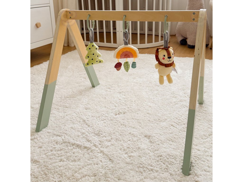 Farebná dúha skrýva tri menšie závesné dieliky, každý s inou textúrou a farbou, čo podporuje rozvoj zmyslových a motorických zručností, keď dieťa natiahne ručičky, aby ich chytilo. Stlačením dúhy sa ozve jemný pískavý zvuk, ktorý určite upúta pozornosť dieťaťa.