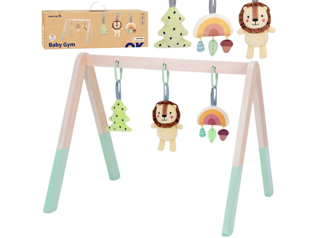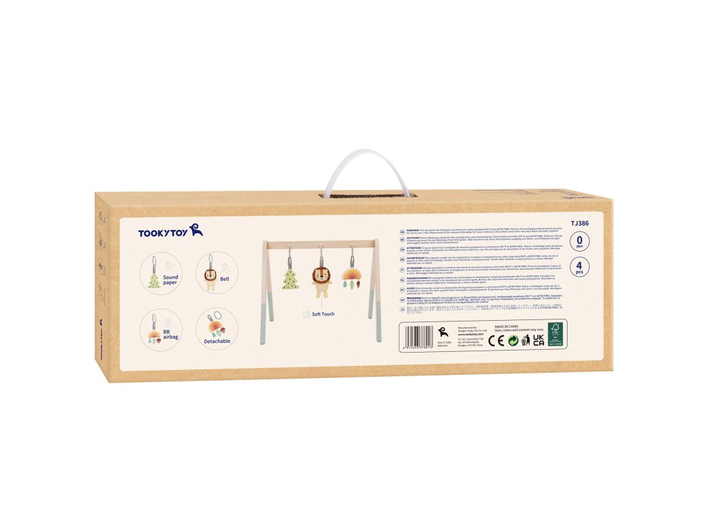 Detská posilňovňa značkyTooky Toy je navrhnutý tak, aby stimuloval zmysly vášho dieťaťa apodpora jehoskorý vývoj. Stojan obsahujetri závesné prvky, ktoré sú nielen pútavé, ale ponúkajú aj interaktívnu hru so zvukmi.