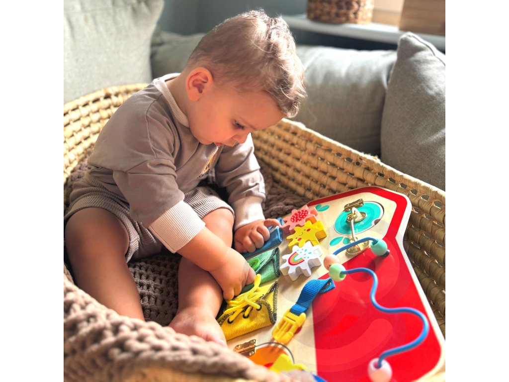 - - hračka mámnožstvo rôznych aktivít:2 rôzne zámky na otváranie, spona, zips, gombík, šnúrky, motorová slučka a 3 prevodové stupne,