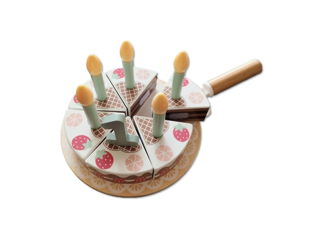 Drevená krásna čokoládová narodeninová torta s jahodami a pusinkamiTooky Toy je nielen očarujúcim doplnkom detskej kuchyne, ale aj dokonalým dekoračným prvkom na narodeninovej oslave. Skladá sa z20 starostlivo vyrobené drevené diely, každý kus torty sa spája pomocou pevného suchého zipsu, čo zaručuje pevnú konštrukciu. Okrem toho súprava obsahuje sviečky,číslice od 1 do 5,narodeninové prianie a špeciálnylyžica na cesto.