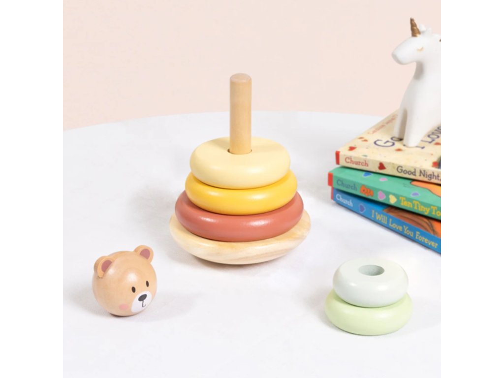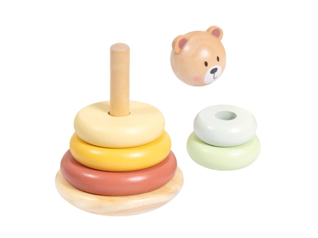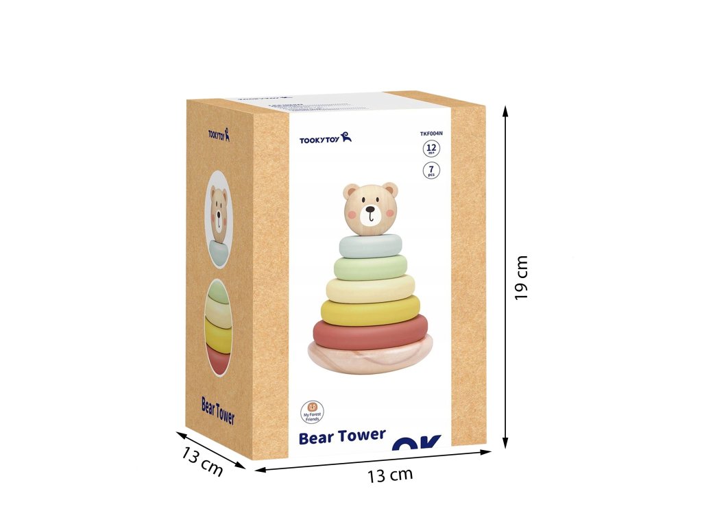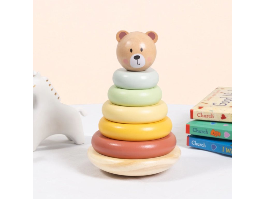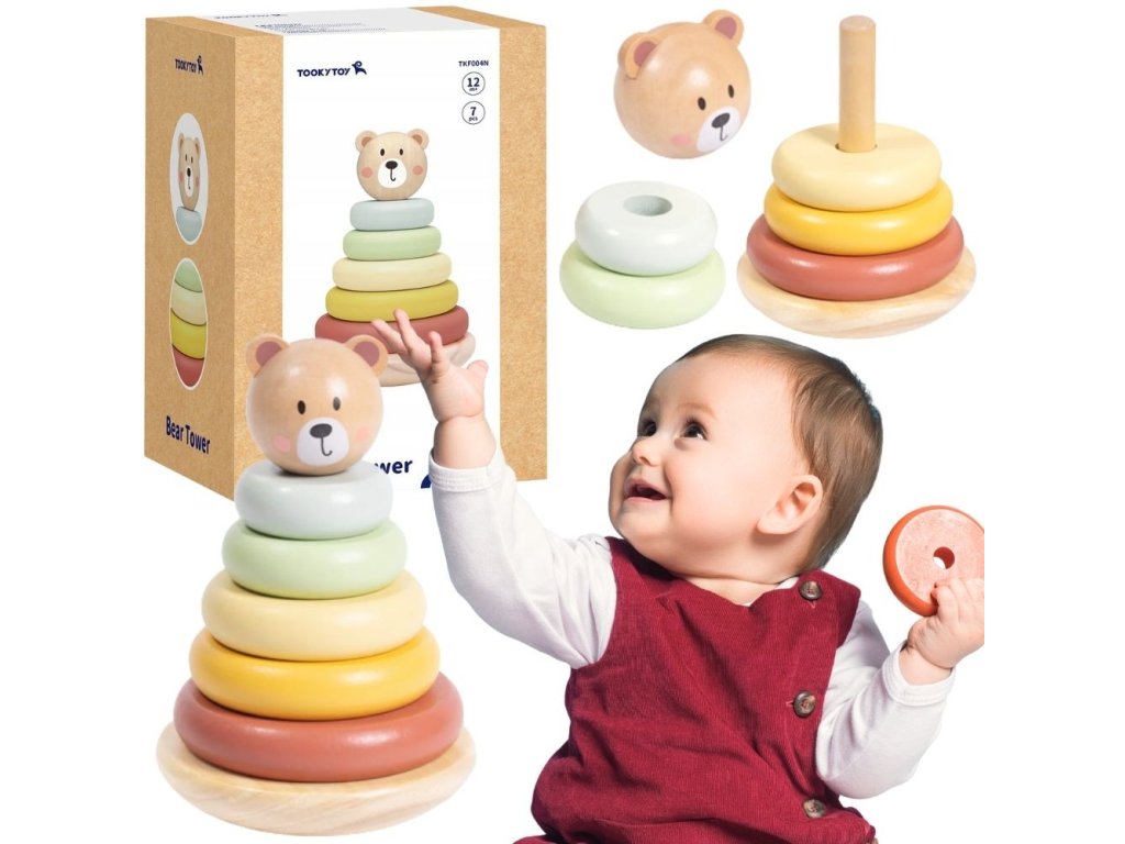 Drevená veža s diskami a priateľskou hlavou medvedíka od značkyTooky Toy je hračka, ktorá spája radosť z tvorivej hry a podporu rozvoja dieťaťa. Žiarivé pastelové farby, solídne spracovanie a možnosť usporiadať dieliky mnohými spôsobmi z nej robia nielen klasickú pyramídu, ale aj inšpiráciu na objavovanie, experimentovanie a učenie prostredníctvom pohybu a predstavivosti. Batoľa môže stavať, búrať a vytvárať vlastné stavby a zároveň si precvičovať svoje šikovné prsty.