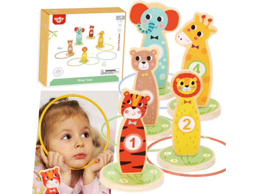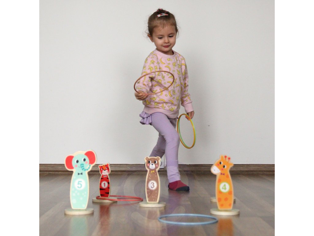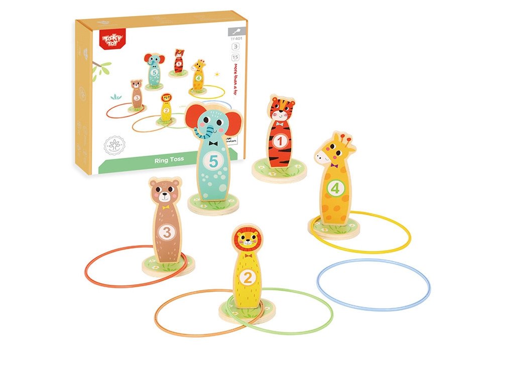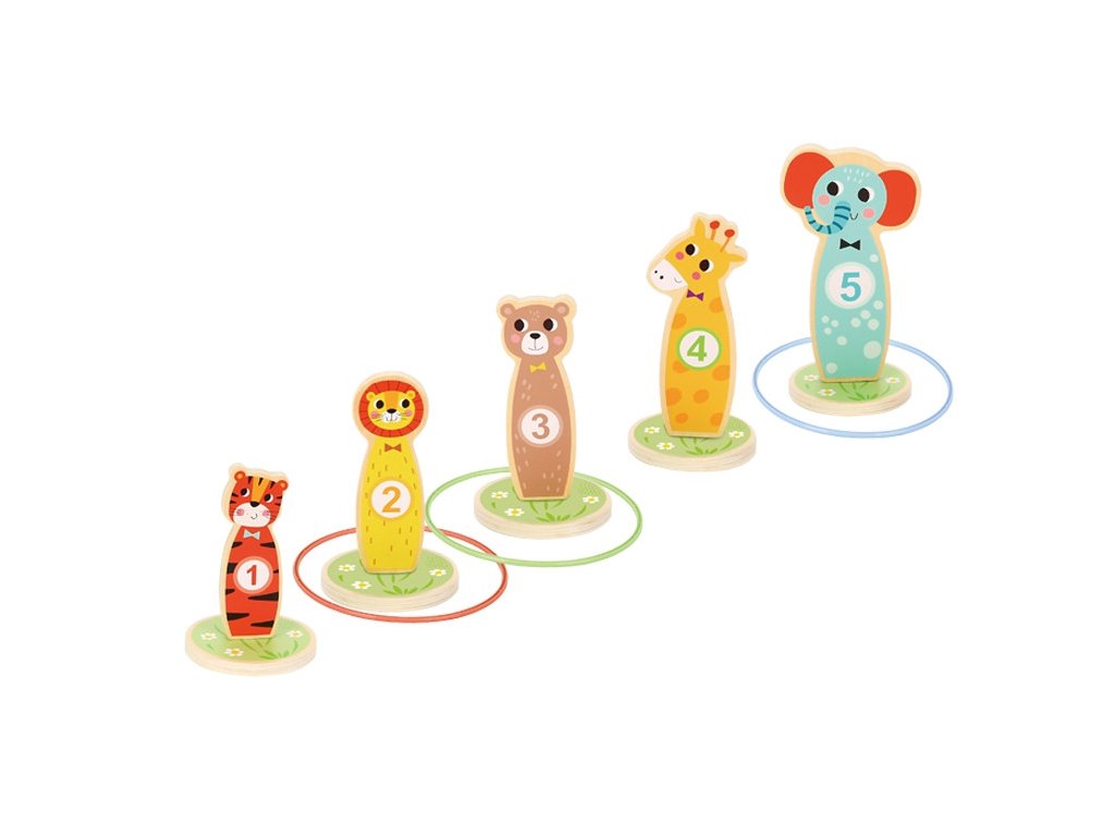Tooky Toy Drevená arkádová hra Target Toss -Táto stránkazábavná hra obratnosť jeideálna zábava pre deti. V priebehu hry je možné zvyšovať úroveň obtiažnosti umiestňovaním kolíkov ďalej od seba. Súprava sa skladá z5 krásnych kolíkovna kolieskach v tvare zvierat a5 hádzacích krúžkov. Vhodné na hranie v interiéri aj exteriéri. Môže sa hrať samostatne aj v spoločnosti.