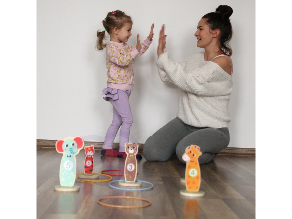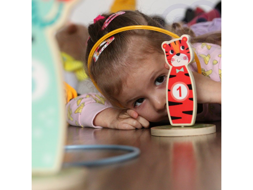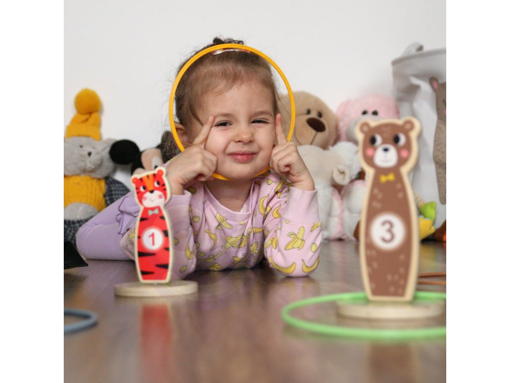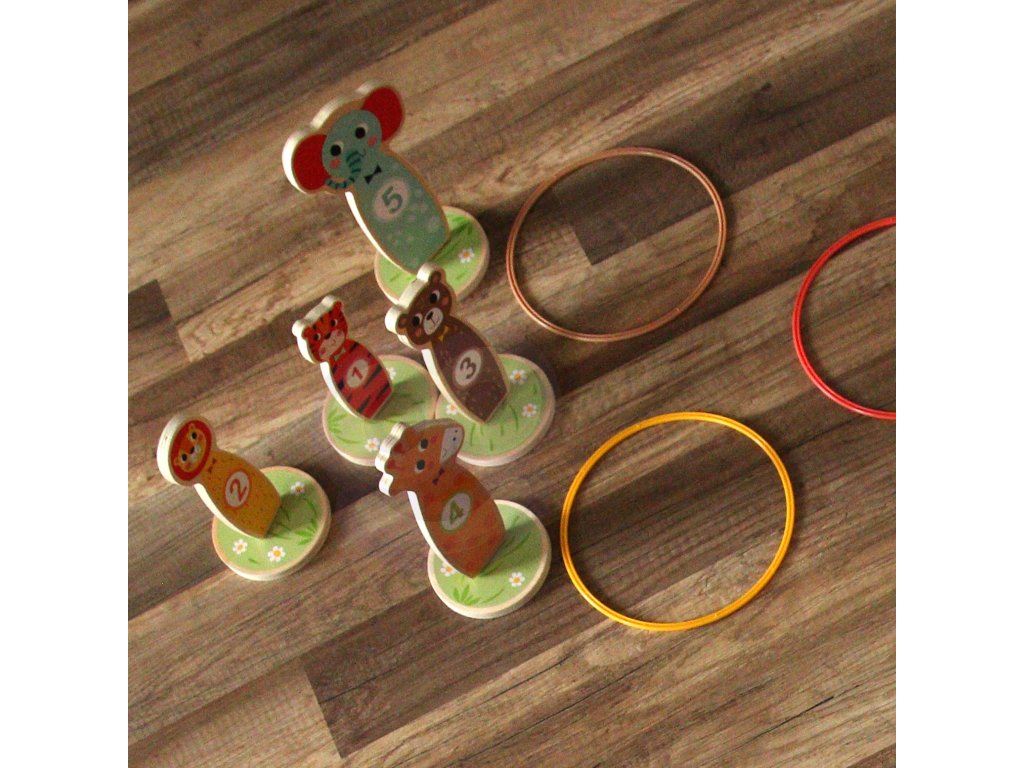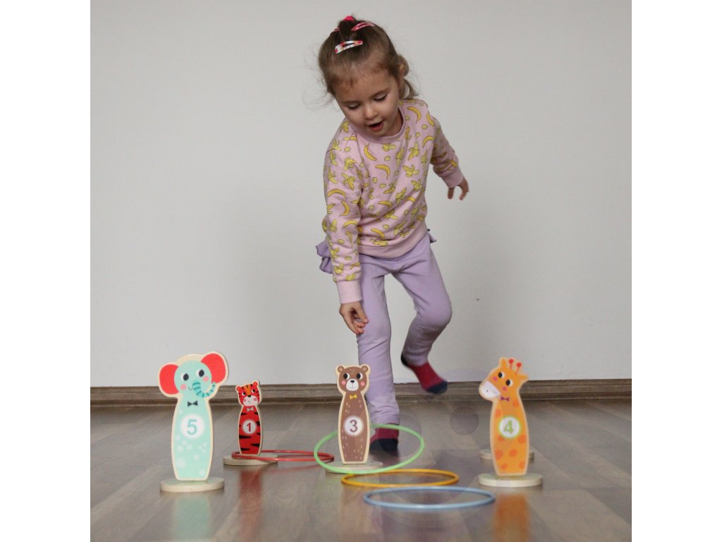 Tooky Toy Drevená arkádová hra Target Toss -Táto stránkazábavná hra obratnosť jeideálna zábava pre deti. V priebehu hry je možné zvyšovať úroveň obtiažnosti umiestňovaním kolíkov ďalej od seba. Súprava sa skladá z5 krásnych kolíkovna kolieskach v tvare zvierat a5 hádzacích krúžkov. Vhodné na hranie v interiéri aj exteriéri. Môže sa hrať samostatne aj v spoločnosti.