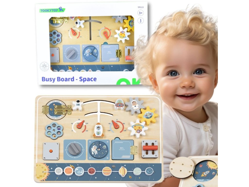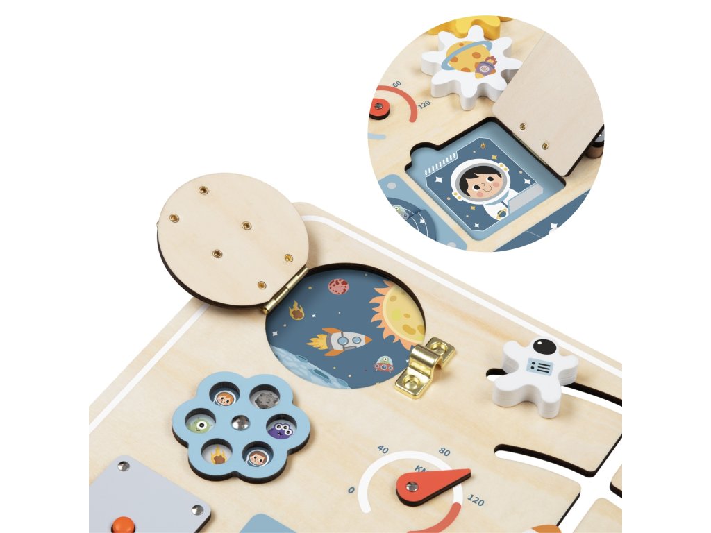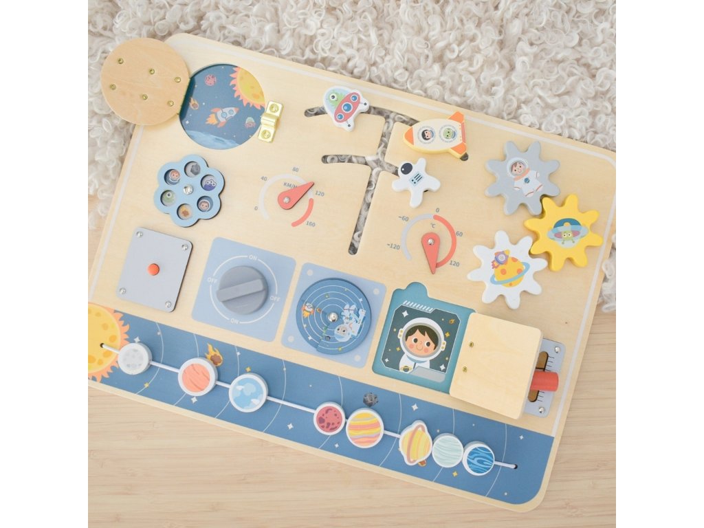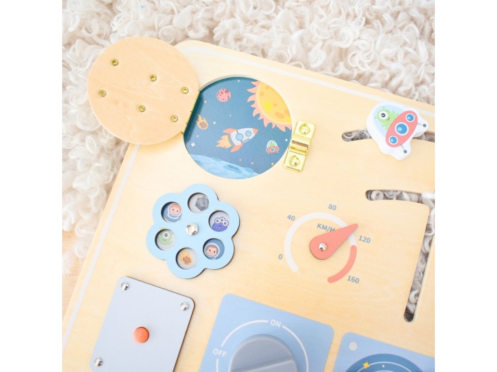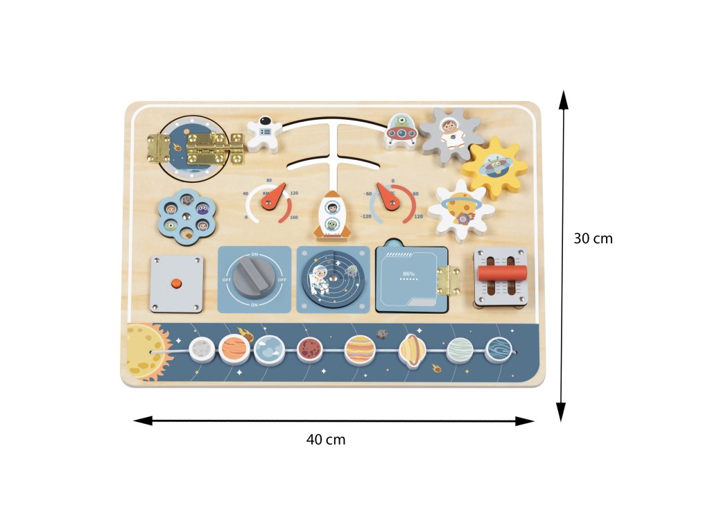 Predstavte si ovládací panel skutočnej vesmírnej stanice, kde každé tlačidlo, gombík a páčka skrývajú fascinujúce tajomstvo. Táto jedinečná manipulačná tabuľa odTooky Toy vezme deti na nezabudnuteľnú cestu slnečnou sústavou a spojí vzdelávanie so vzrušujúcou zábavou. Farebná grafika s astronautmi, planétami a raketami oživuje predstavivosť, zatiaľ čo množstvo interaktívnych prvkov poskytuje hodiny skúmania a objavovania. Nie je to len hračka - je to brána do vesmíru, ktorá rozvíja zvedavosť o svet a túžbu skúmať vesmír.