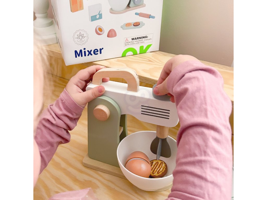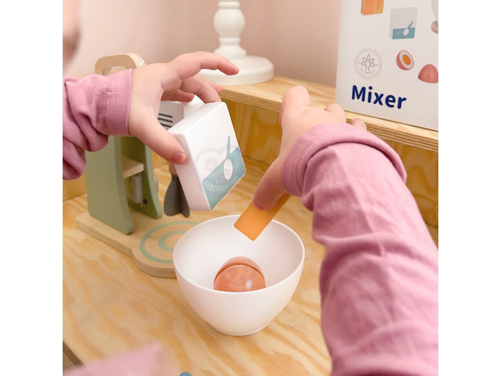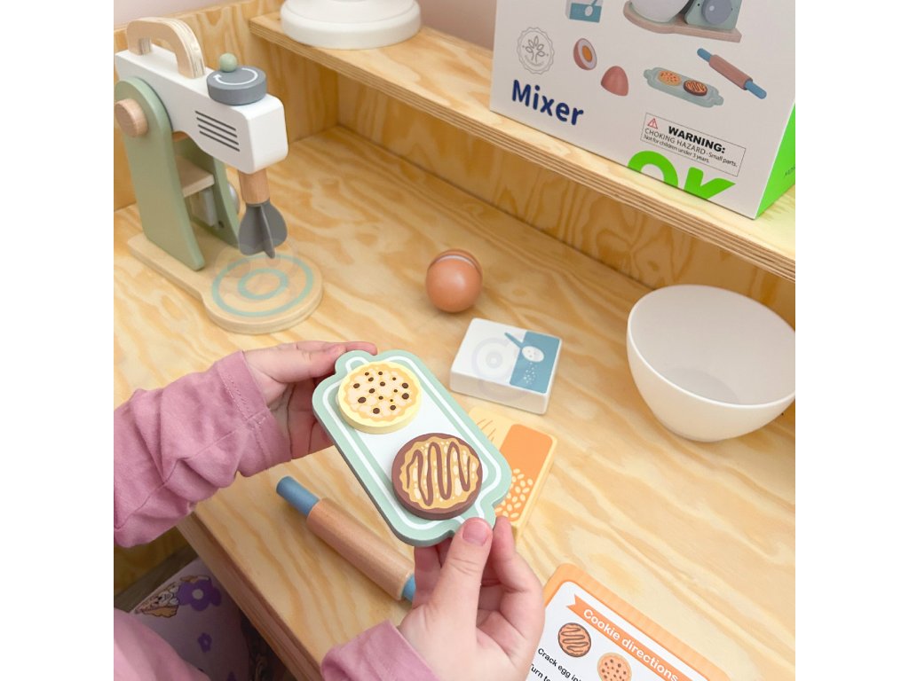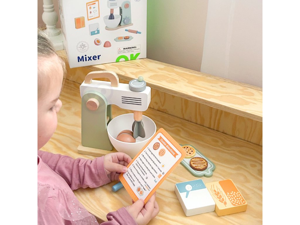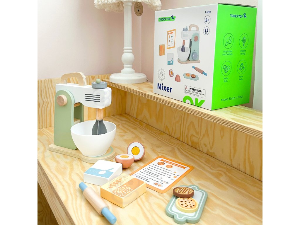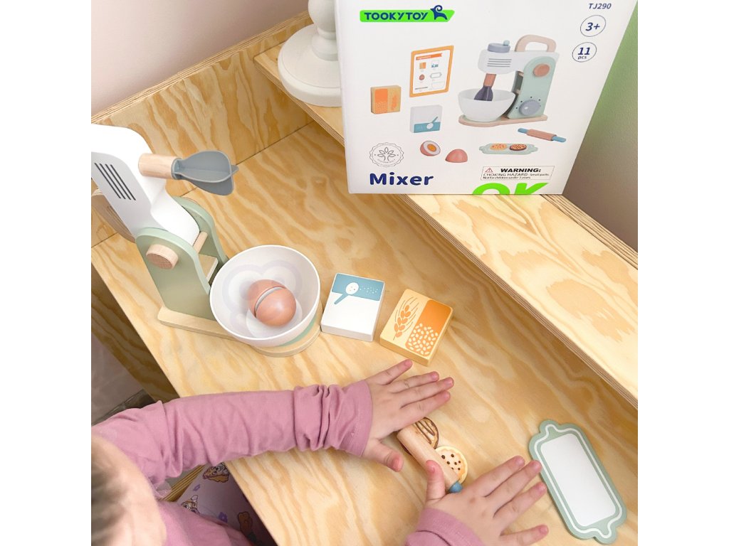 Drevený mixér pre detské značkyTooky Toy v pastelových farbách je užitočným a štýlovým doplnkom detskej kuchyne. Všetky deti milujú chutné sušienky. Prečo ich nepripraviť zábavným spôsobom? Do misky dajte vajíčko a múku, nezabudnite na cukor a začnite miesiť. Získate tak chutné sušienky, akoby boli skutočné. Malý kuchár bude môcť svojich blízkych pohostiť chutným pečivom. Hry zahŕňajúcehranie rolí sú dôležitou súčasťou vzdelávania a rozvoja detí. Umožňujú dieťaťurozvíjať predstavivosť a praktizovať rôznesociálne a komunikačné zručnosti simulovaním každodenných situácií dospelých.
