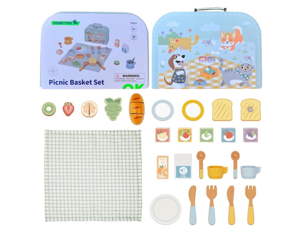 Drevená pikniková súprava je súprava príslušenstva pre zábavu pri príprave a servírovaní jedál. Tentokrásna drevená súprava nie je len rozkošná hračka - je to výzva na tvorivú a rozvíjajúcu hru doma aj vonku. Perfektný darček! Všetky dieliky sú zabalené v praktickom puzdre, takže hračku môžete ľahko uložiť a vziať so sebou na cesty. Dobre poslúži na samostatnú hru, ako aj na spoločné aktivity so súrodencami alebo kamarátmi.