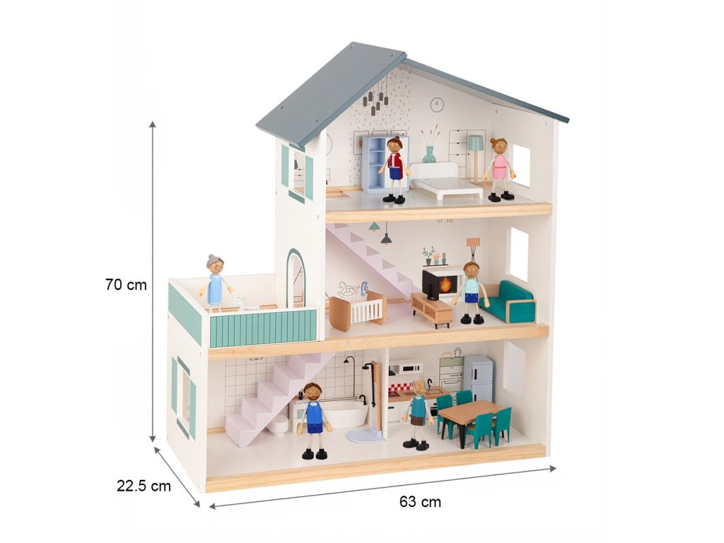 Na prízemí sa nachádza kuchyňa s jedálenským kútom a kúpeľňa vybavená všetkým potrebným, ako je vaňa, sprchovací kút a toaleta. Na prvom poschodí sa nachádza priestranná obývacia izba s útulnou pohovkou a televízorom, kde si bábiky môžu oddýchnuť a tráviť čas spoločne. V podkroví sa nachádza krásna spálňa s pohodlnou posteľou, šatníkom a detskou postieľkou. Zo spálne je prístup na balkón, ktorý je ideálnym miestom na relaxáciu a vychutnávanie si výhľadu.