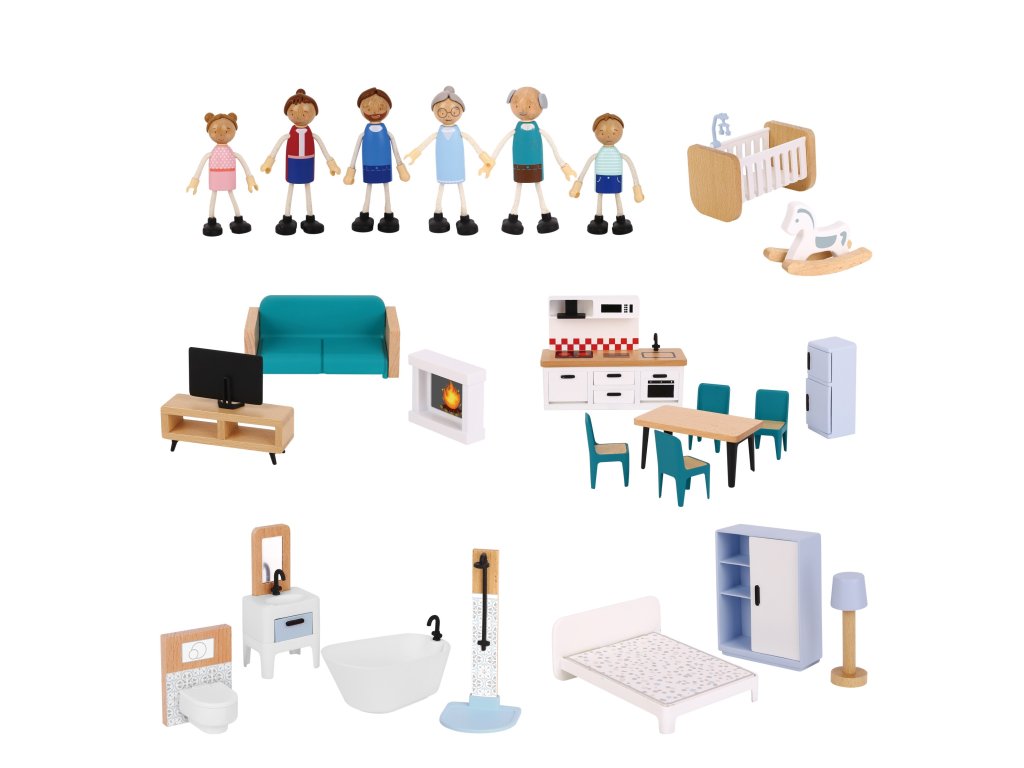 Domček pre bábiky jevybavené rodinou šiestich bábik, ktoré sú pripravené na nasťahovanie. Každá bábika má jedinečný štýl a osobnosť a vďaka plne pohyblivým kĺbom sú možnosti kreatívnej hry nekonečné. Súprava obsahuje ajnábytok a dekoráciektoré oživia každú miestnosť a vytvoria jedinečnú atmosféru.