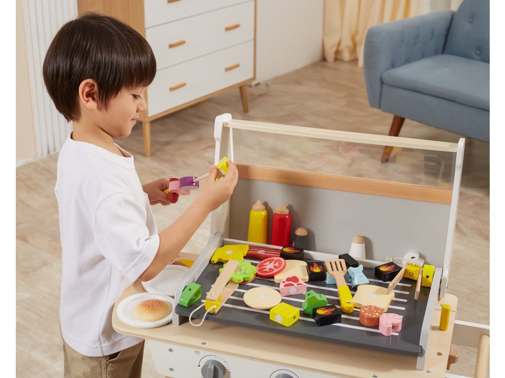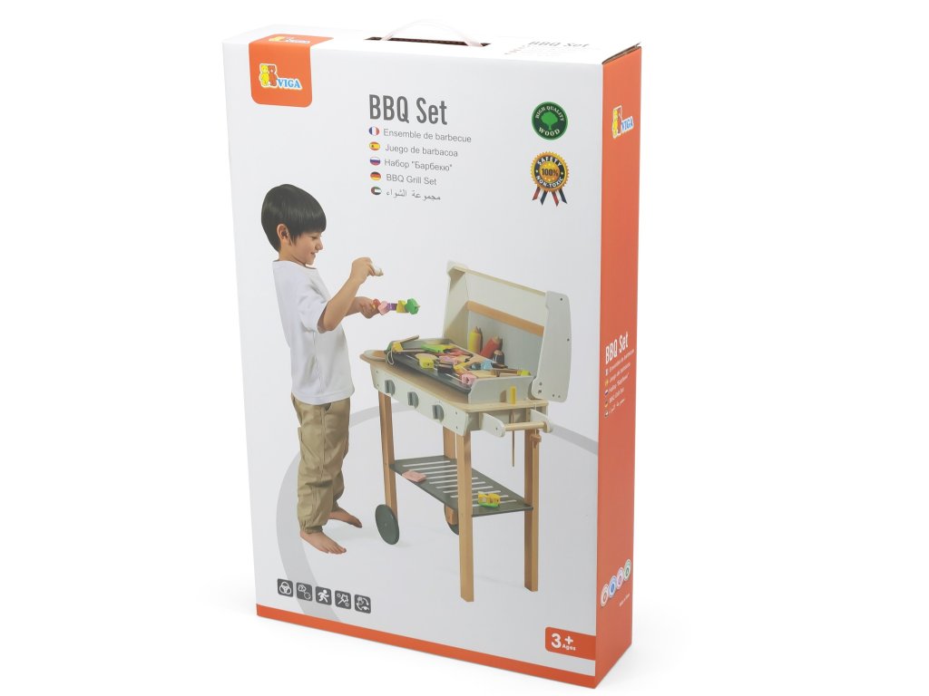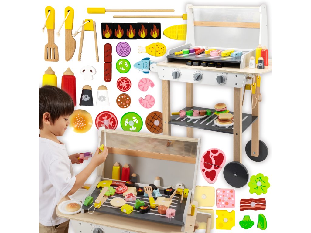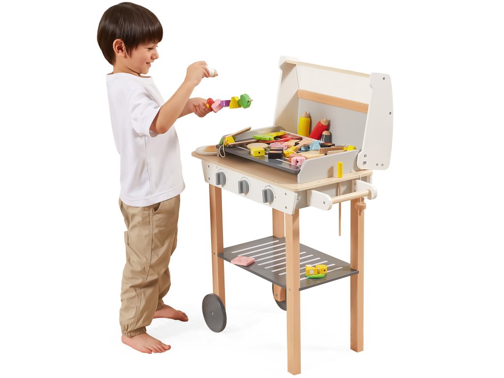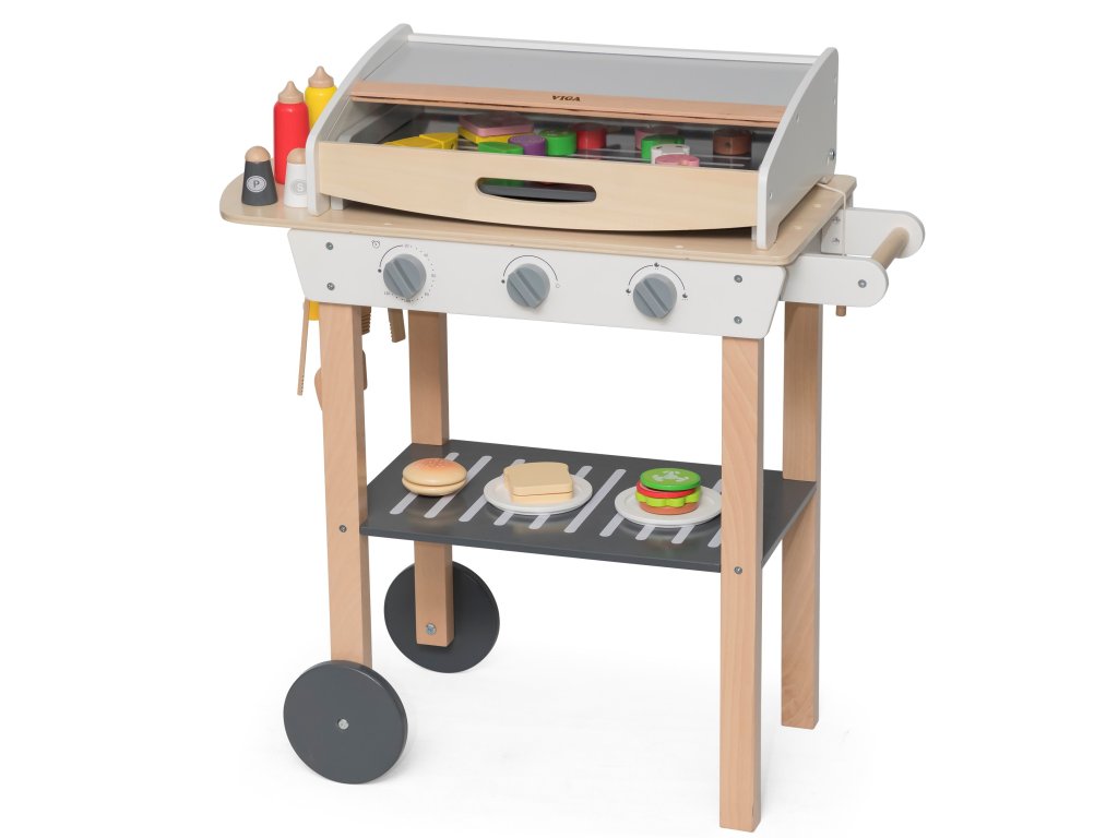 Drevený gril na grilovanieod značkyVIGA je ako skutočné grilovanie! Sada obsahuje47 príslušenstvoako sú nádoby s korením, kečup, horčica, kliešte, príbory atď. Realizmus je pridanýúčinkyzvuk. Deti si môžu vytvoriť špízy, sendviče, hamburgery. Odnímateľný kryt umožňuje chrániť "horúci" rošt po grilovaní akolesá a pohodlná rukoväť umožňujú prepravu grilu kdekoľvek na záhrade alebo v domácnosti. Vaše dieťa bude môcť prevziať úlohu dospelého, ktorý dohliada na rodinný gril.
