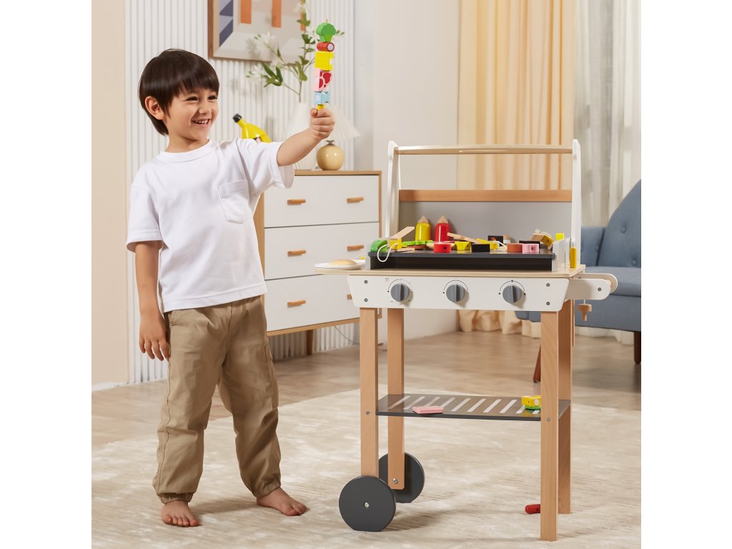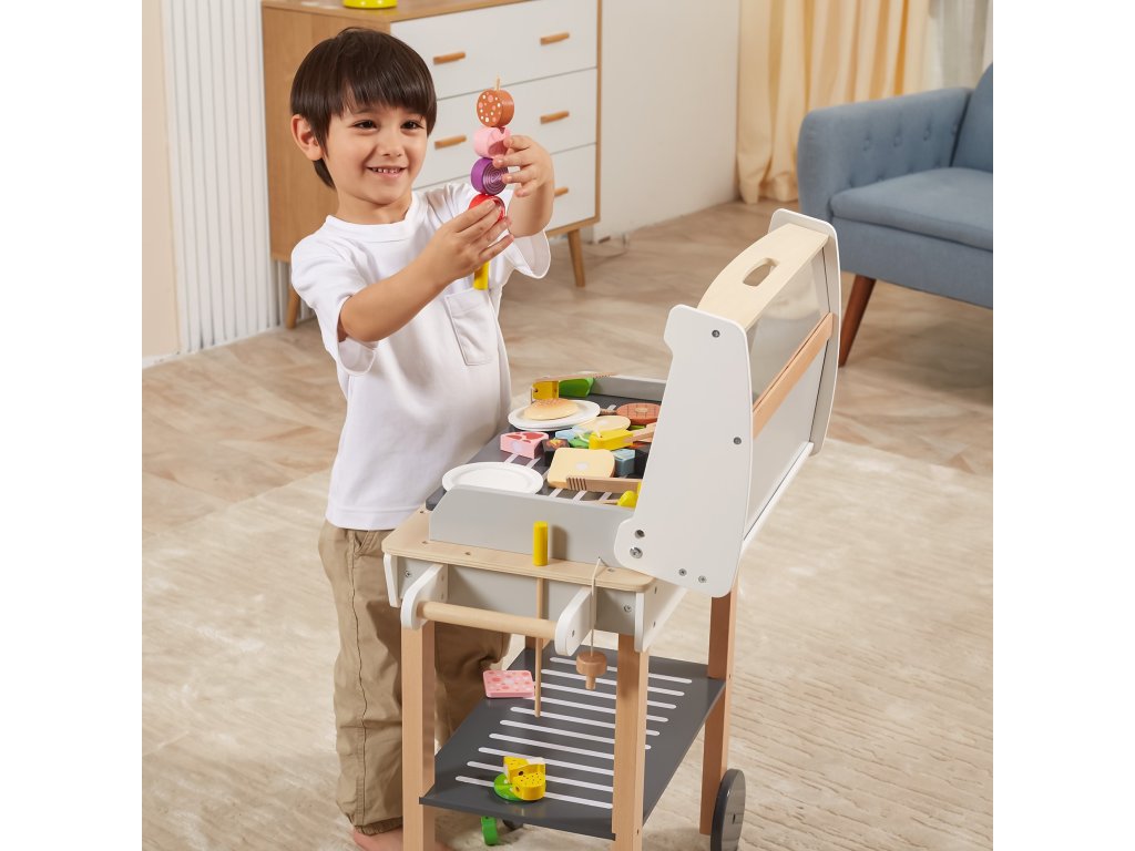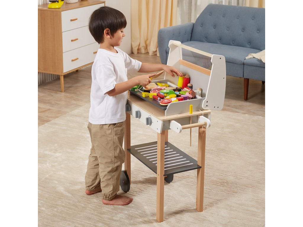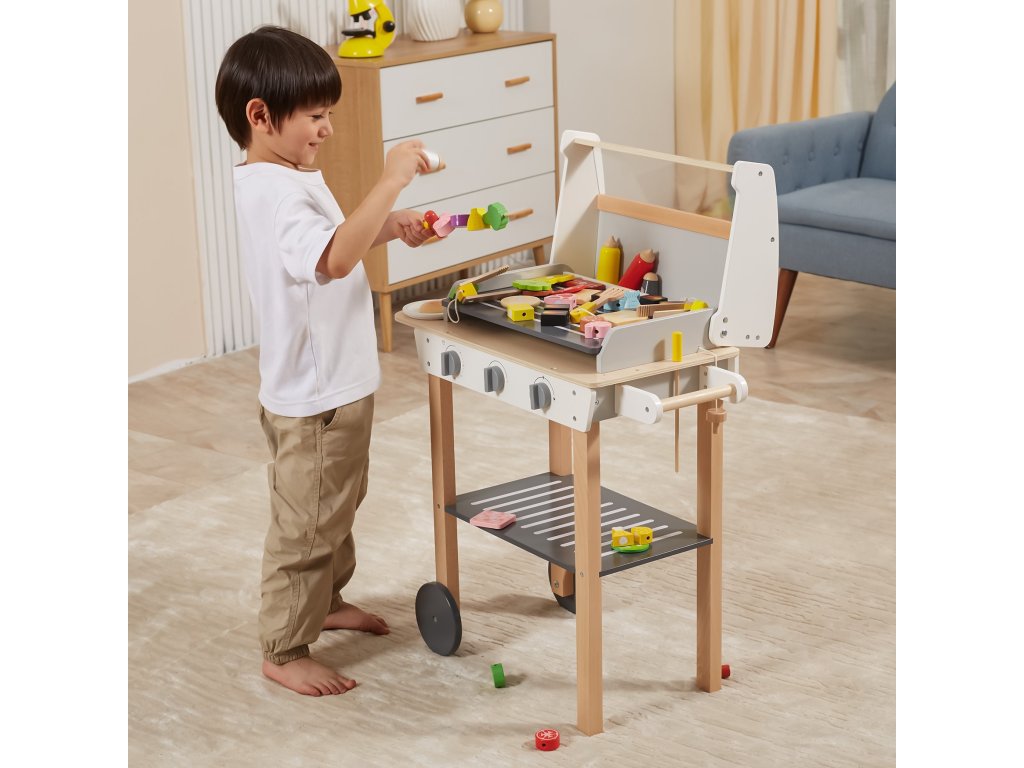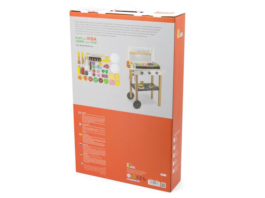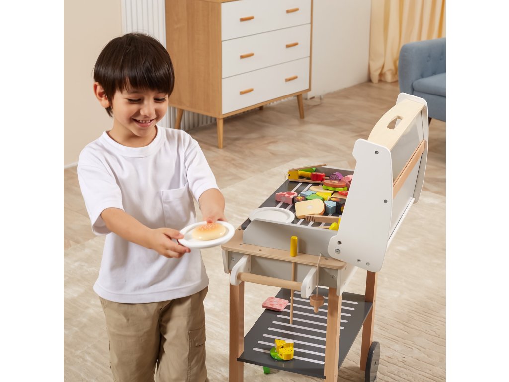 Drevený gril na grilovanieod značkyVIGA je ako skutočné grilovanie! Sada obsahuje47 príslušenstvoako sú nádoby s korením, kečup, horčica, kliešte, príbory atď. Realizmus je pridanýúčinkyzvuk. Deti si môžu vytvoriť špízy, sendviče, hamburgery. Odnímateľný kryt umožňuje chrániť "horúci" rošt po grilovaní akolesá a pohodlná rukoväť umožňujú prepravu grilu kdekoľvek na záhrade alebo v domácnosti. Vaše dieťa bude môcť prevziať úlohu dospelého, ktorý dohliada na rodinný gril.