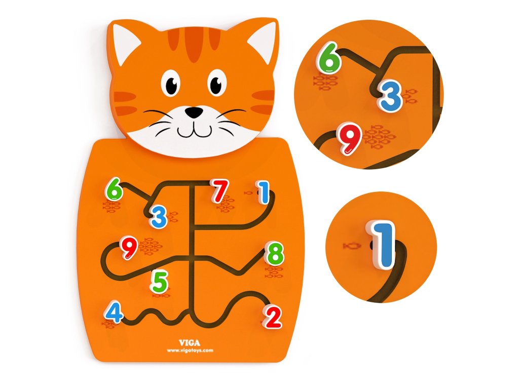 VIGA Drevená manipulačná doska Čísla Mačiatko FSC Montessori certifikát