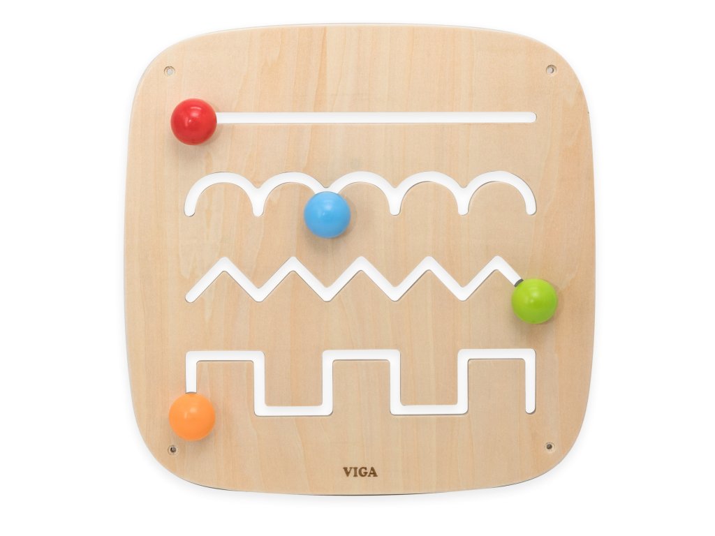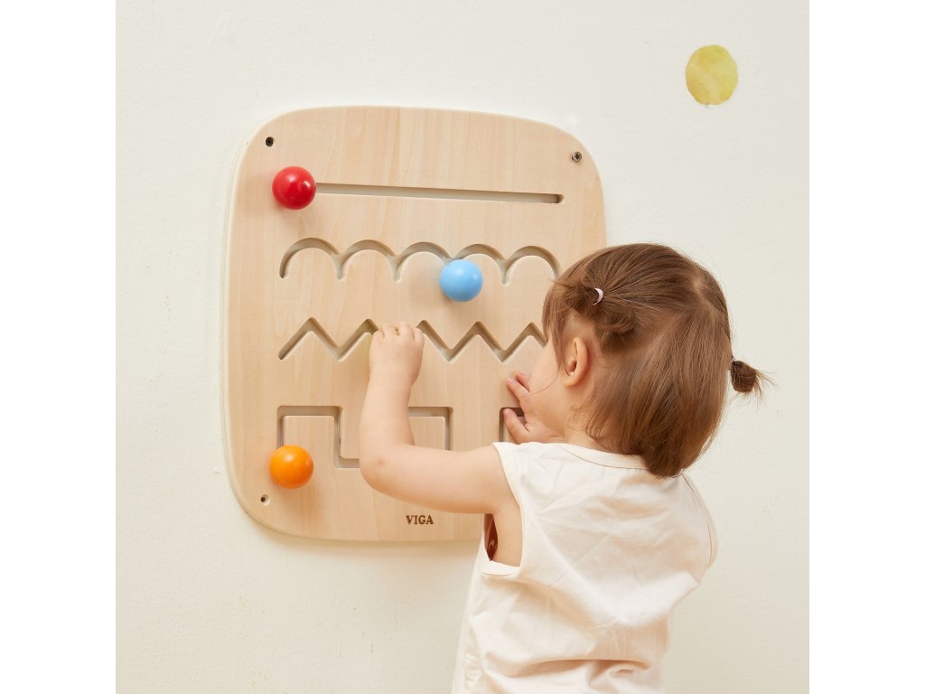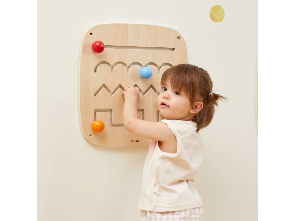 Tento drevenýmanipulačná doska je ideálny nástroj na učenie hrou, určený pre malé deti od12 mesiacov veku. Produktpomáha rozvíjať koordináciu oko-ruka a jemnú motoriku, ktoré interaktívnym spôsobom oboznamujú batoľatá s rôznymi líniami a tvarmi. Doska obsahuje štyri posuvné dráhy s rôznymi vzormi - rovné, vlnité, cik-cak a v tvare kvádra. Ku každej dráhe je pripojenáfarebná guľa s ľahko uchopiteľnou rukoväťou, navrhnutou s ohľadom na malé ruky. Pohybom loptičiek deti objavujú rôzne vlastnosti čiar, precvičujú si rozpoznávanie farieb anaučiť sa pojmy ako uhly a krivky. Tabuľu možno ľahko pripevniť na stenu a jej pevná drevená konštrukcia zaručuje odolnosť a bezpečnosť počas hry.