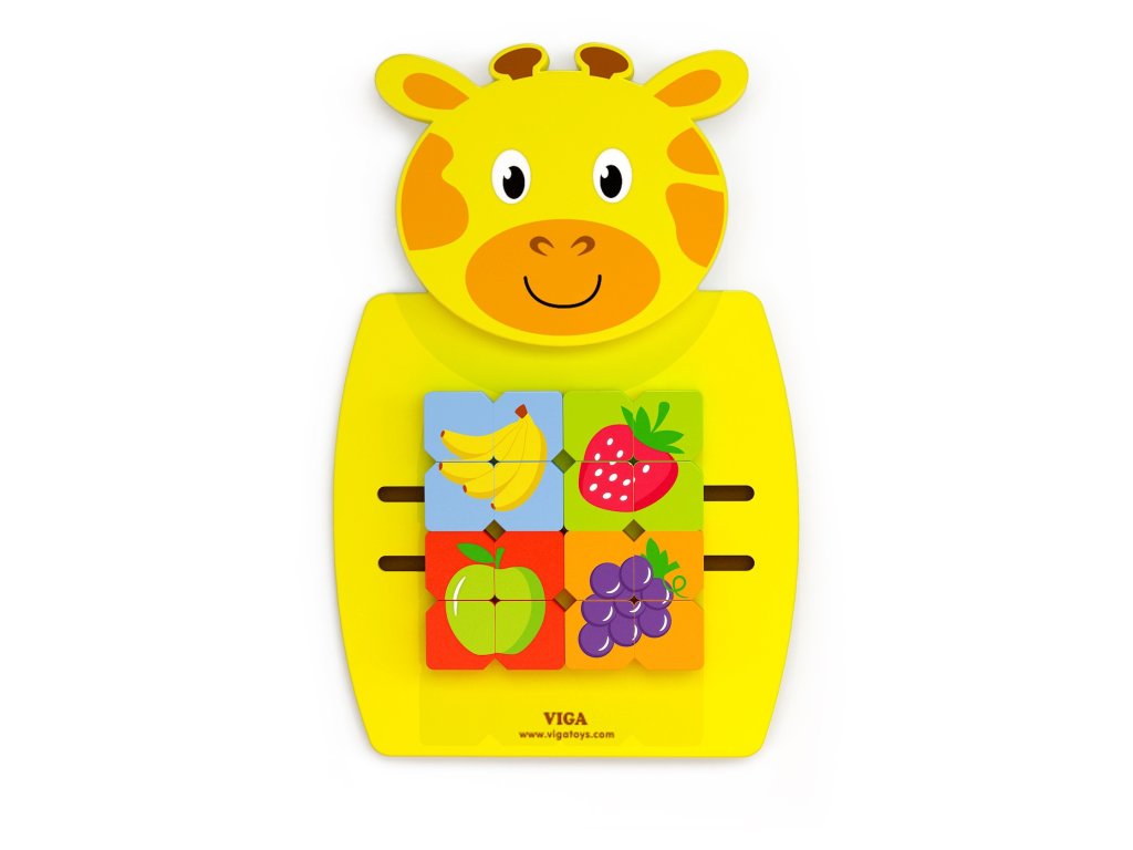 - - na paneli je vyobrazená veselá žirafa, ktorá má na bruchu skladačku s namaľovaným ovocím, ktoré sa pohybuje po hracej ploche.