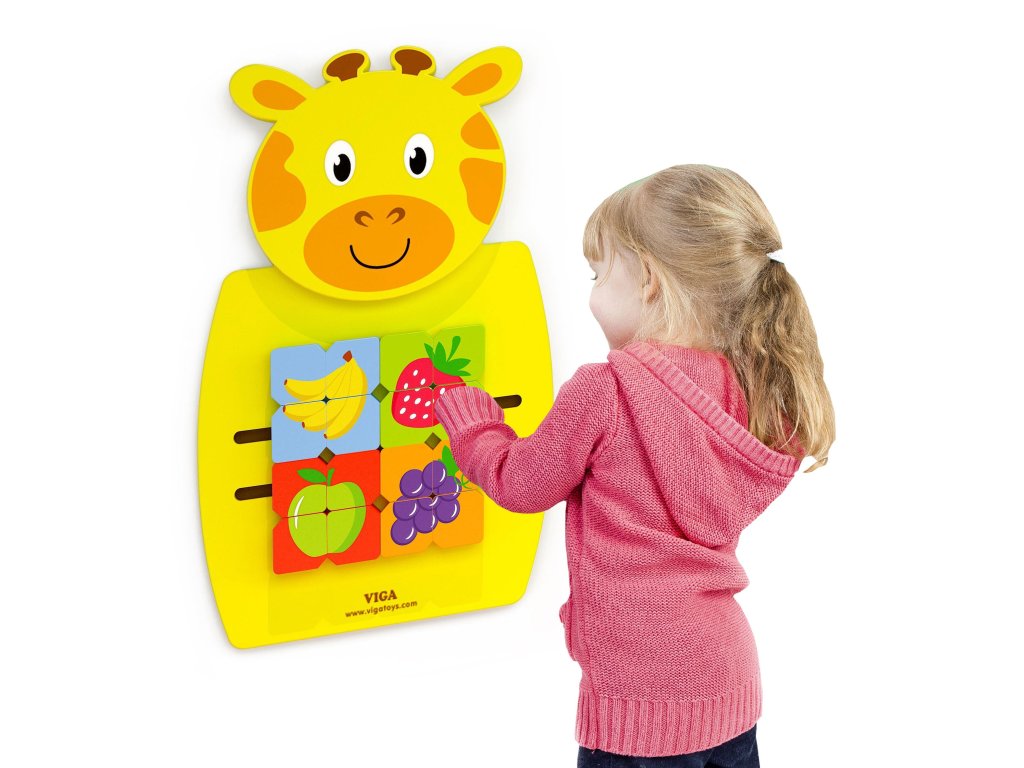 Závesný panel na stenezobrazujúci veselú žirafu je hračka od značkyHračky Vigaktorézabáva a učí. V bruchu žirafy súpuzzle zobrazujúce rôzne druhy ovocia. Dieťa ich posúva a objavuje, aké pochúťky sa v nich nachádzajú. Tabuľa obohatí dizajn detskej izby, materskej školy, detského ihriska, obchodu alebo ordinácie lekára.