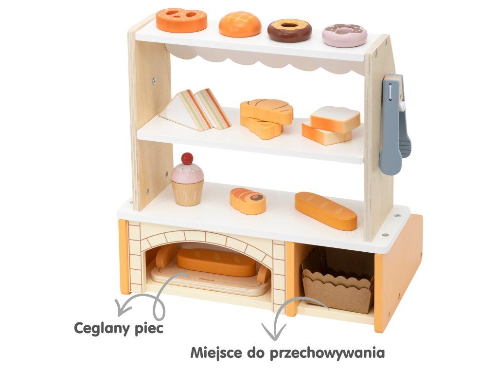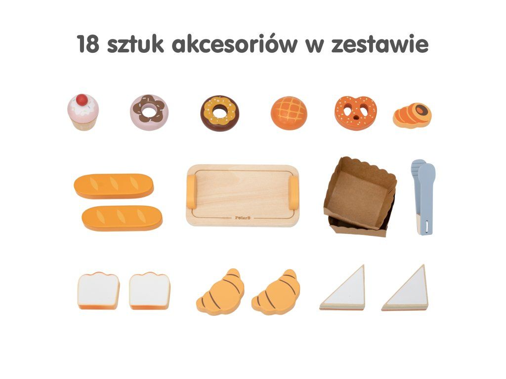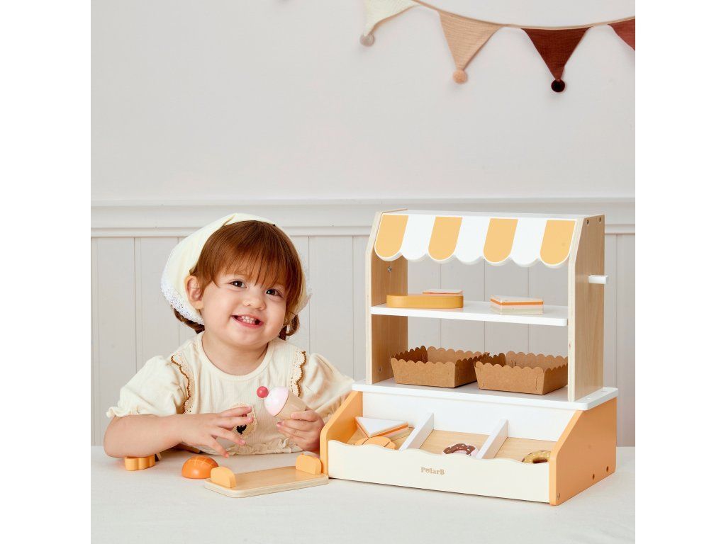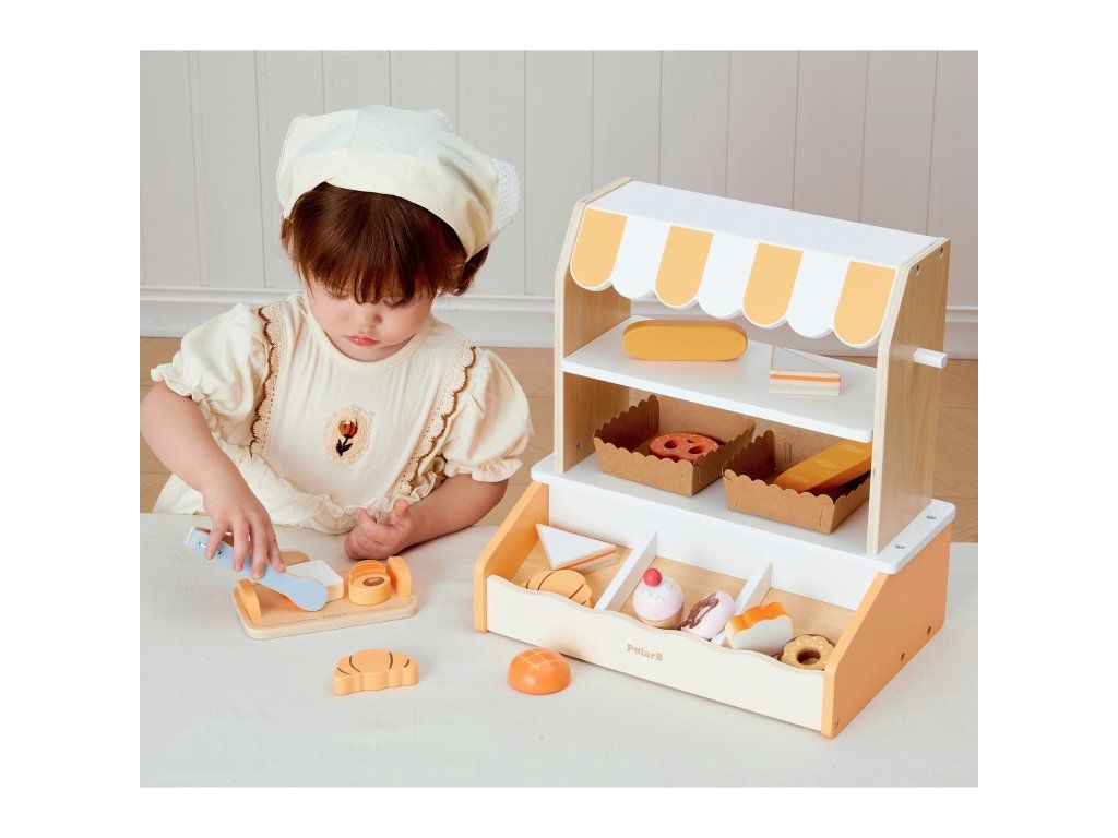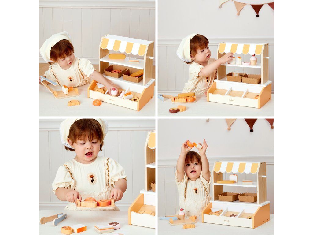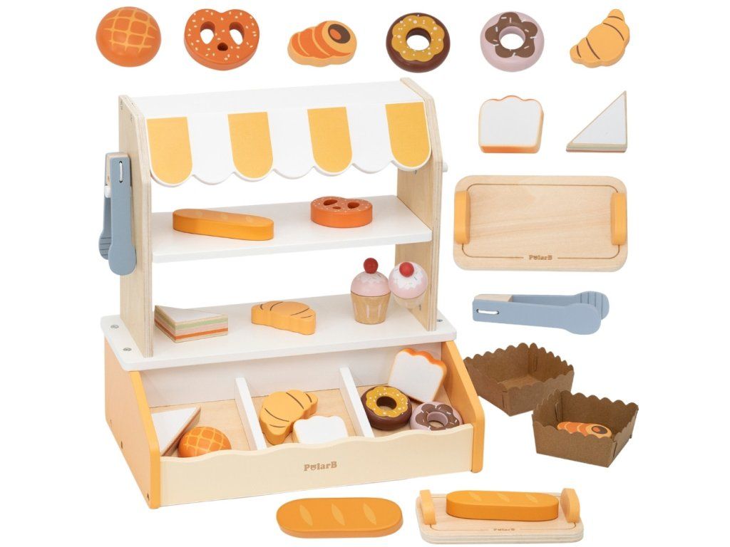 Tento očarujúci drevenýMini pekáreň značkyVIGA je dokonalá hračka na hranie rolí! Súprava obsahujerealistický stánok/stánok s pruhovaným štítom a16 kusov drevených doplnkov napodobňovanie chutného pečiva. Deti môžu prevziať úlohu skutočnéhopekár alebo predajca, kde sa zákazníkom podávajú croissanty, šišky, toasty, muffiny a mnohé ďalšie pochúťky. Stánok je vybavenýdve výstavné police, špeciálnemiesto na chlieb (imitácia murovanej pece) akliešte uplatniť, čo hre dodáva na autenticite. Vďaka jemnej pastelovej farebnosti (prírodné drevo, biela a odtiene oranžovej/žltej) vyzerá pekáreň krásne v každej detskej izbe. Hra na pekáreň dokonalerozvíja kreativitu a sociálne zručnosti prostredníctvom interakcie a podporymotorický vývoj manipuláciou s malými dielmi a kliešťami.