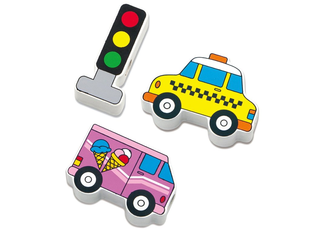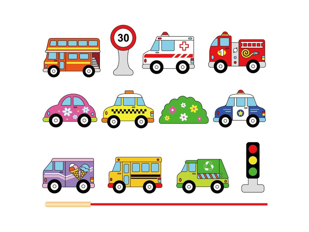 Sada obsahuje 12 prvkov vrátane: autobusov, farebných áut, policajného auta, dopravnej značky, semaforov a ďalších. Hračka stimuluje predstavivosť, precvičuje manuálne a vizuálne zručnosti.