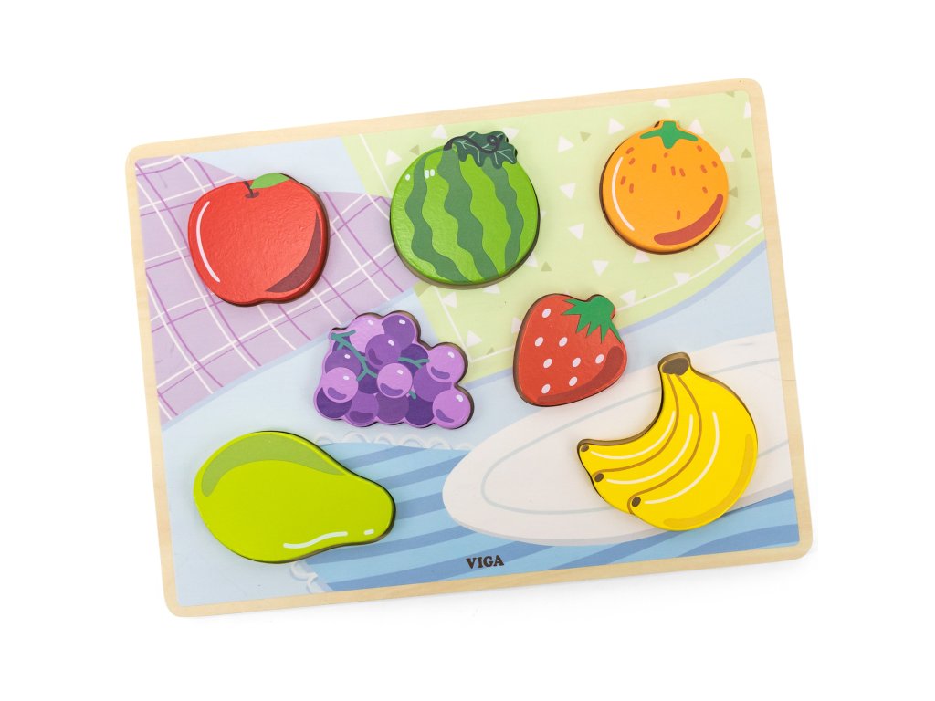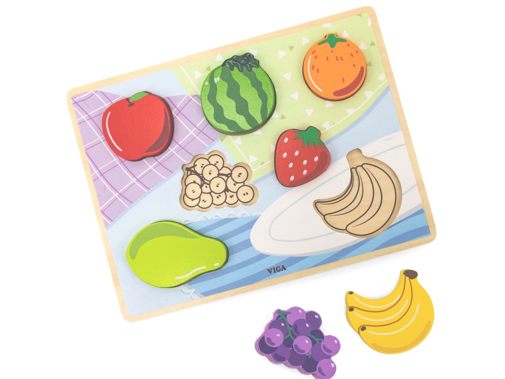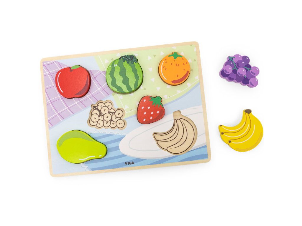 VIGA Drevené puzzle Montessori Puzzle 2v1 Figúrky Ovocie