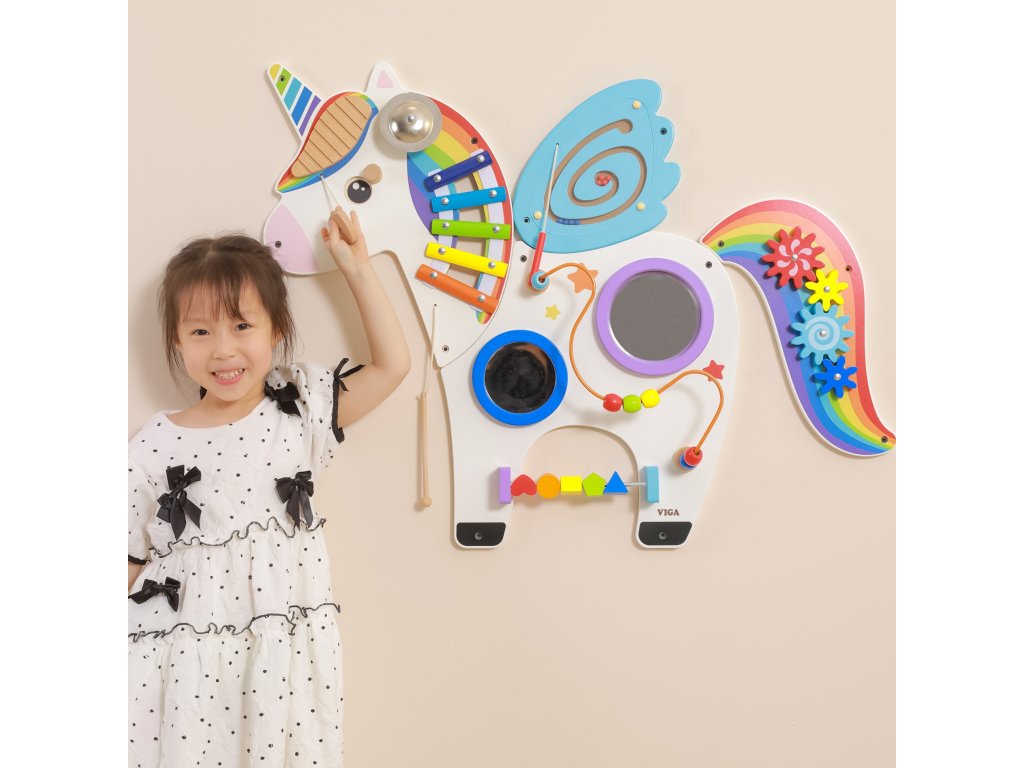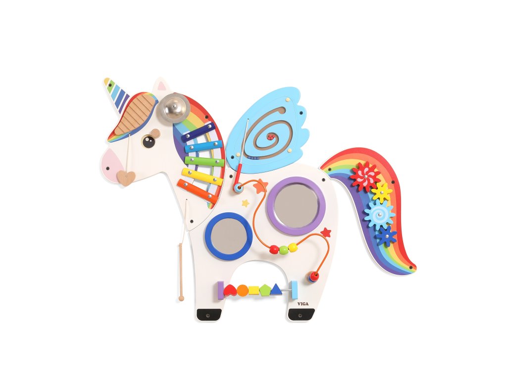 VIGA Drevený jednorožec Manipulačná senzorická doska FSC Montessori certifikát
