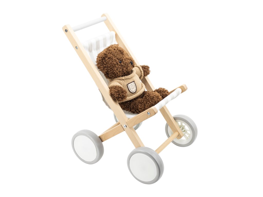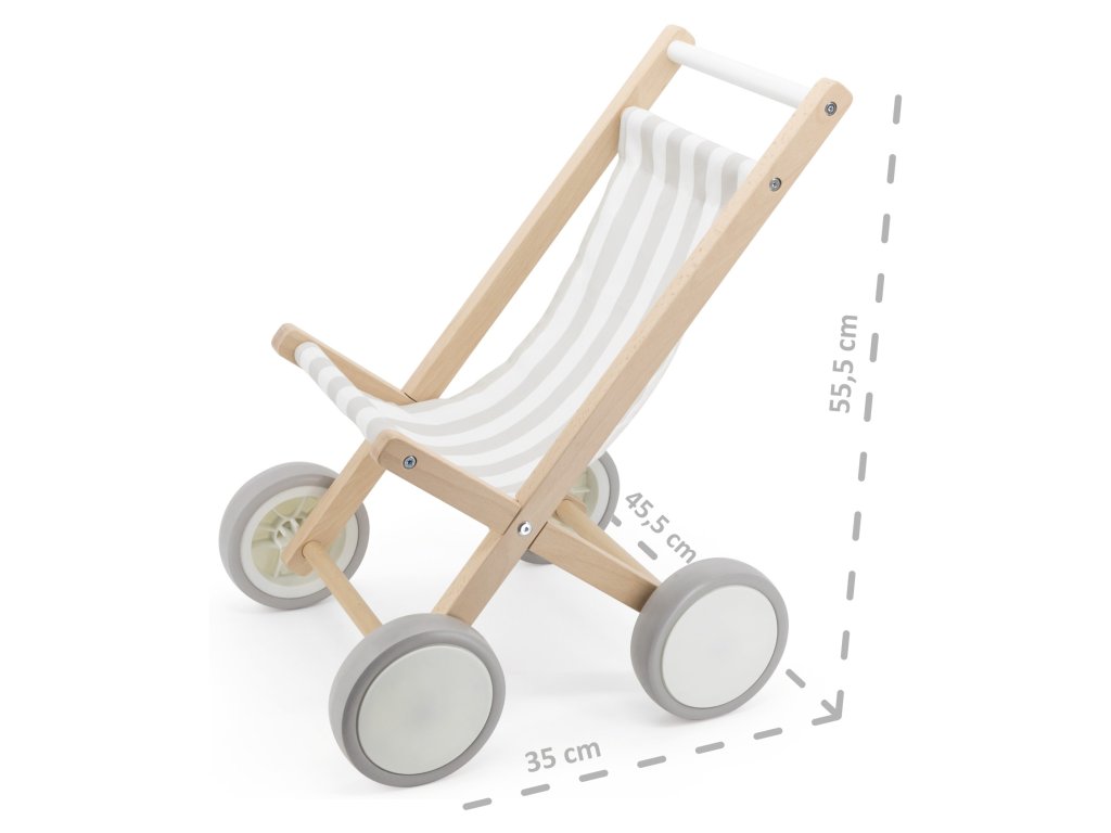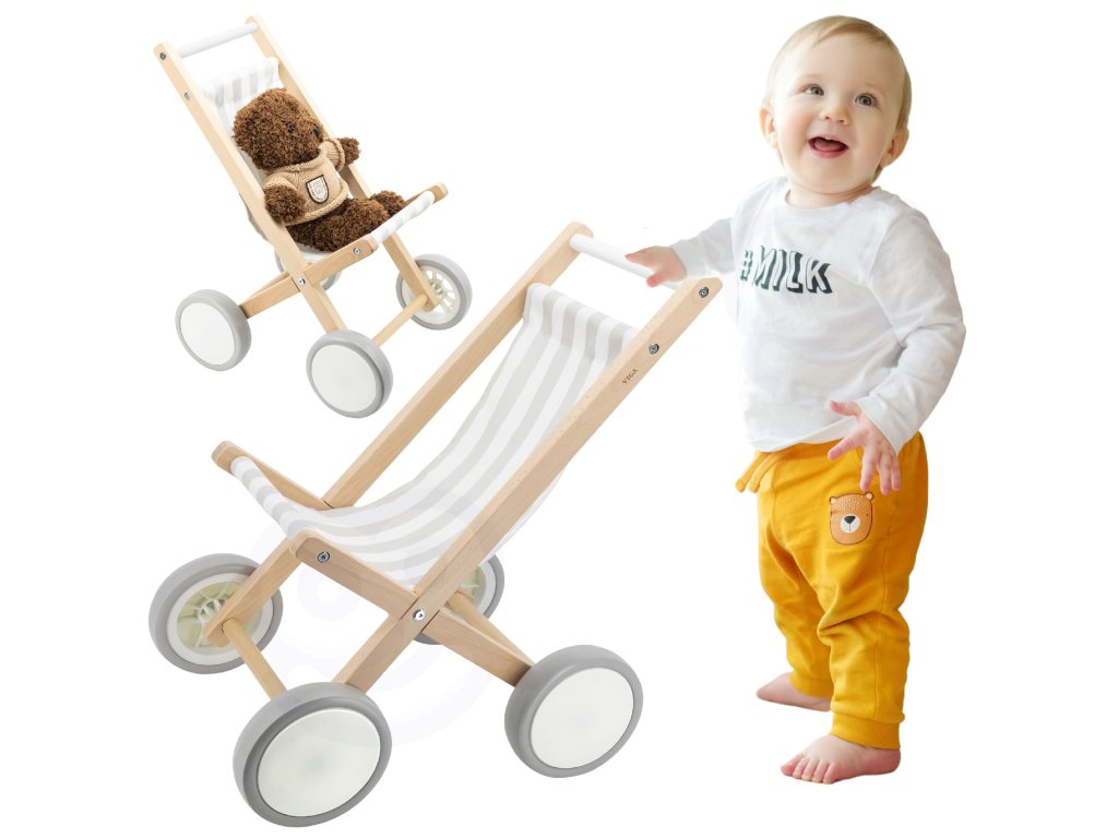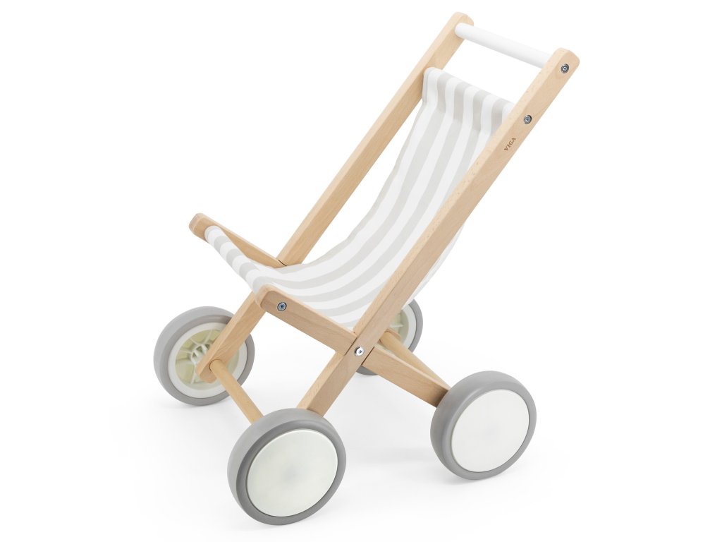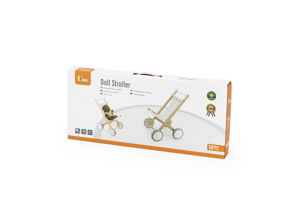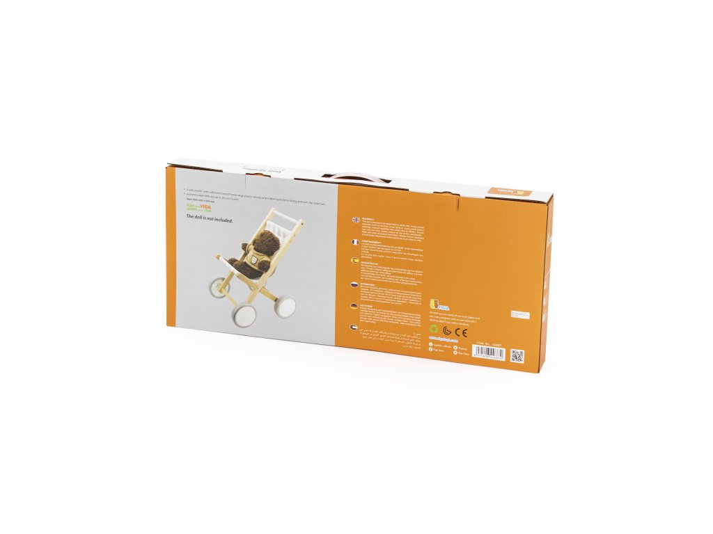 Kočík pre bábiky od značkyVIGA vyrobené zrobustný bukové drevo, sveľké plastové kolesá a gumové kolesá,protišmykové pneumatiky. Je určený pre bábiky veľkostido 38 cm.