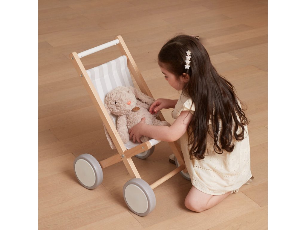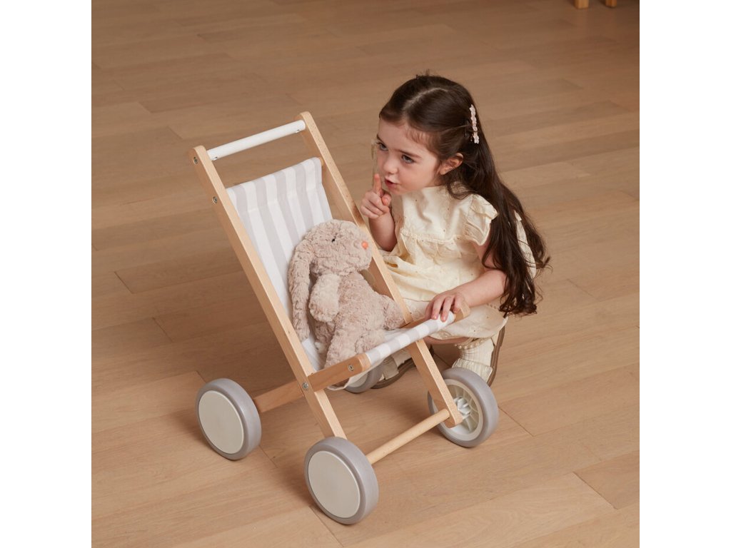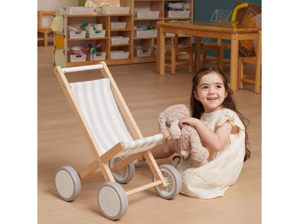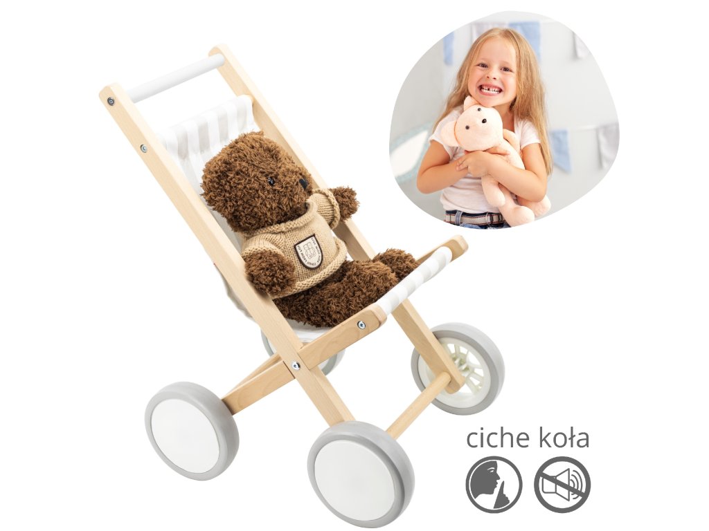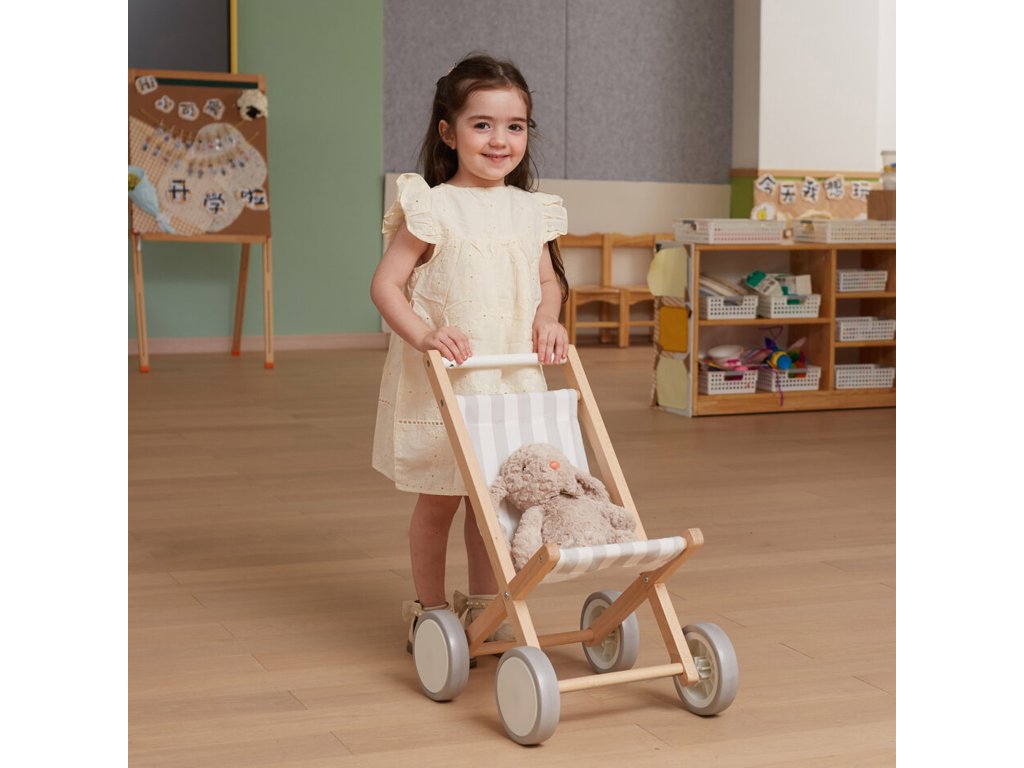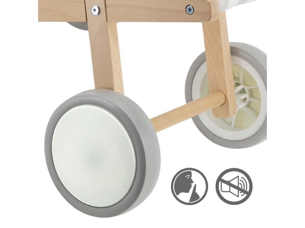 Kočík pre bábiky od značkyVIGA vyrobené zrobustný bukové drevo, sveľké plastové kolesá a gumové kolesá,protišmykové pneumatiky. Je určený pre bábiky veľkostido 38 cm.