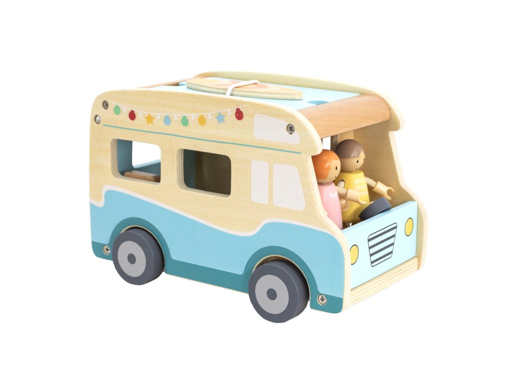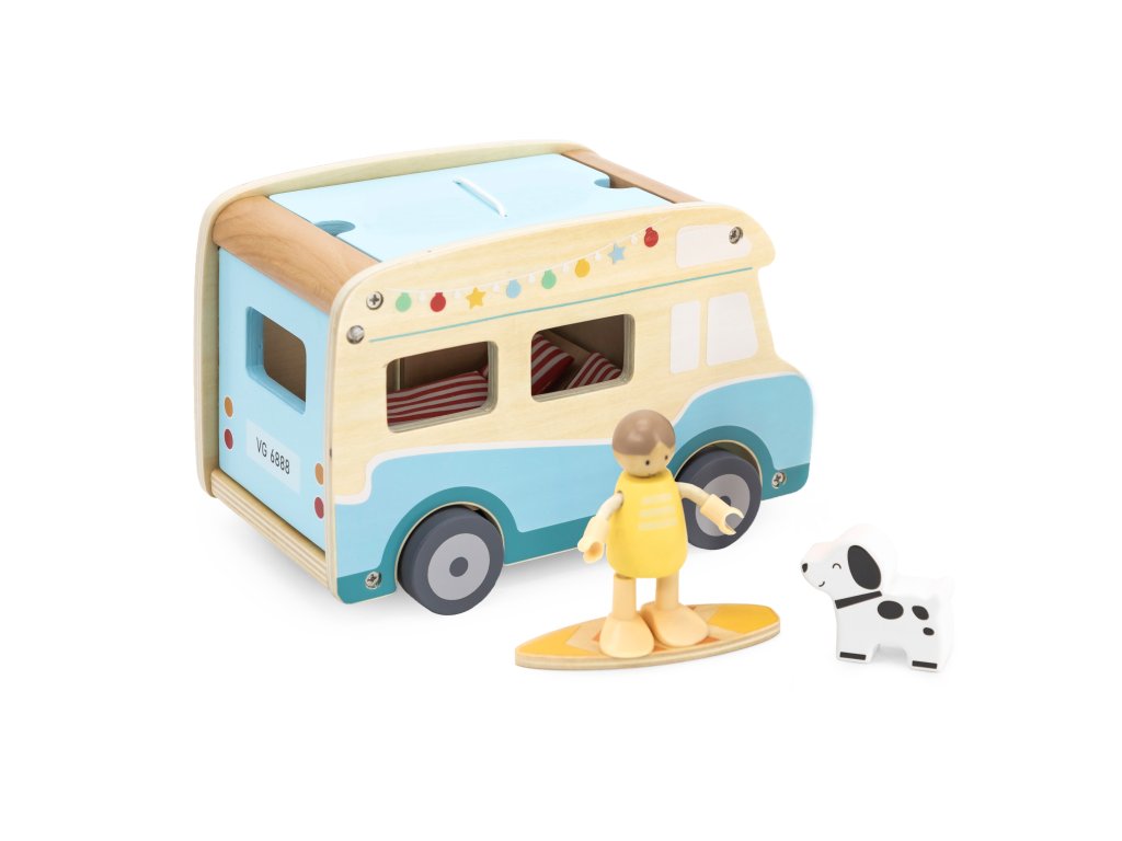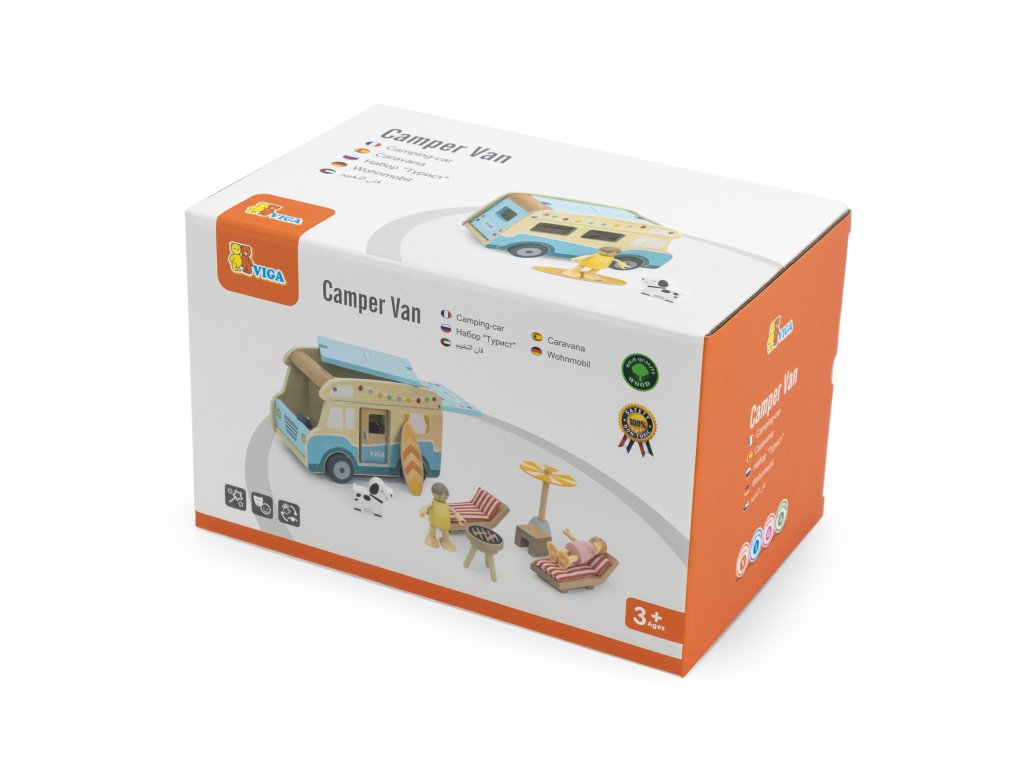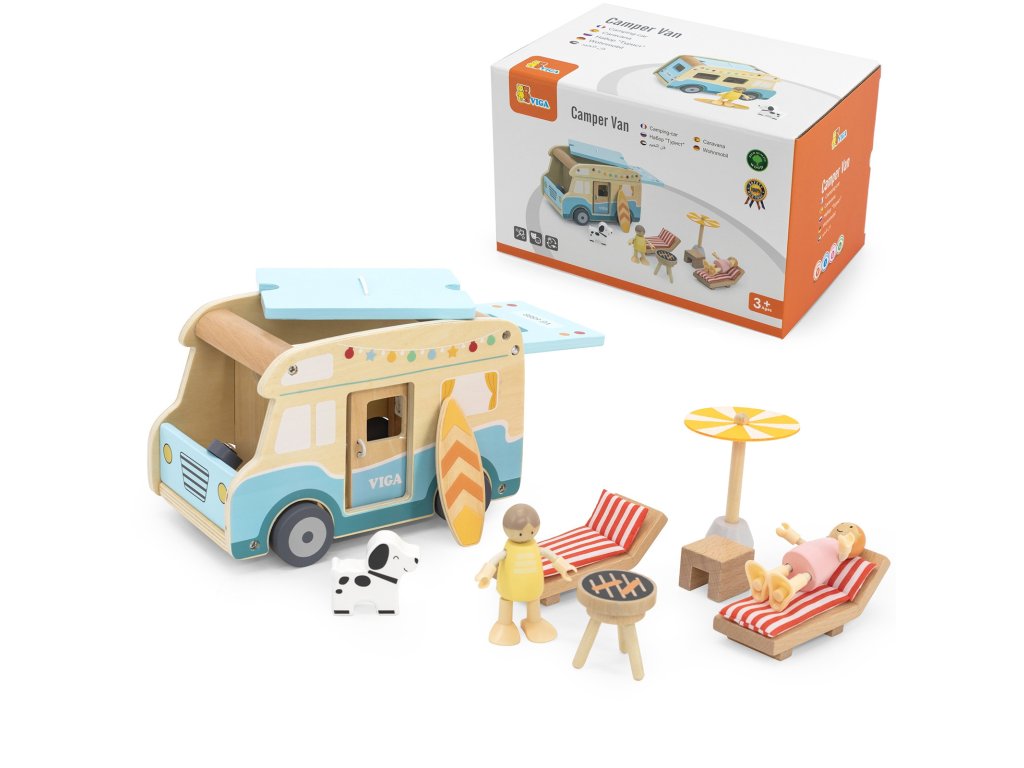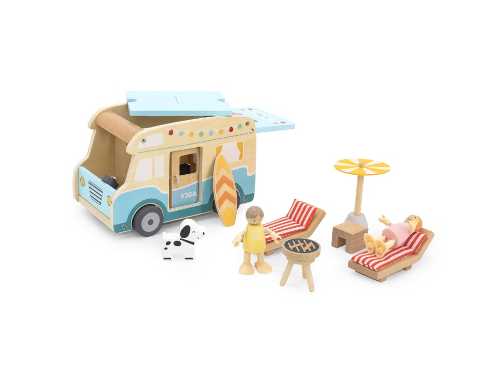 Poďme na cestu s touto plážoukaravan od značkyViga. Auto kompletné s 2 postavami, 2 lehátka s mäkkými vankúšmi, stôl, gril, slnečník, surf, WC a psík. Vybavené posuvnými dverami, zdvíhacou strechou, držiakom na surfovacie dosky a ľahko otvárateľným kufrom.