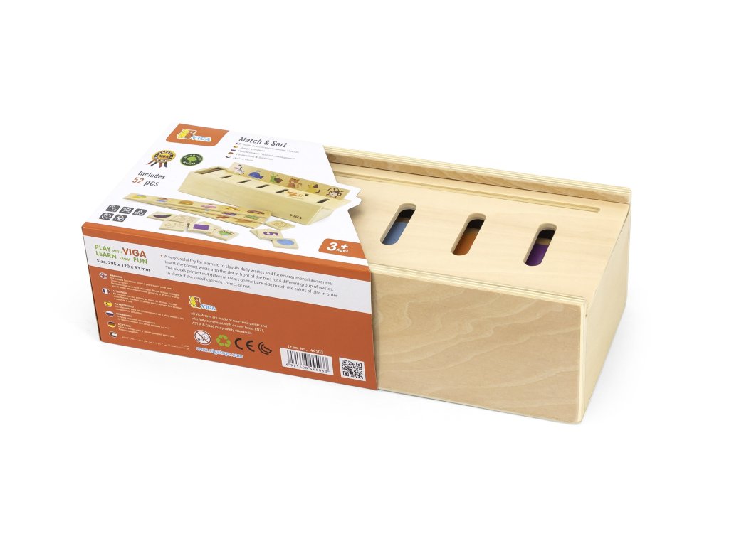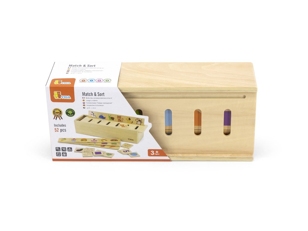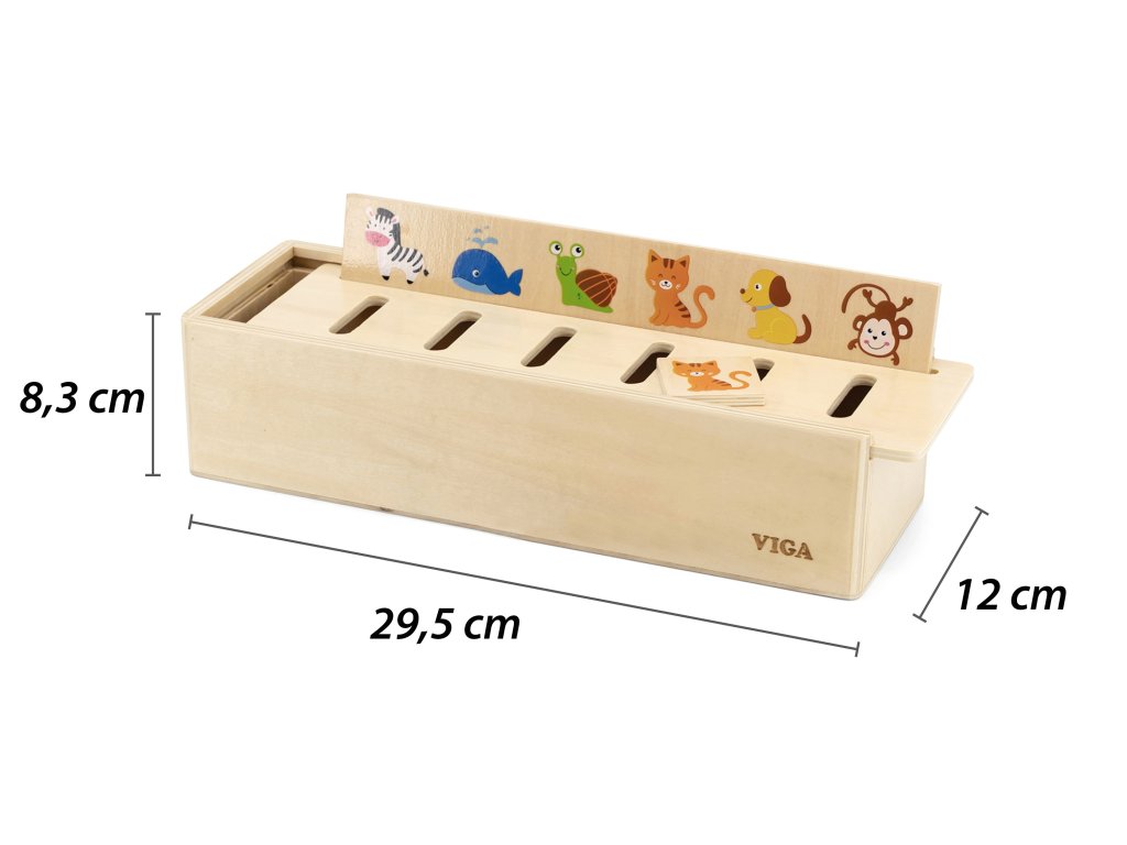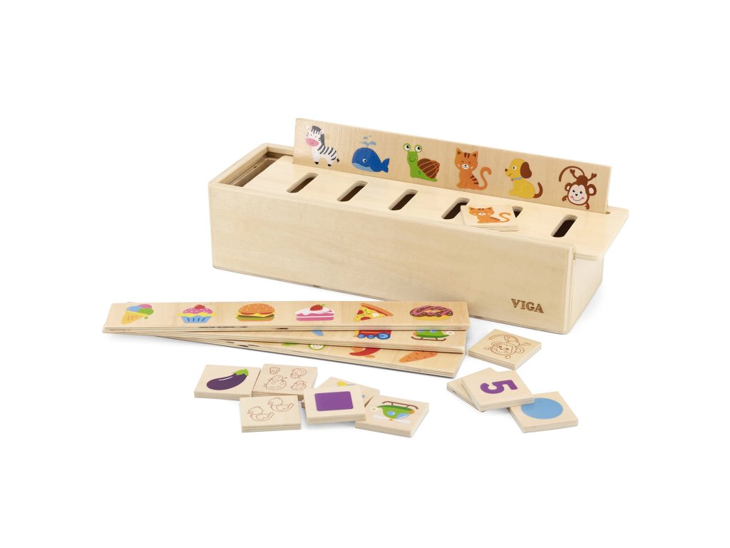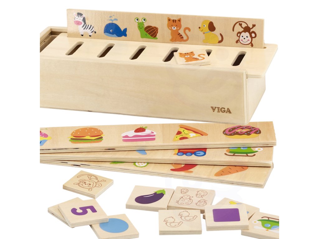 Drevený vzdelávací triedič od renomovanej značky VIGA je ideálnou hračkou pre deti, ktoré začínajú objavovať svet. Pekná, kvalitná drevená krabička má na odnímateľnom veku 6 priehradiek, do ktorých sa vhadzujú drevené kocky s príslušnou kategóriou. Súprava obsahuje 4 dlhé dosky a 48 kusov drevených kociek s kategóriami zelenina, ovocie, doprava, tvary, zvieratá a čísla. Položte jednu z dosiek na veko a potom nájdite zodpovedajúci obrázok, ktorý vložte do príslušnej priehradky. S touto hrou sa vaše dieťa naučí základnémateriály z každodenného života a naučiť sa ich kategorizovať.