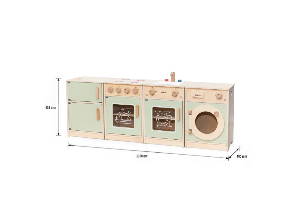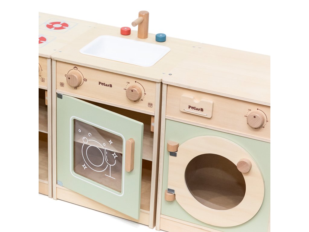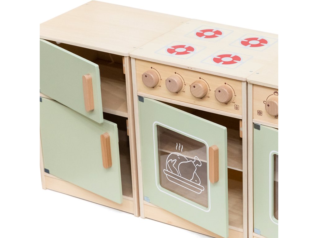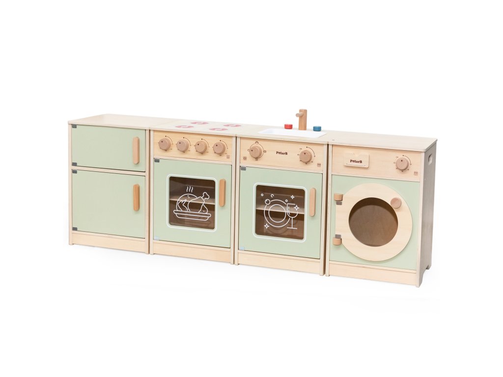 Veľké drevená kuchynská súprava pre batoľatá od značkyViga je špeciálne navrhnutá súprava, ktorá vášmu dieťaťu poskytne nezabudnuteľné chvíle zábavy!Súprava obsahuje zahŕňa chladničku, sporák s rúrou, drez, umývačku riadu a práčku.Silné rukoväte uľahčiť otváranie a zatváranie dverí a všetkygombíky vydávajú zvuk pri otáčaní cvaká. Krásne pastelové farbyprilákať pozornosť dieťa a zároveň pôvabnú dekoráciu do izby. Súprava jeúplne bezpečné pre najmenších, nemá žiadne ostré hrany ani okraje. Hračkárska kuchynka je určená pre detia centrum kreatívnych hierktorá rozvíja predstavivosť, schopnosť spolupráce a motoriku. Batoľa môže hrať scénky pre dospelých, pripravovať jedlo pre svojich blízkych a cvičiť sa v samostatnosti. Je to skvelý spôsob, ako interaktívne učiť deti o jedle, varení, počítaní, farbách a tvaroch. Táto hračka navyše môže rásť spolu s vaším dieťaťom a rôzne doplnky umožňujú rozmanitosť hry!