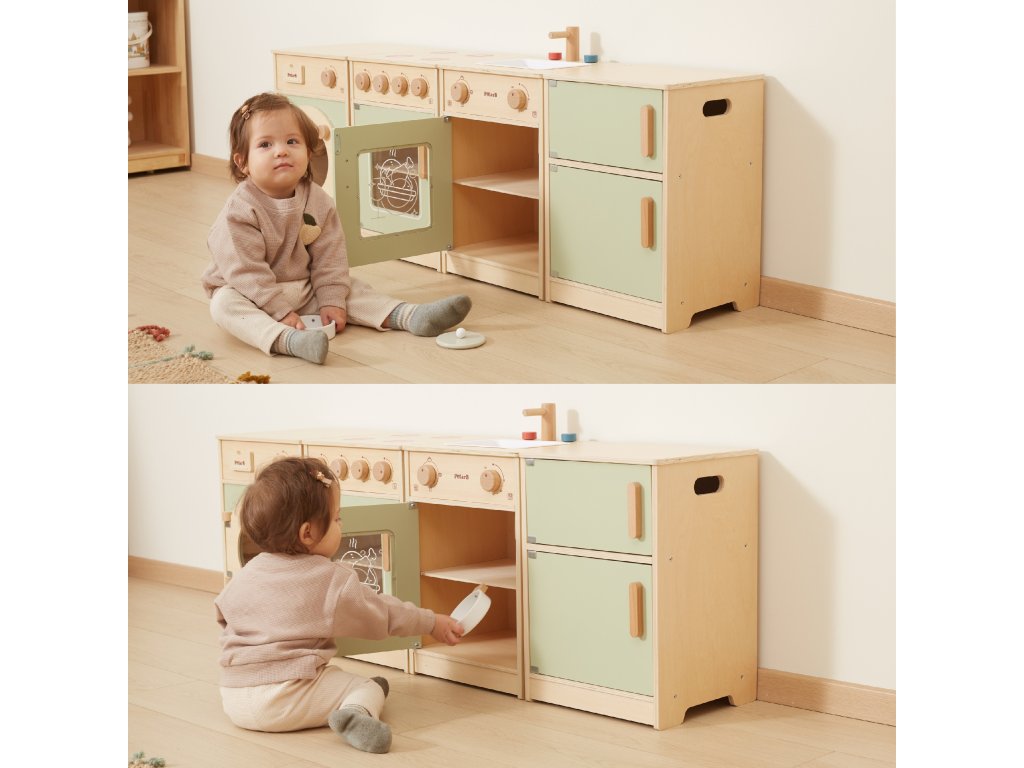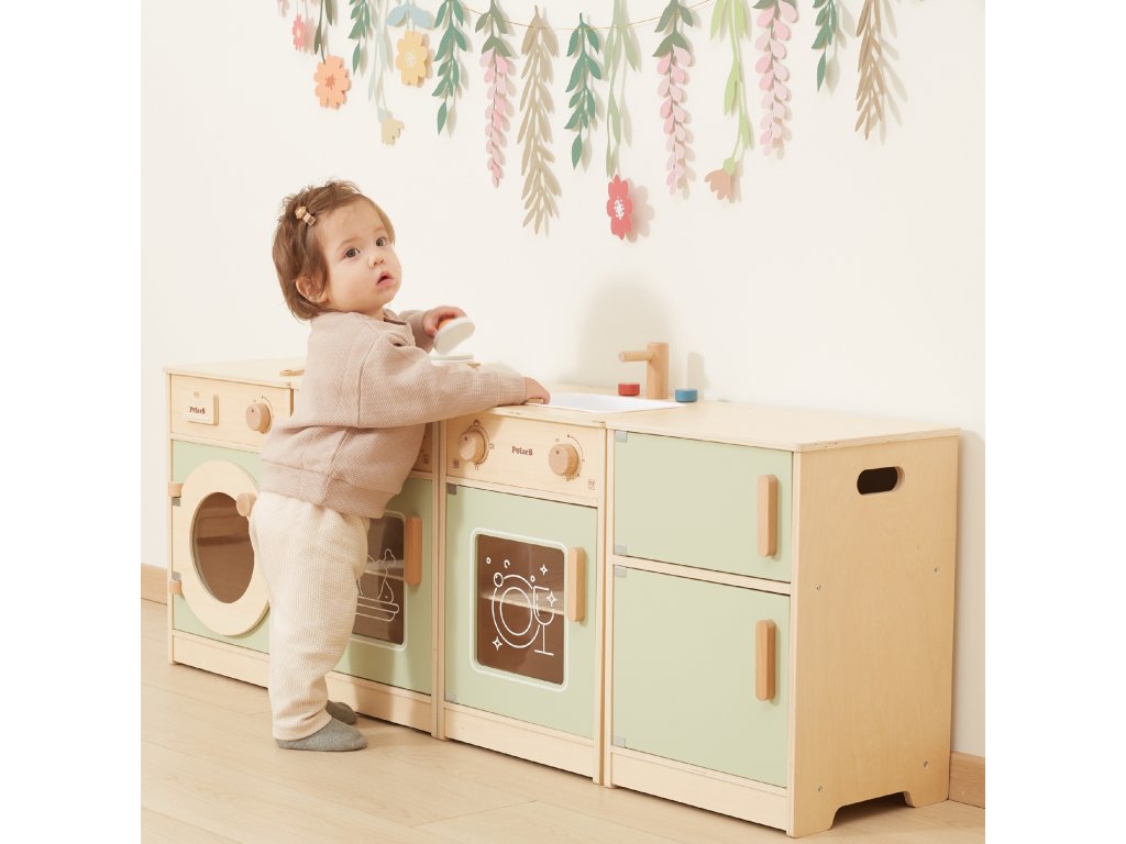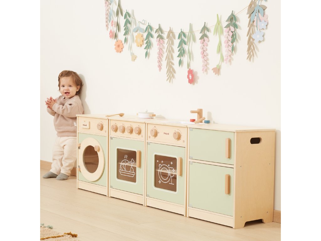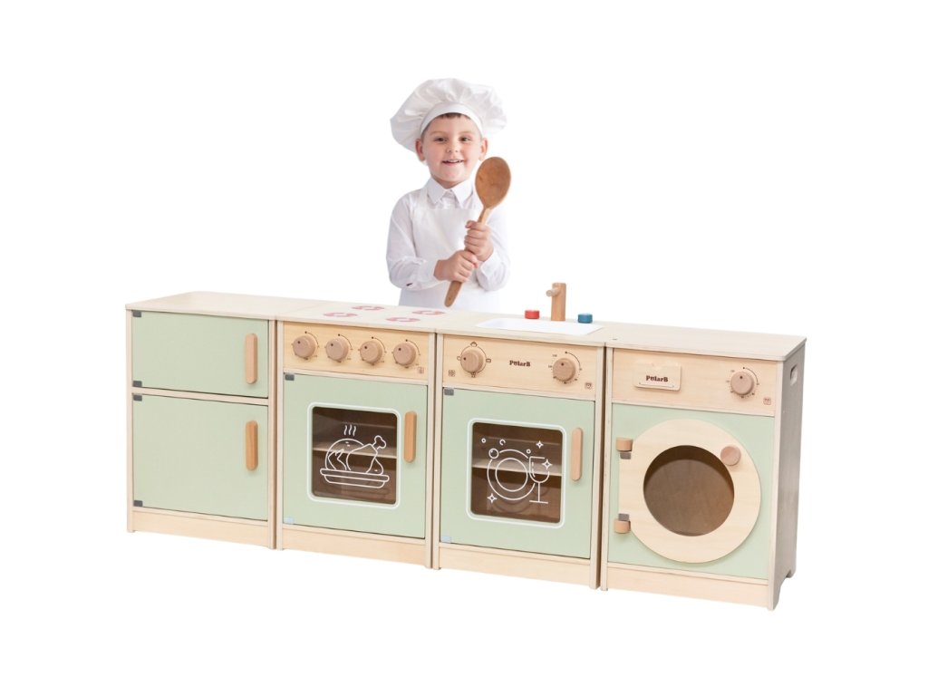Veľké drevená kuchynská súprava pre batoľatá od značkyViga je špeciálne navrhnutá súprava, ktorá vášmu dieťaťu poskytne nezabudnuteľné chvíle zábavy!Súprava obsahuje zahŕňa chladničku, sporák s rúrou, drez, umývačku riadu a práčku.Silné rukoväte uľahčiť otváranie a zatváranie dverí a všetkygombíky vydávajú zvuk pri otáčaní cvaká. Krásne pastelové farbyprilákať pozornosť dieťa a zároveň pôvabnú dekoráciu do izby. Súprava jeúplne bezpečné pre najmenších, nemá žiadne ostré hrany ani okraje. Hračkárska kuchynka je určená pre detia centrum kreatívnych hierktorá rozvíja predstavivosť, schopnosť spolupráce a motoriku. Batoľa môže hrať scénky pre dospelých, pripravovať jedlo pre svojich blízkych a cvičiť sa v samostatnosti. Je to skvelý spôsob, ako interaktívne učiť deti o jedle, varení, počítaní, farbách a tvaroch. Táto hračka navyše môže rásť spolu s vaším dieťaťom a rôzne doplnky umožňujú rozmanitosť hry!
