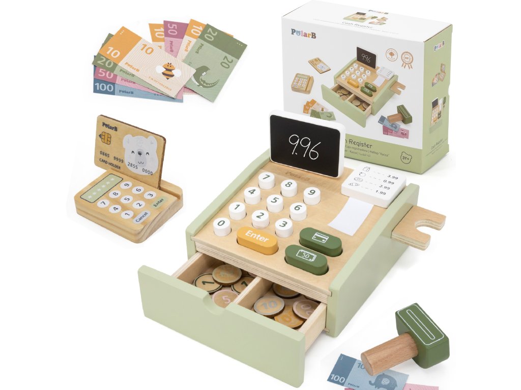 Hotovosť pokladňa obchoduje skvelá drevená hračka, ktorá vám umožní zahrať si množstvo scén, ktoré sa môžu odohrať v obchode. Deti môžu prevziať rolu pokladníka alebo zákazníka a spoločne si precvičiť sociálna interakciaa ich komunikačné zručnostihotovosť alebo karta? Spočítajte dlžnú sumu, prijmite peniaze a správne minite drobné. Pokladňa Obsahuje bankovky, mince a platobnú kartu. Dieťa sa môže učiť počas hry! Kráľovná vied - Matematika už nebude desivé.