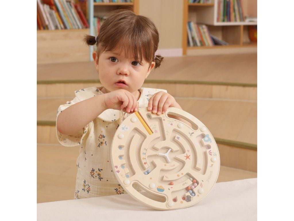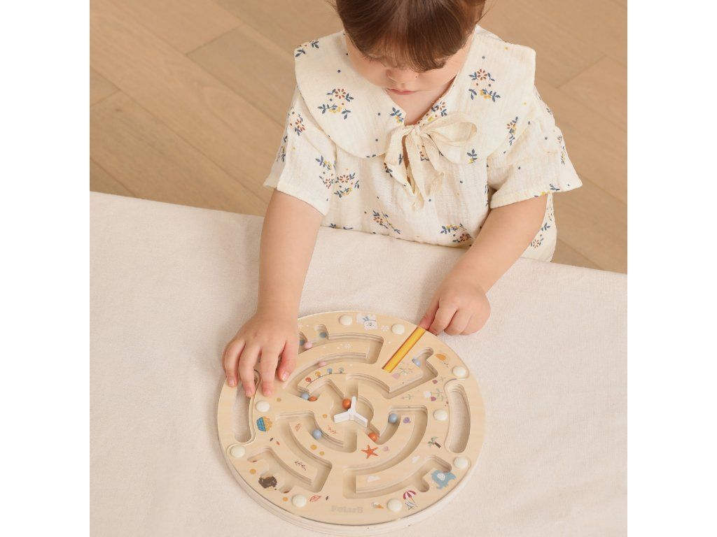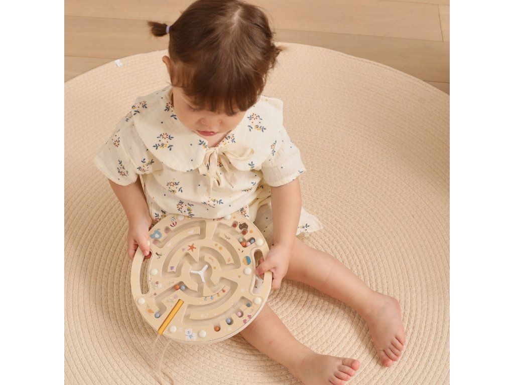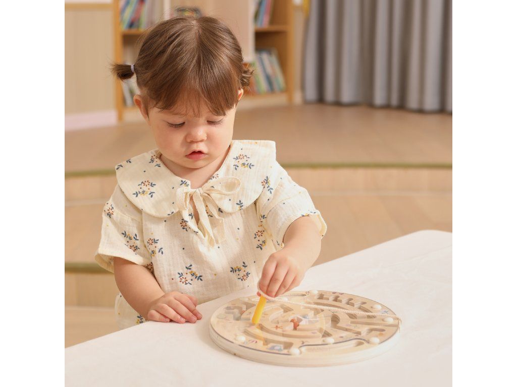 Magnetické bludisko od značkyVIGA Je vyrobená z masívneho dreva a zdobená pôvabnými ilustráciami znázorňujúcimi 4 ročné obdobia a poskytuje nielen skvelú zábavu, ale podporuje aj rozvoj manuálnych zručností a logického myslenia. Vďaka magnetickému stylusu môže dieťa pohybovať farebnými guľôčkami v bludisku, čím si precvičuje koordináciu ruka-oko.