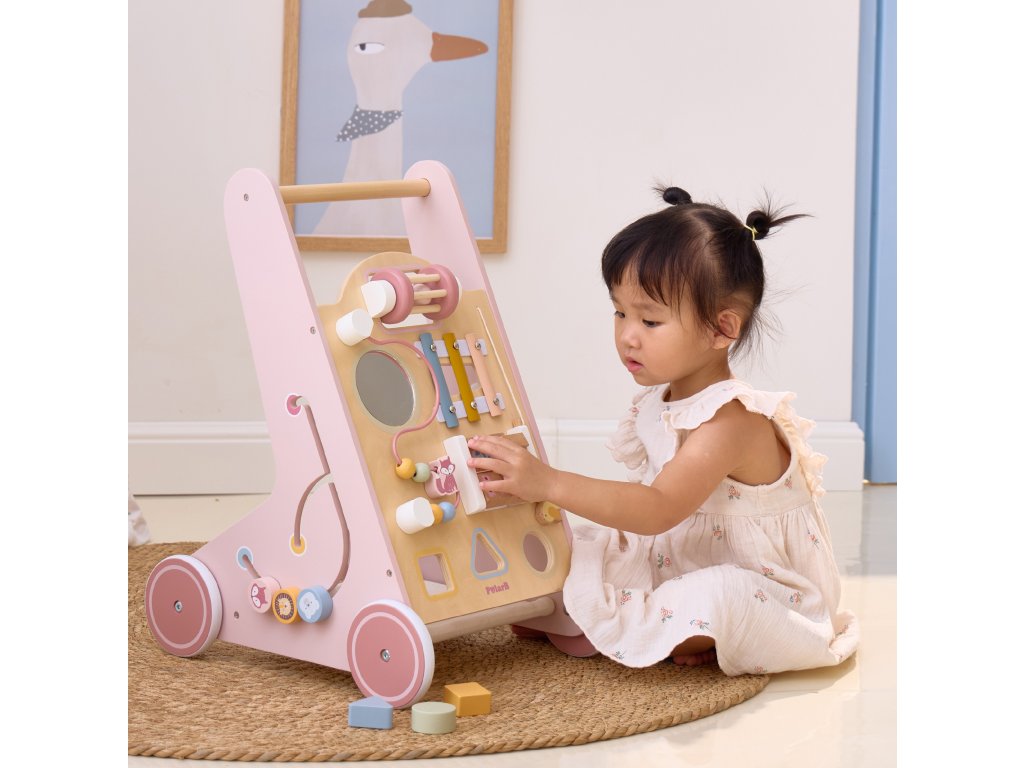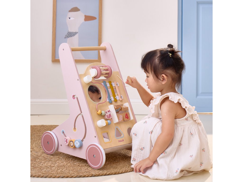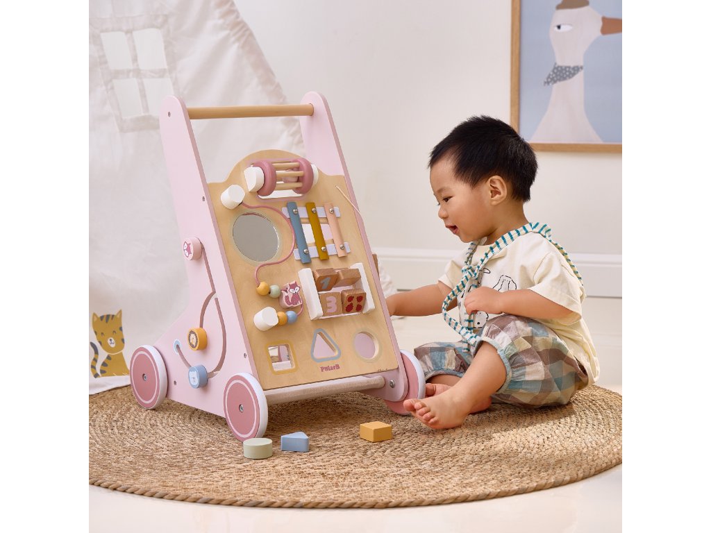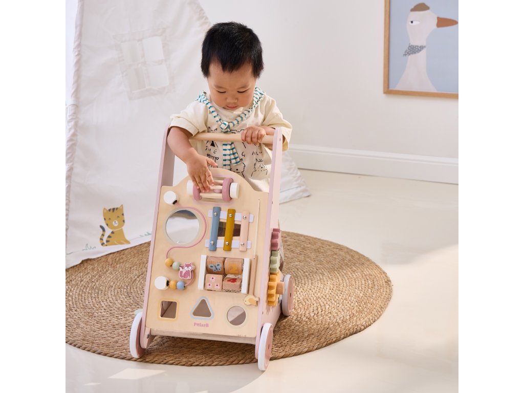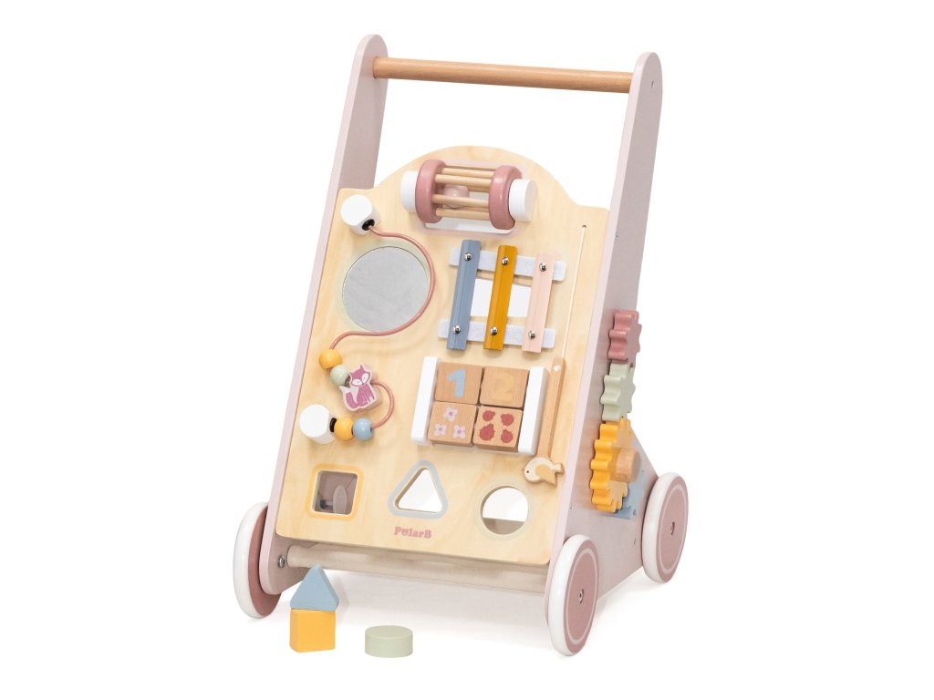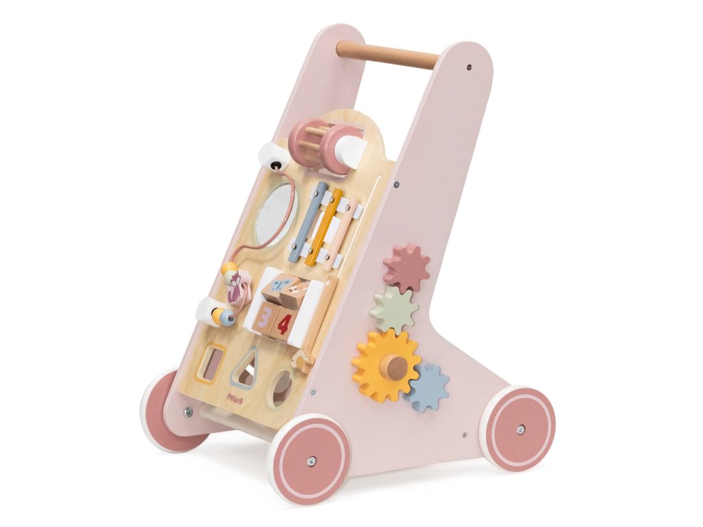 Ružový detský chodec od značkyPolarB je skvelá zábava a učenie v jednom! Ponúkainteraktívne aktivityako je pozeranie do zrkadla, otáčanie kociek, kotúľanie hrkálky, priraďovanie tvarov a hranie na činely. Vďaka tomu chodítkopovzbudzuje deti k prvým krokomčo je kľúčová fáza ich vývoja. Okrem toho je tupraktické skladovanieideálny pre vaše obľúbené hračky.