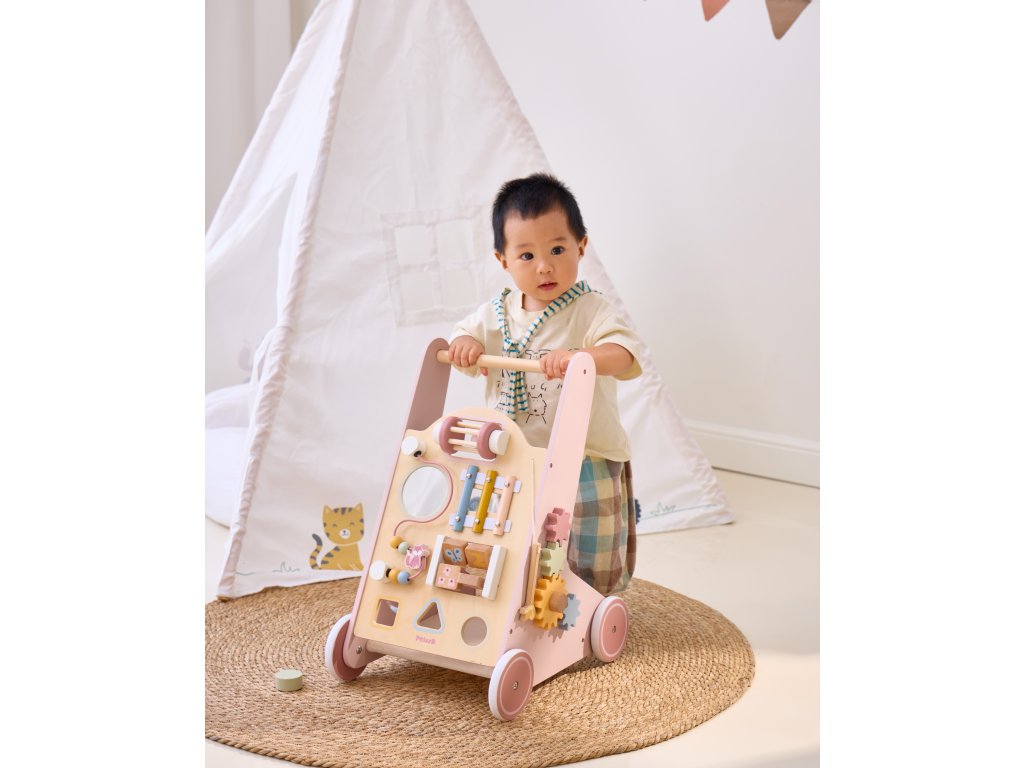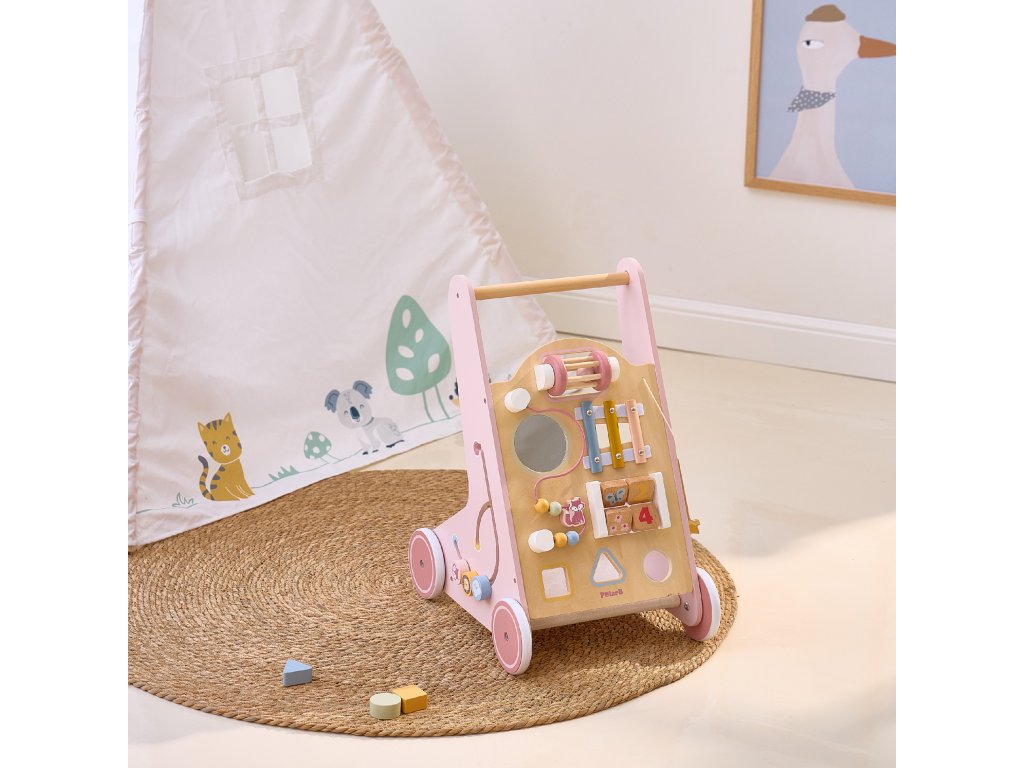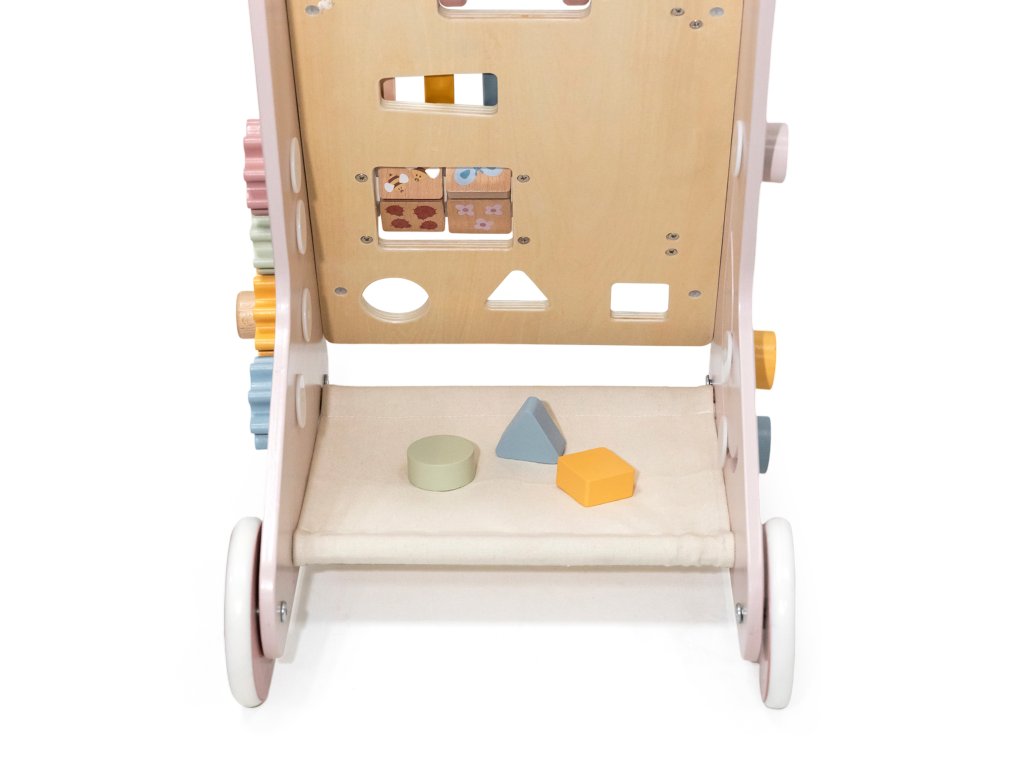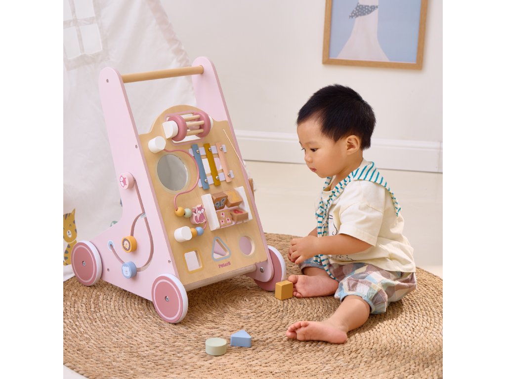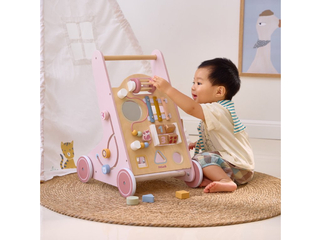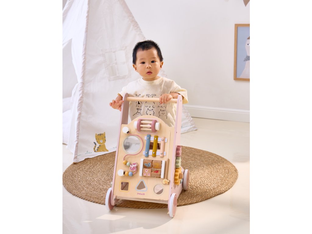 Ružový detský chodec od značkyPolarB je skvelá zábava a učenie v jednom! Ponúkainteraktívne aktivityako je pozeranie do zrkadla, otáčanie kociek, kotúľanie hrkálky, priraďovanie tvarov a hranie na činely. Vďaka tomu chodítkopovzbudzuje deti k prvým krokomčo je kľúčová fáza ich vývoja. Okrem toho je tupraktické skladovanieideálny pre vaše obľúbené hračky.