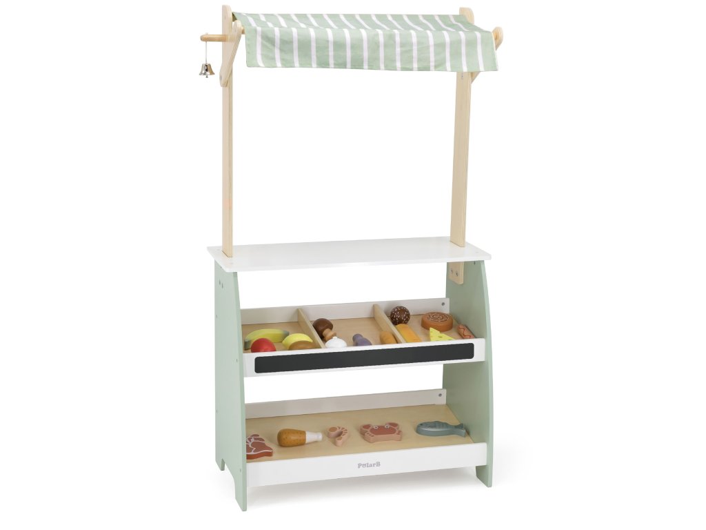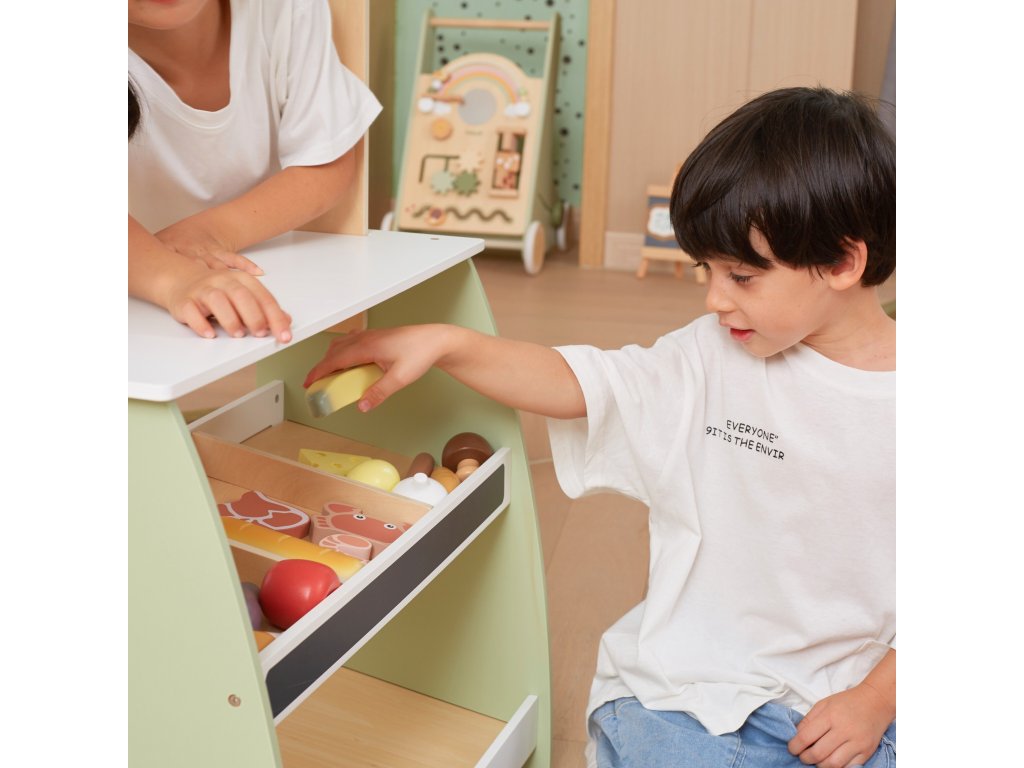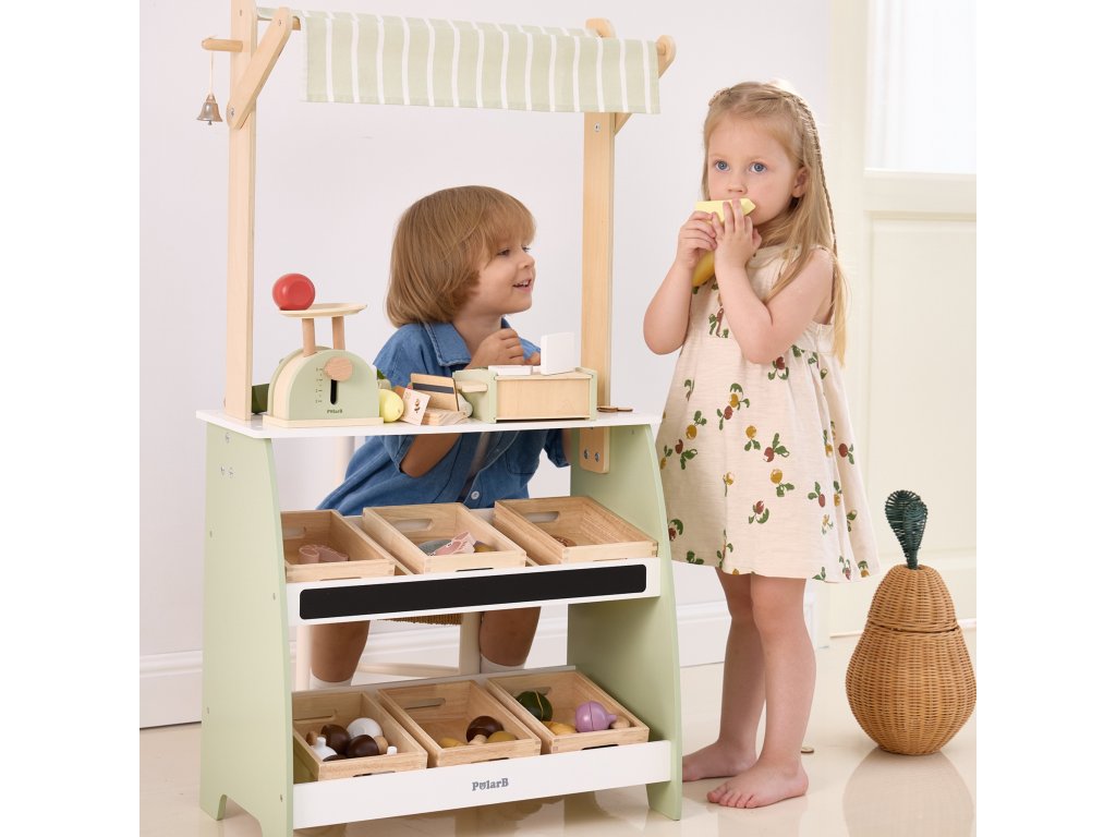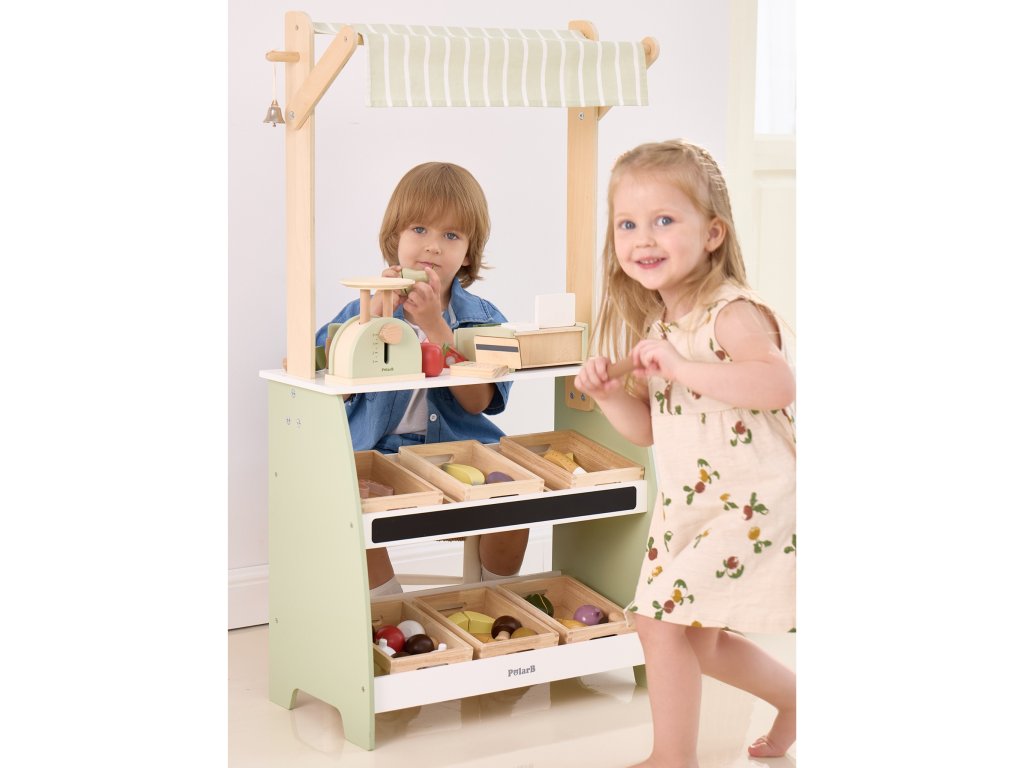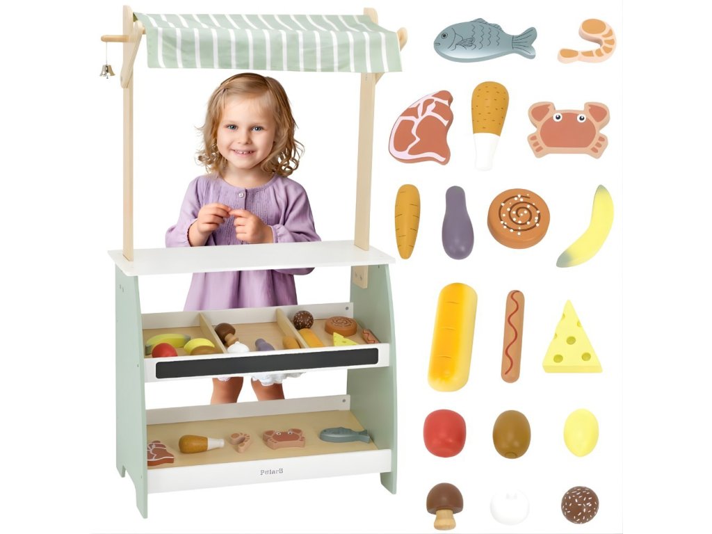 Výstavný stánok od značkyViga, je skvelý pre malých objaviteľov a kreatívne deti! Drevený stánok v pastelových farbách upúta pozornosť a od prvej chvíle podnecuje k hre. Vďaka svojej robustnej konštrukcii je ideálny na hranie rolí - od predavača po zákazníka,rozvoj úsmev azručnosti batoľa. Obsahuje tabuľu a malý zvončekzábava ešte nikdy nebola taká realistická! Nie je to len hračka, ale priestor na učenie sa počítať, rozprávať sa a spolupracovať s rovesníkmi.
