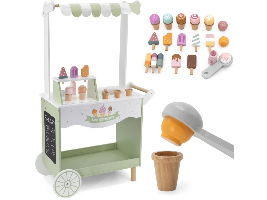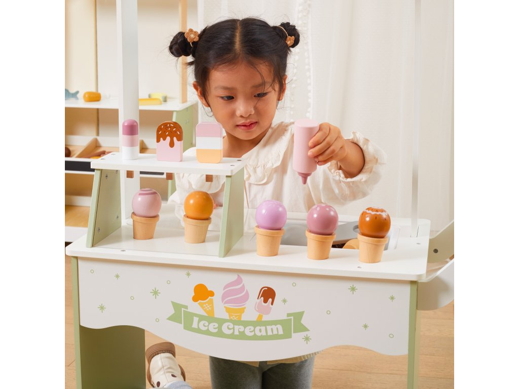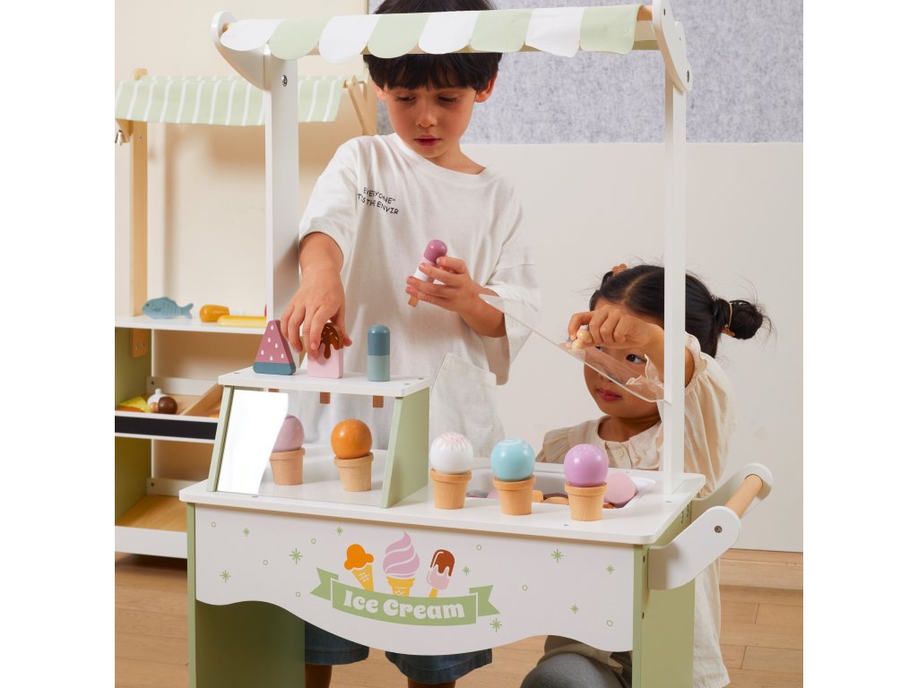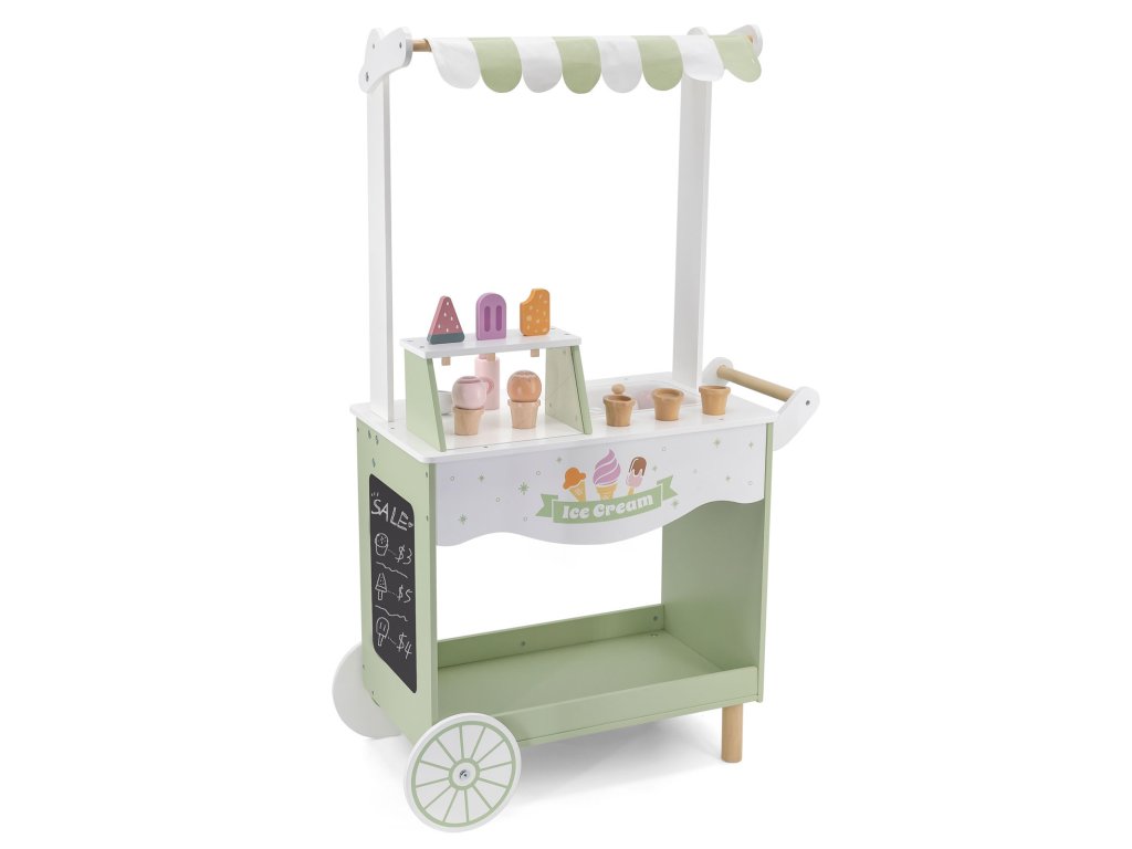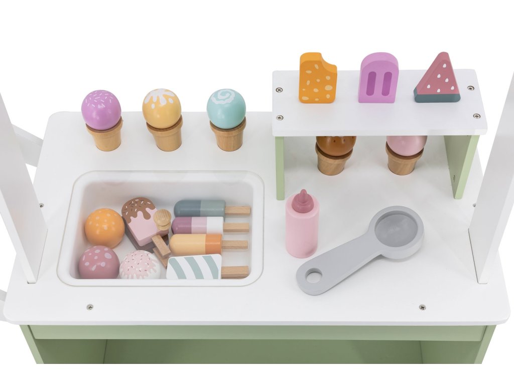 Veľký drevený stánok na zmrzlinu od značkyViga je vybavená nádherne vyrobenýmzmrzlina, kornúty, zmrzlina na paličkea dokonca aj vmagnetická lyžica na aplikáciu zmrzlinapre ešte realistickejšiu hru na malého predavača zmrzliny. Zmrzlinové kopčeky sa dajú ľubovoľne aplikovať pomocou magnetickej lyžičky. Na bočnom paneli nájdetetabuľakde je možné menu uložiť. V spodnej časti vozíka nájdeteodkladacia polica.Vďaka priloženým kolieskam sa ľahko presúva z miesta na miesto. S touto sadou môžu deti rozvíjať svojepredstavivosť, sociálne a jazykové zručnosti.