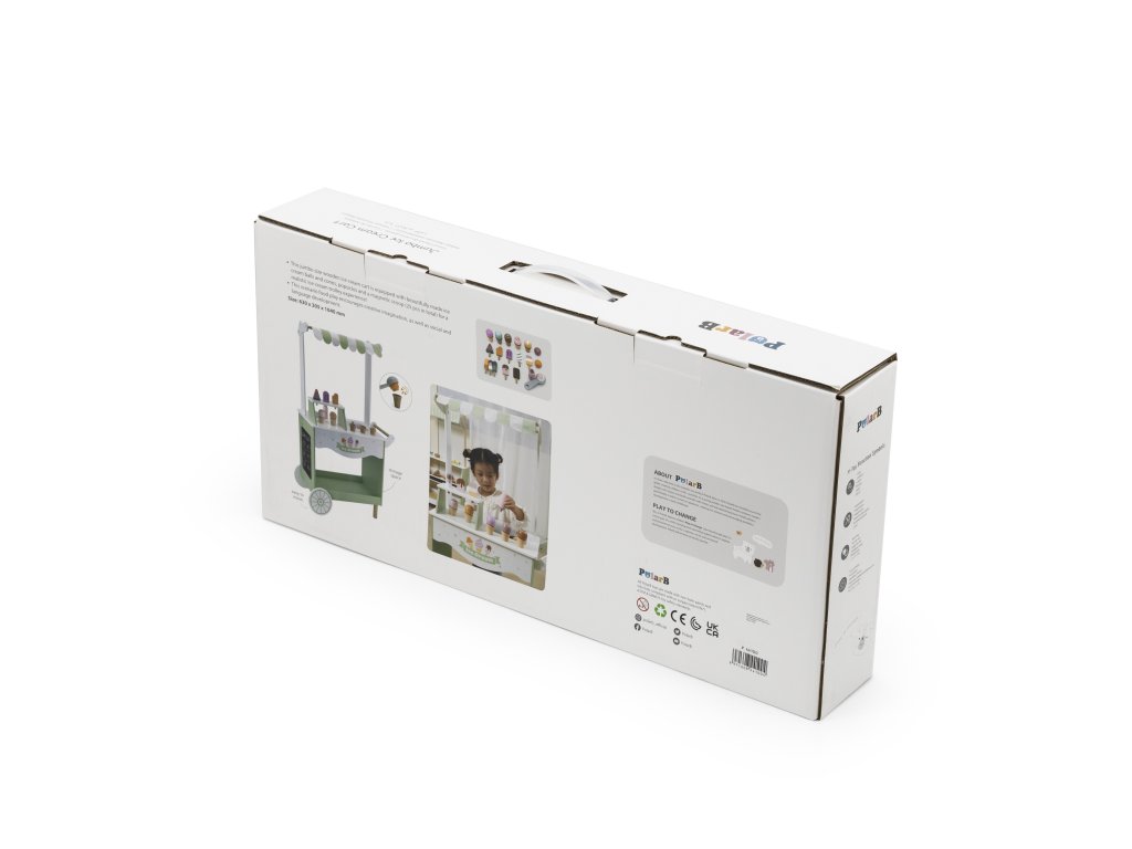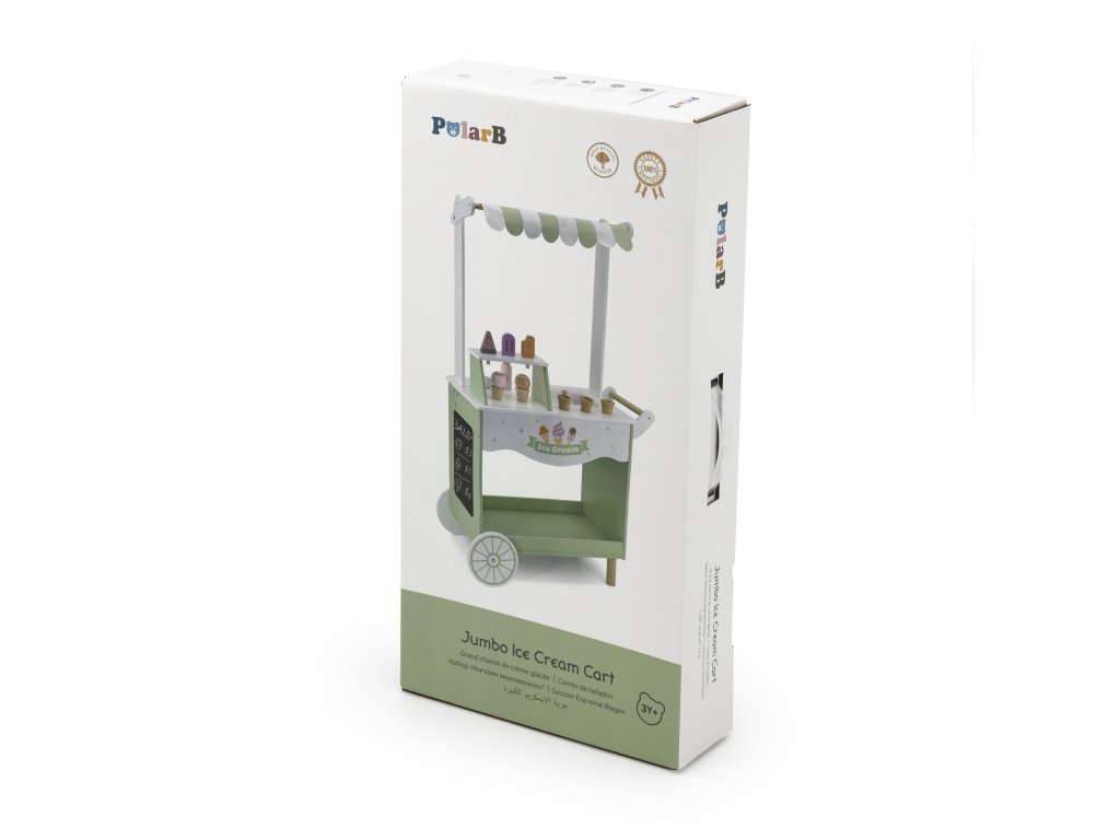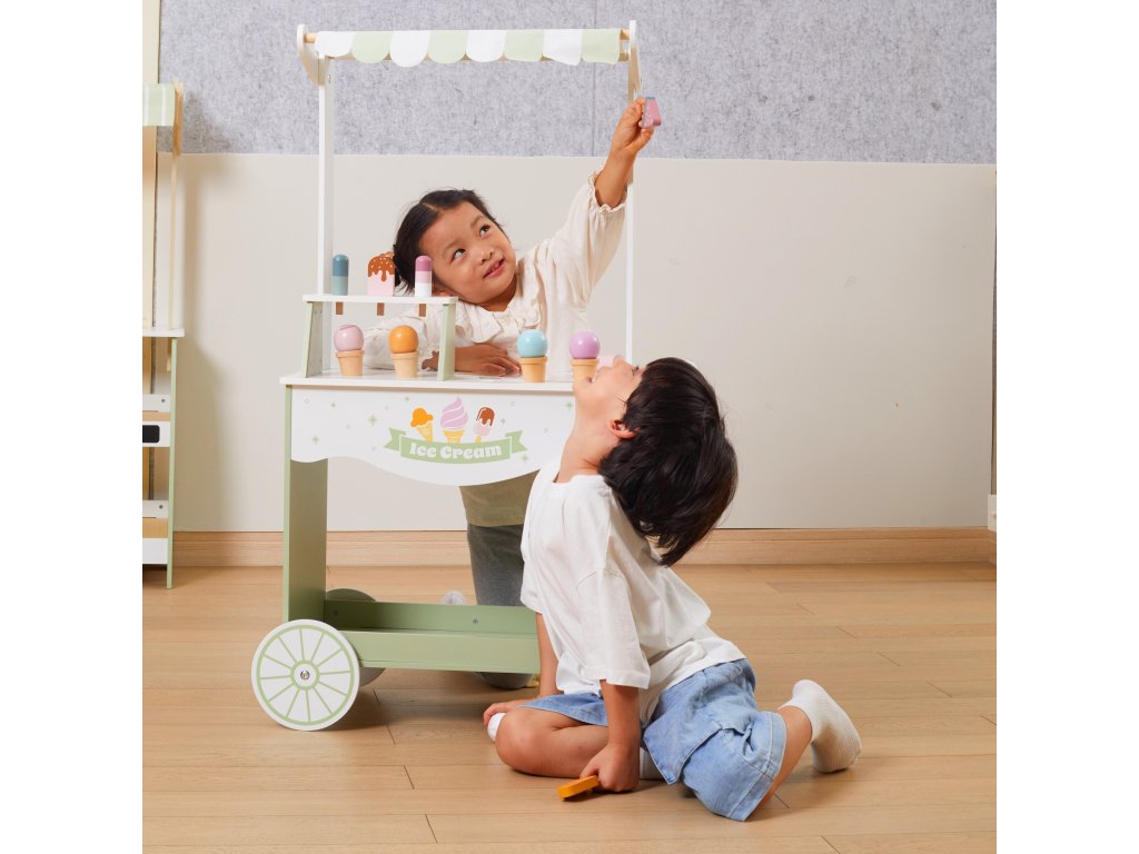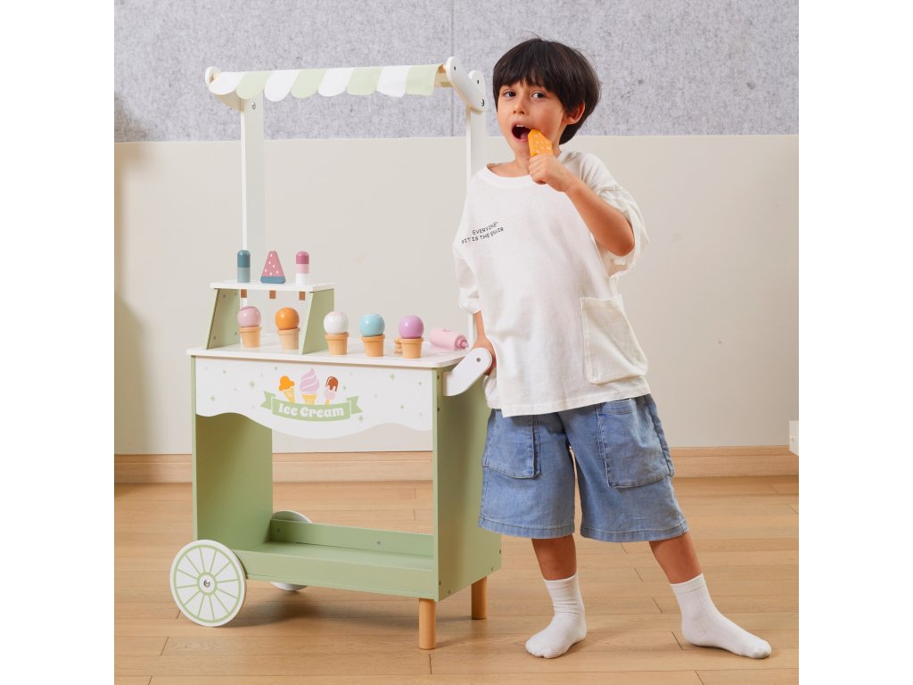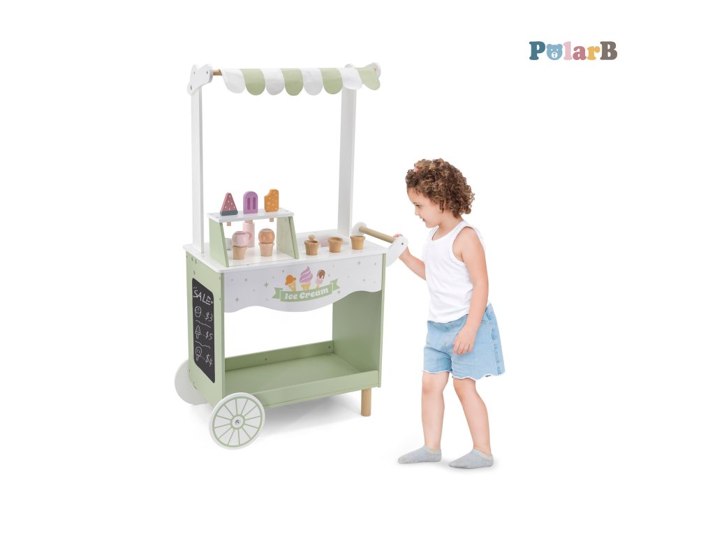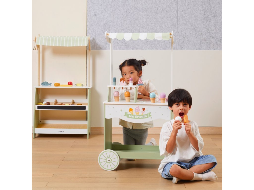 Veľký drevený stánok na zmrzlinu od značkyViga je vybavená nádherne vyrobenýmzmrzlina, kornúty, zmrzlina na paličkea dokonca aj vmagnetická lyžica na aplikáciu zmrzlinapre ešte realistickejšiu hru na malého predavača zmrzliny. Zmrzlinové kopčeky sa dajú ľubovoľne aplikovať pomocou magnetickej lyžičky. Na bočnom paneli nájdetetabuľakde je možné menu uložiť. V spodnej časti vozíka nájdeteodkladacia polica.Vďaka priloženým kolieskam sa ľahko presúva z miesta na miesto. S touto sadou môžu deti rozvíjať svojepredstavivosť, sociálne a jazykové zručnosti.